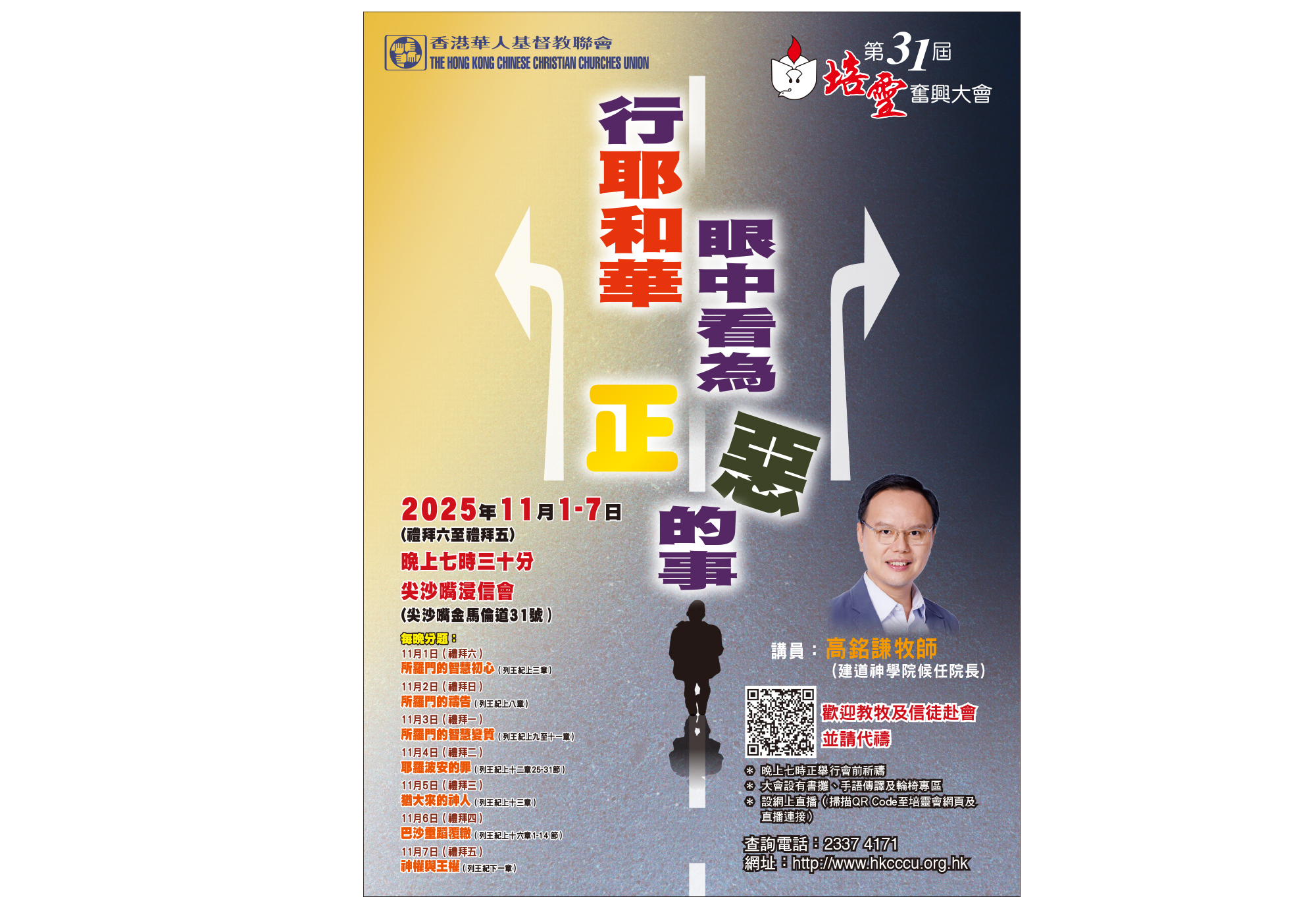 香港華人基督教聯會每年均舉辦培靈奮興大會,旨在造就教牧同工及信徒之靈命。本年「第31屆培靈奮興大會」將於11月1至7日(禮拜六至五),晚上7時30分假尖沙嘴浸信會(尖沙嘴金馬倫道31號)舉行。今屆主題信息為「行耶和華眼中看為正/惡的事」,由建道神學院候任院長高銘謙牧師主講,從列王紀之歷史記載,窺看眾列王於上帝眼中的評價,以致提醒信徒反思生命中的抉擇。