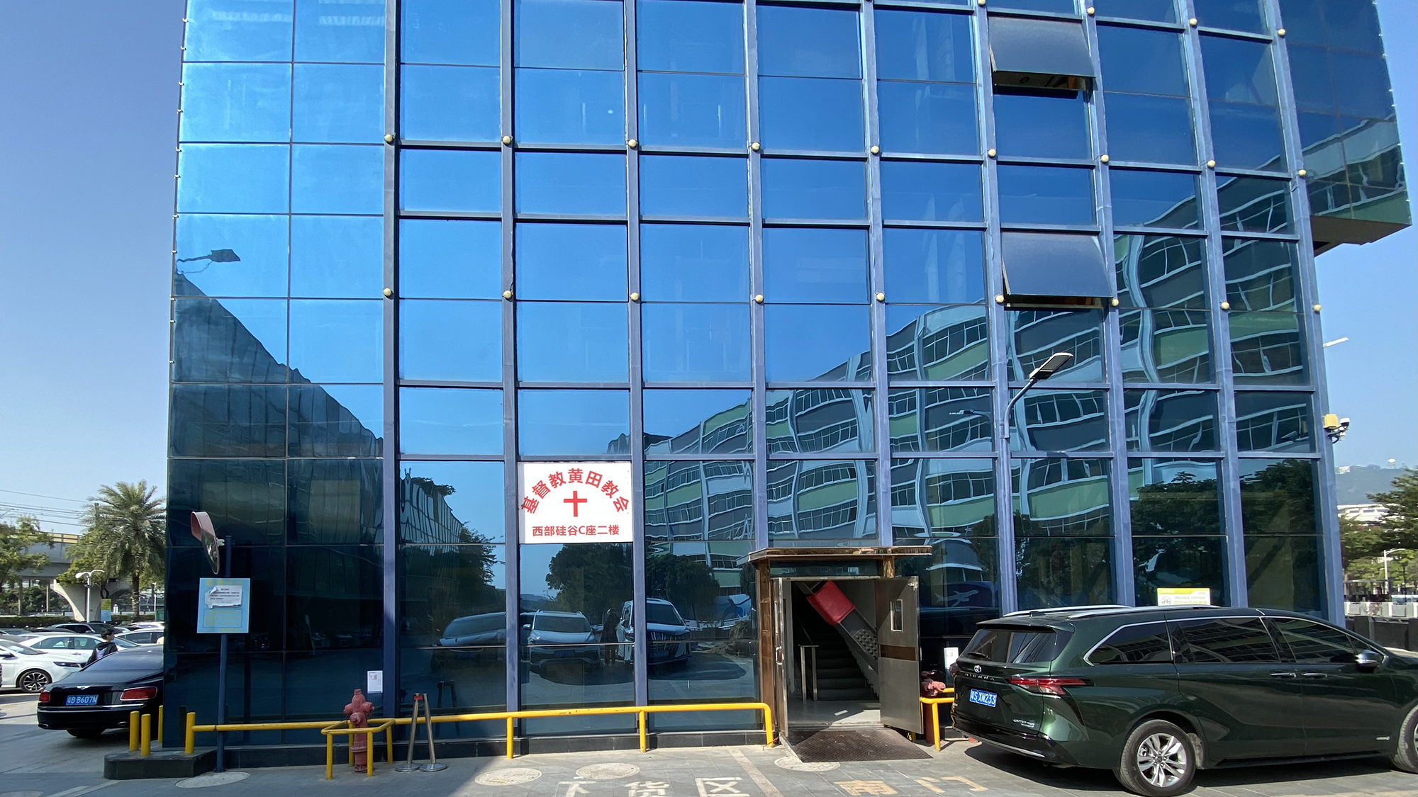 走上后瑞站A出口地面,旁邊是寶安大道。沿着這條大道走大概十分鐘步程,來到一棟滿屏玻璃幕牆的大型樓宇複合體,名為深圳西部硅谷;即是我們慣稱的矽谷。罕見的設計:走到這棟大型且新型的複合大樓的邊旁側面,才找到那一小爿絕不相稱的、面積極細小的升降機大堂。有趣的是,在升降機大堂入口外面的大樓玻璃幕牆上,掛貼着一個白底紅字的奪目招牌:「基督教黃田教會」。