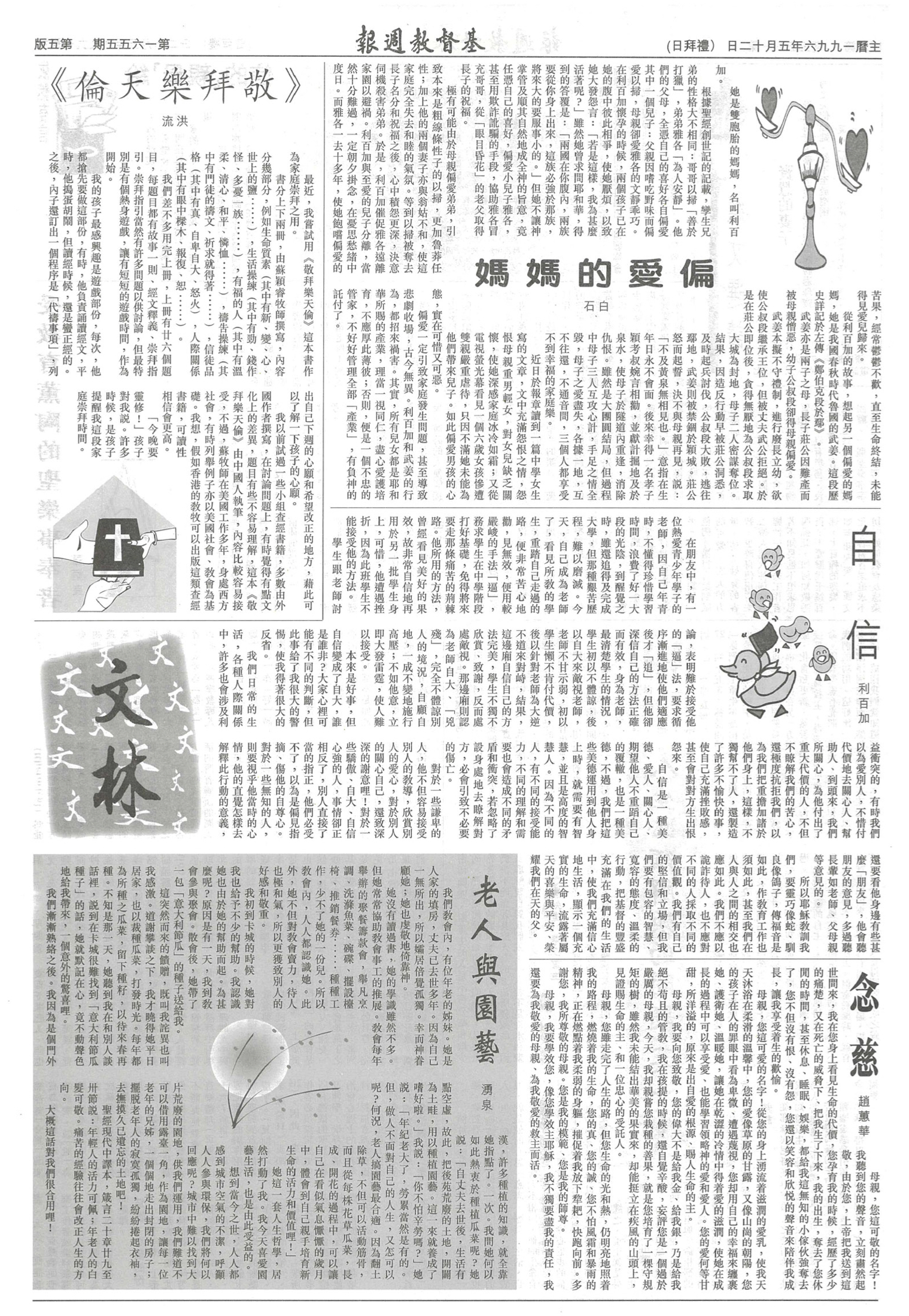 偏愛的媽媽 第 1655 期(1996 年 5 月 12 日) ◎ 文林 ◎ 白石 分享: A A 簡 內容刊載於《基督教週報》1996年第1655期第5版揭頁版可點擊以下網址瀏覽:https://christianweekly.net/1996/19960512/19960512.html