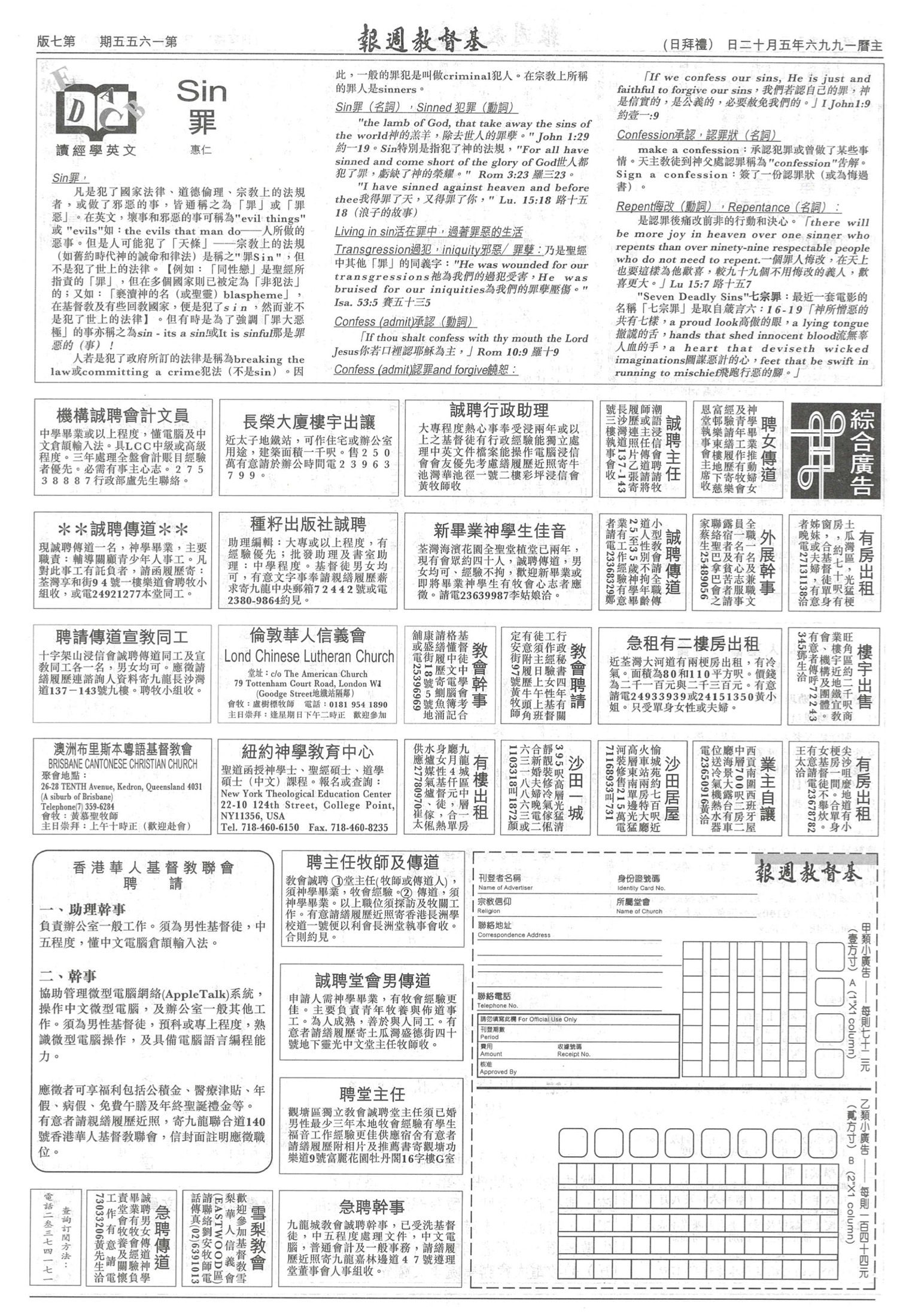 Sin罪 第 1655 期(1996 年 5 月 12 日) ◎ 讀經學英文 ◎ 惠仁 分享: A A 簡 內容刊載於《基督教週報》1996年第1655期第7版揭頁版可點擊以下網址瀏覽:https://christianweekly.net/1996/19960512/19960512.html
