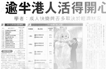 「人際關係是港人快樂與否的關鍵因素,這對學生尤為重要。與父母關係不和的中、小學生中,分別有八成及十成均表示自己生活得不快樂。在成年人的世界......家庭關係亦是重要因素之一。有九成和配偶關係不和的受訪者表示他們不開心。」(《明報》23.10.2000)