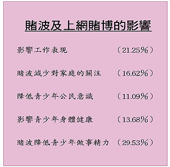 結果又顯示賭波對青少年各方面均造成不良的影響,其中對不受賭風影響而違法的信念低三成九。此外,可能由於通宵達旦地觀看外地轉播之球賽,經常參與賭波的青少年身體健康出現不良影響,故此亦有礙他們的學習、工作與做事的精力。