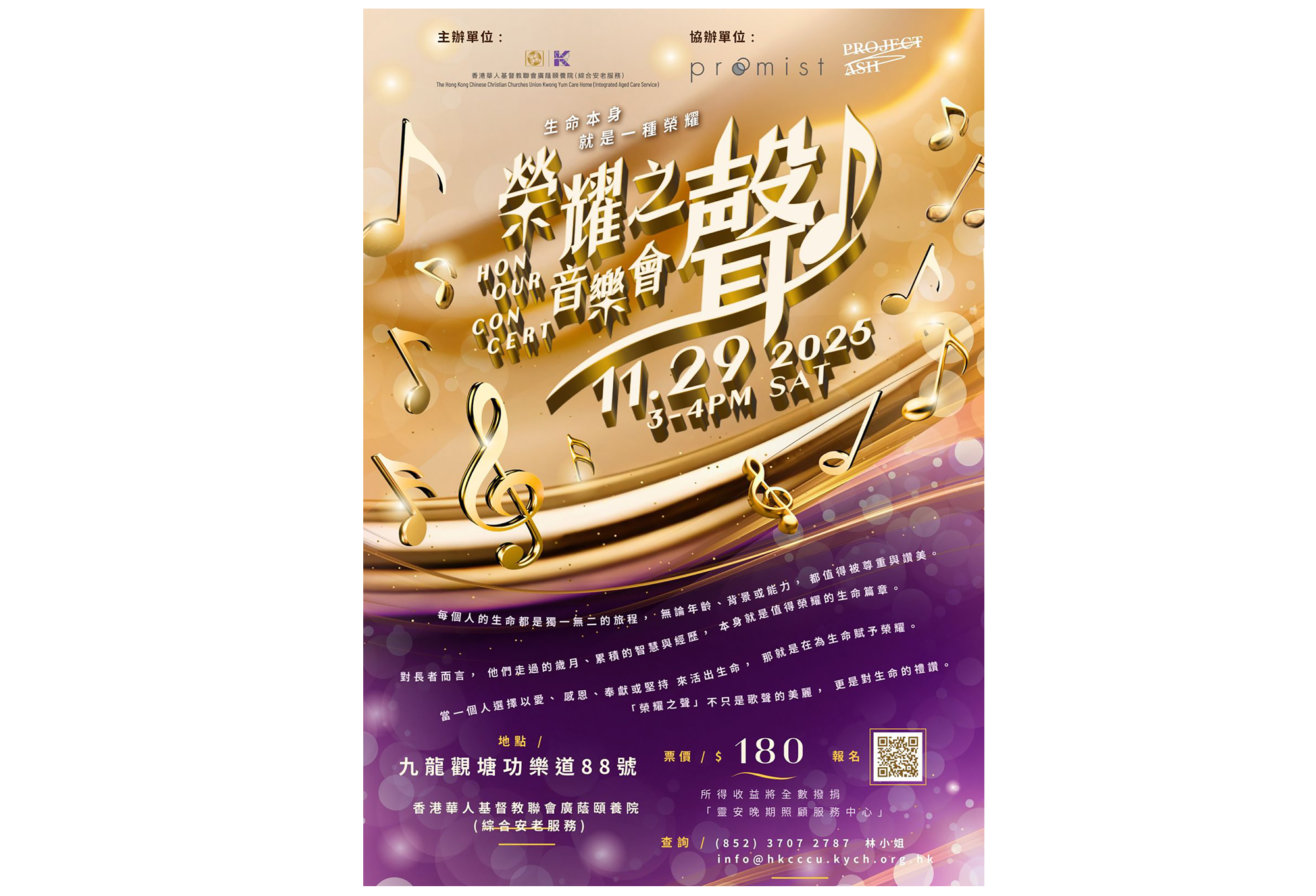 香港華人基督教聯會廣蔭頤養院(綜合安老服務)將於11月29日(禮拜六)下午3時至4時,與合唱團 Promist在該院(九龍觀塘功樂道88號)舉行「榮耀之聲音樂會2025」,主題為「生命恩典」——一場用歌聲讚美生命的音樂會,一次跨代共融的深刻連結。內容包括:由長者與社區參加者攜手合唱,頌讚生命與信仰;Promist現場演出;跨代交流、彼此連結,感受音樂的療癒與盼望。活動所得收益將全數撥捐香港華人基督教聯會廣蔭頤養院(綜合安老服務)「靈安晚期照顧服務中心」,為經濟有困難的末期病患長者提供住宿及靈安護理服務。報名及門票費用可瀏覽:https://forms.gle/Zt4xPW88cbj1XehF8;查詢可電3707-2778 社工嚴先生。