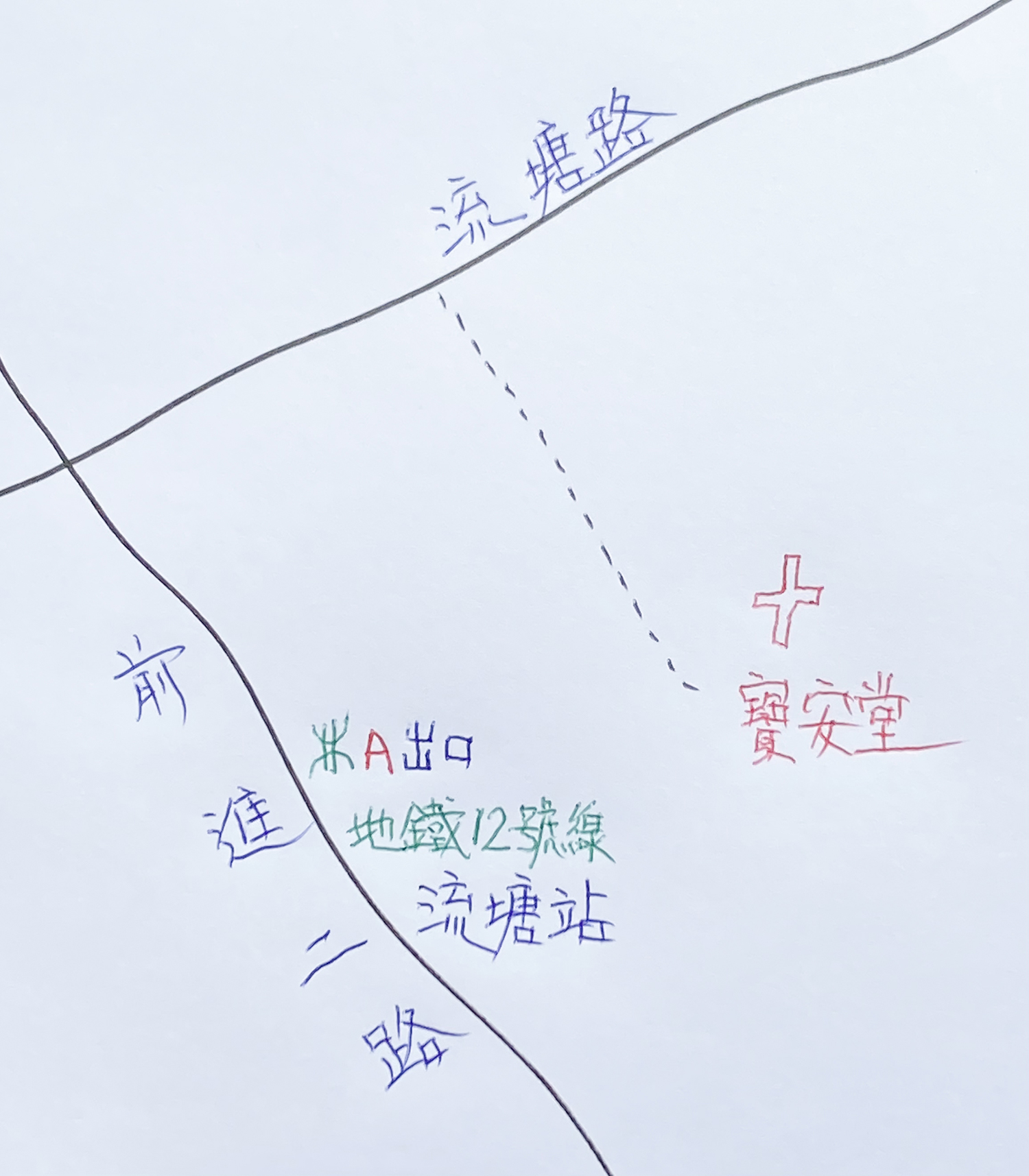 走上流塘站 A出口地面,旁邊是前進二路,轉到側旁的流塘路去,走不到兩分鐘,留意行人路旁的樓宇之間、有一條不起眼卻頗寬闊的通道;走入其間,首先可見一個露天停車場的閘欄,然而步過這處閘欄繼續前行,眼前竟是另一片天地,其中包含一座壯麗的基督教寶安堂。