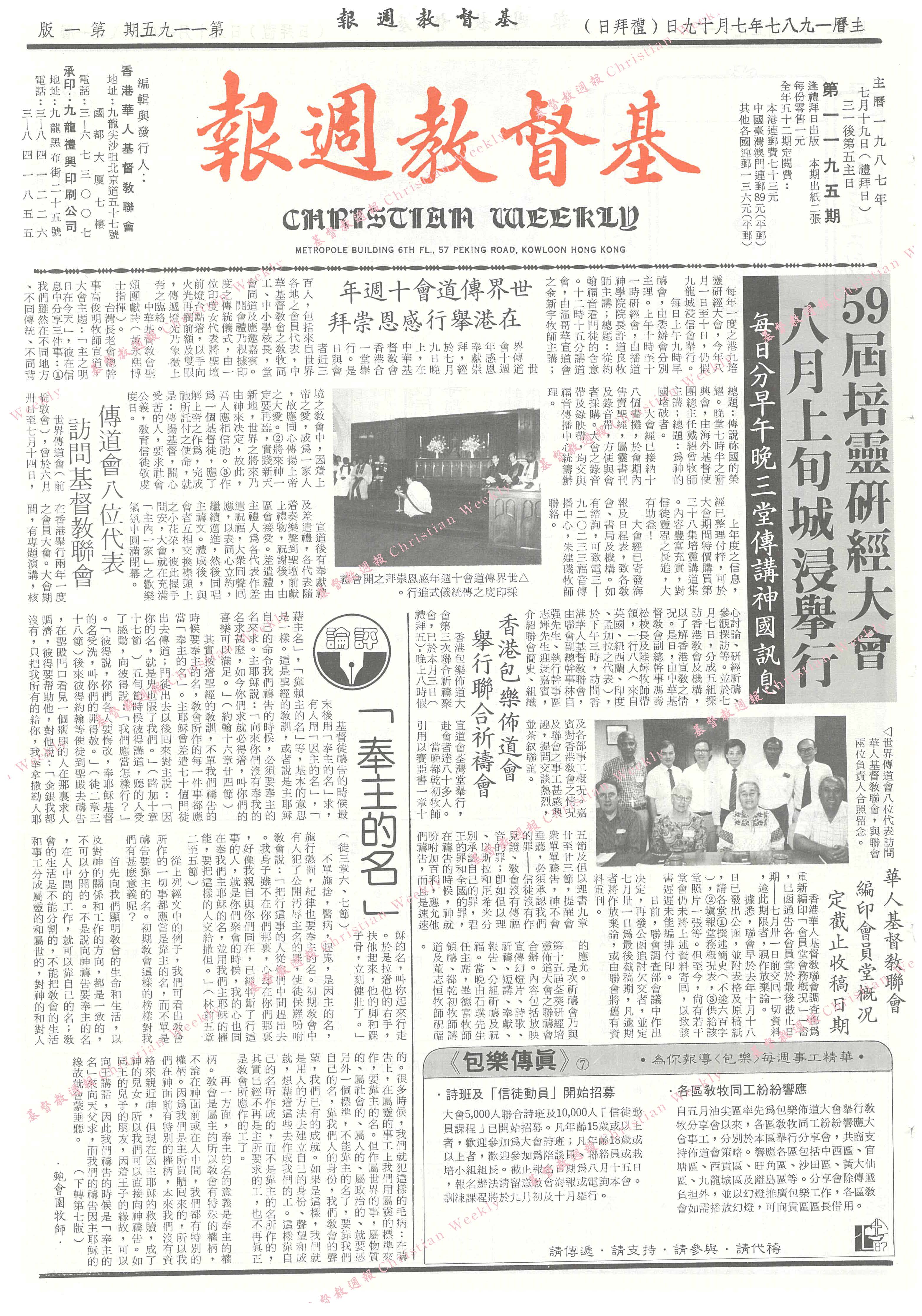 每年一度之港九培靈研經大會,今年八月一日至十日,仍假九龍城浸信會舉行。每日上午九時早禱會,由委辦會分別主理。上午十時至十一時研經會,由播道神學院院長許道良牧師主講;總題:從約翰福音看門徒的含意。十二時十五分講道會,由溫哥華宣道會之金新宇牧師主講;總題:傳說祢國的榮耀。晚堂七時半之奮與會,由海外基督使團總主任戴紹會牧師主講;總題:為神的國堵破者。大會經已接納十八個書攤,於會期內售賣聖經,屬靈書刊及錄音帶,方便與會者採購。大會之錄音帶及錄映帶,均交與福音傳播中心統籌辦理。