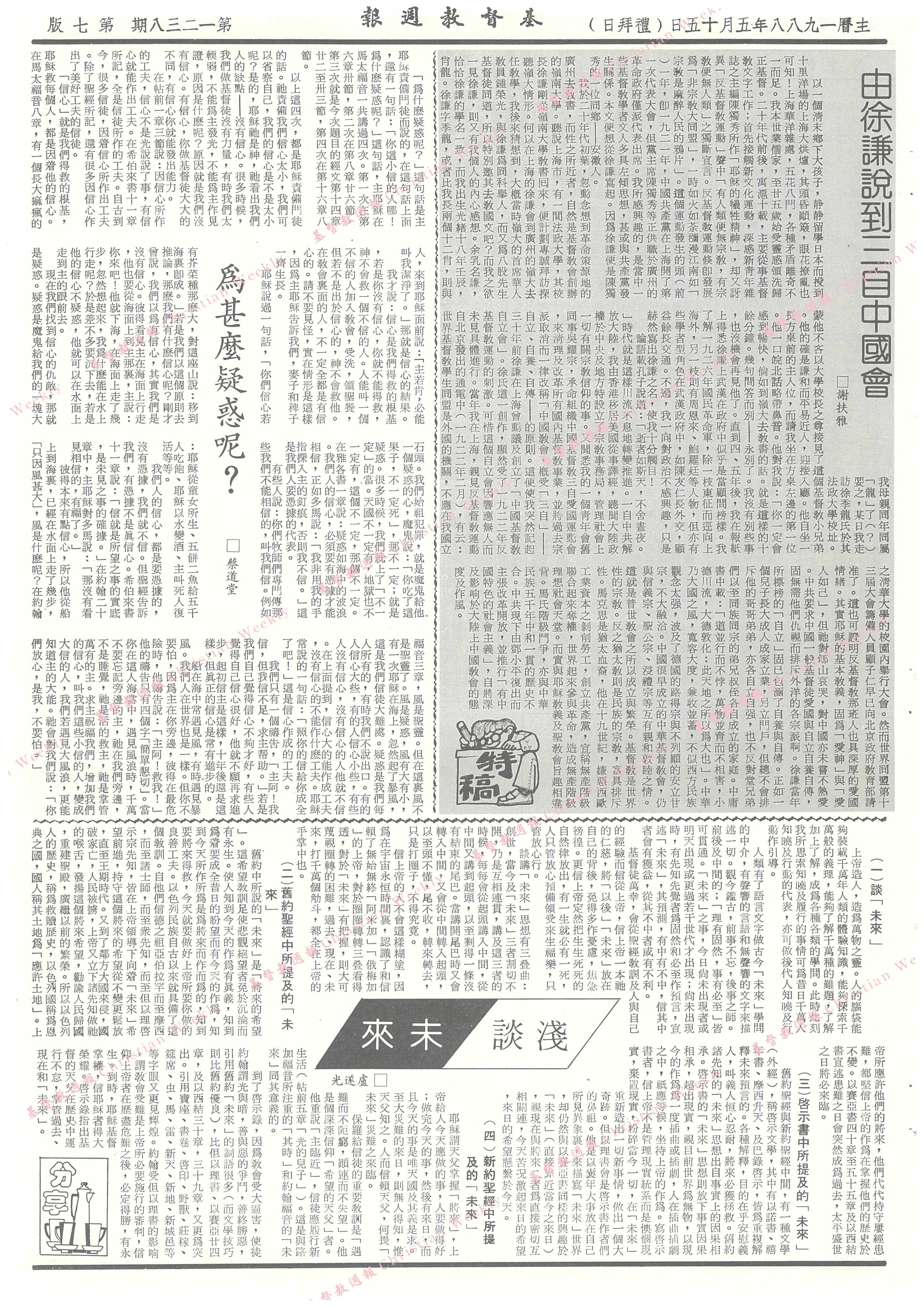 論語載孔子說道:「逝者如斯天,不舍晝夜。」時代就是這樣川流不息地轉變推進。一自中共解放大陸,我由香港移居美國從事譯經,聽聞大陸政權於中央及地方特設立了宗教事務局,管理社會上一切有關宗教信仰的事。又聞悉我的一個青年會舊同事吳耀宗,承命組織中國基督教三自愛國運動會來清理及改革所有國內基督教事業,並將過去宗派取消而一律改稱「中國教會,概受「三自」自立、自養、自傳——的原則。這便使我突然記起三十年前徐謙在上海會動議及創立了「中國基督教自立會」。徐氏這一創作,顯然受了一九二二年反基督教運動的刺激。可惜這個自立會因響應無人而未見具體進行。當年我在上海,親見反基督教運動自北京發出的通電中(一九二二年二月),有云:世界基督教學生同盟是外國的機關,不應在我國立之清華大學的校園內舉行大會。然而世界同盟第十三屆大會籌備人員顧子仁早已向北京政府教育部請准了。這也可證明反基督教那班人也具深厚的愛國情緒。其實耶穌的基本教義,固為「愛神」與「愛人如己」,但祂對郇山哀哭,對中國亦未嘗不熱愛。中共要求中國一般基督徒愛國與自立自自傳,固無需他們仇視而排斥外洋的各宗派啊。徐謙當年所標榜的「自立」固已包涵了自養與自傳。正如一個兒子長大成人成家立業,另立門戶,但總不會排斥他的哥哥弟弟,亦各自立自强,也不反對堂兄弟們以至同族同宗的弟兄叔侄各自成立的家庭。中庸書中載:「道並行而不悖,萬物並育而不相害,小德川流,大德敦化:此天地之所以為大也」。中華乃大國之風,寬容大度,兼收並蓄,不似西方民族觀念太强,波及了德國的路得宗與不列顛的安立甘宗,不大融洽。中國很早成立的中華基督教會,仍與信義宗、聖公宗、浸禮宗等互有親和敦睦之情。這就是普世教會之所以成立與繁榮。基督教是世界性的宗教。反之猶太教則是民族的宗教,富具排斥性。馬克思是猶太血裔,他在十九世紀,嫌惡西歐工業資本之剝削勞工,創立共產黨,宣稱無產階級聯合起來奪權,世界起來參與革命,造成無產階級理想社會天堂。而實與耶穌教義及聖教會旨趣相違背。馬氏階級鬥爭,亦與中華民族五千年中和一貫的歷史不合。中共現下由鄧小平復出而主張改革開放,並推行「有中國特色的社會主義」,自將深及影响於大陸上中國教會的態度及作風。