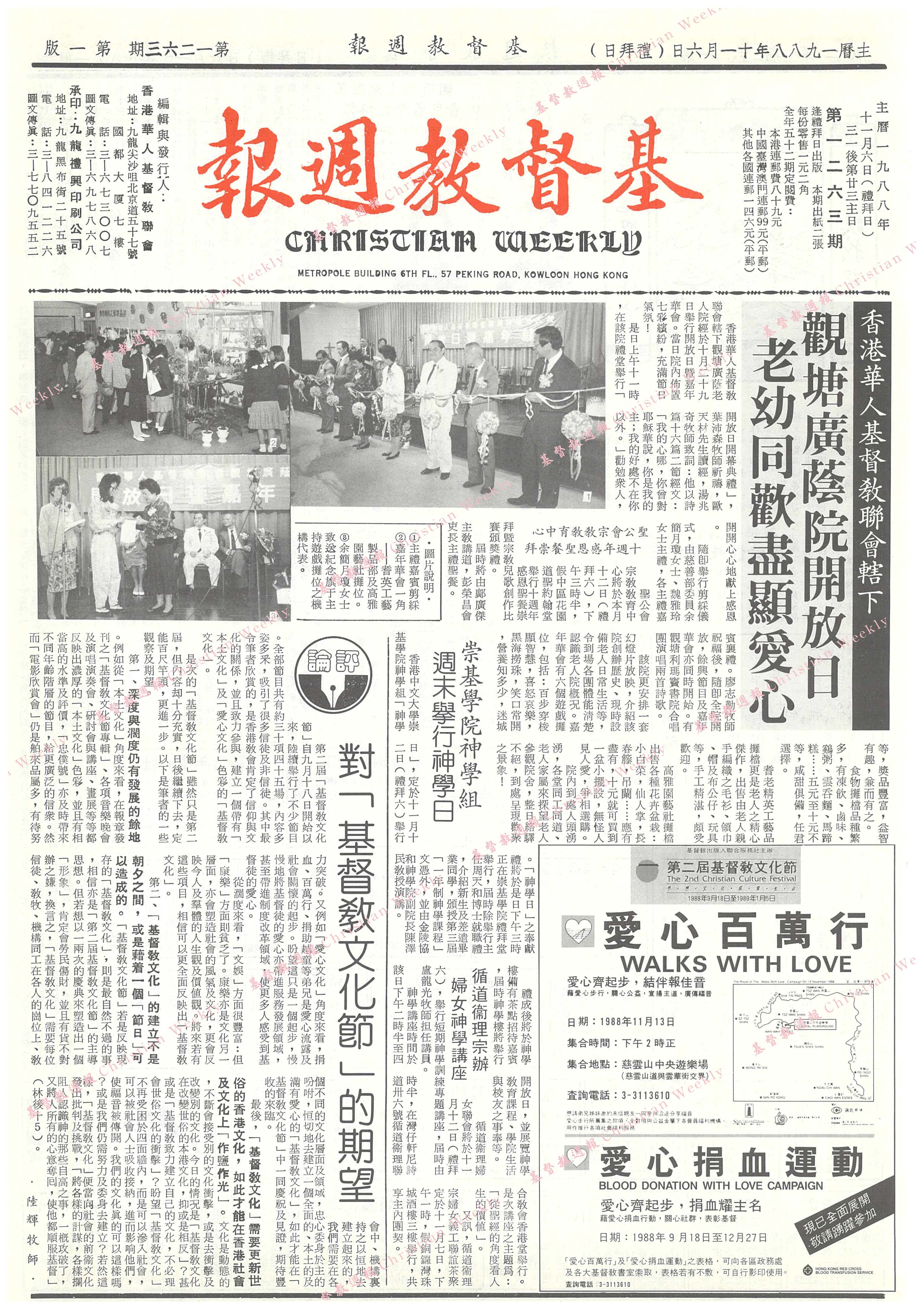 是日上午十一時,在該院禮堂舉行「開放日開幕典禮」,葉沛森牧師祈禱,歐天材先生讀經,湯兆奇牧師致詞:他以詩篇十六篇二節經文·「我的心哪,你會對耶穌華說,你是我的主;我的好處不在你以外。」勸勉衆人,開開心心地獻上感恩。