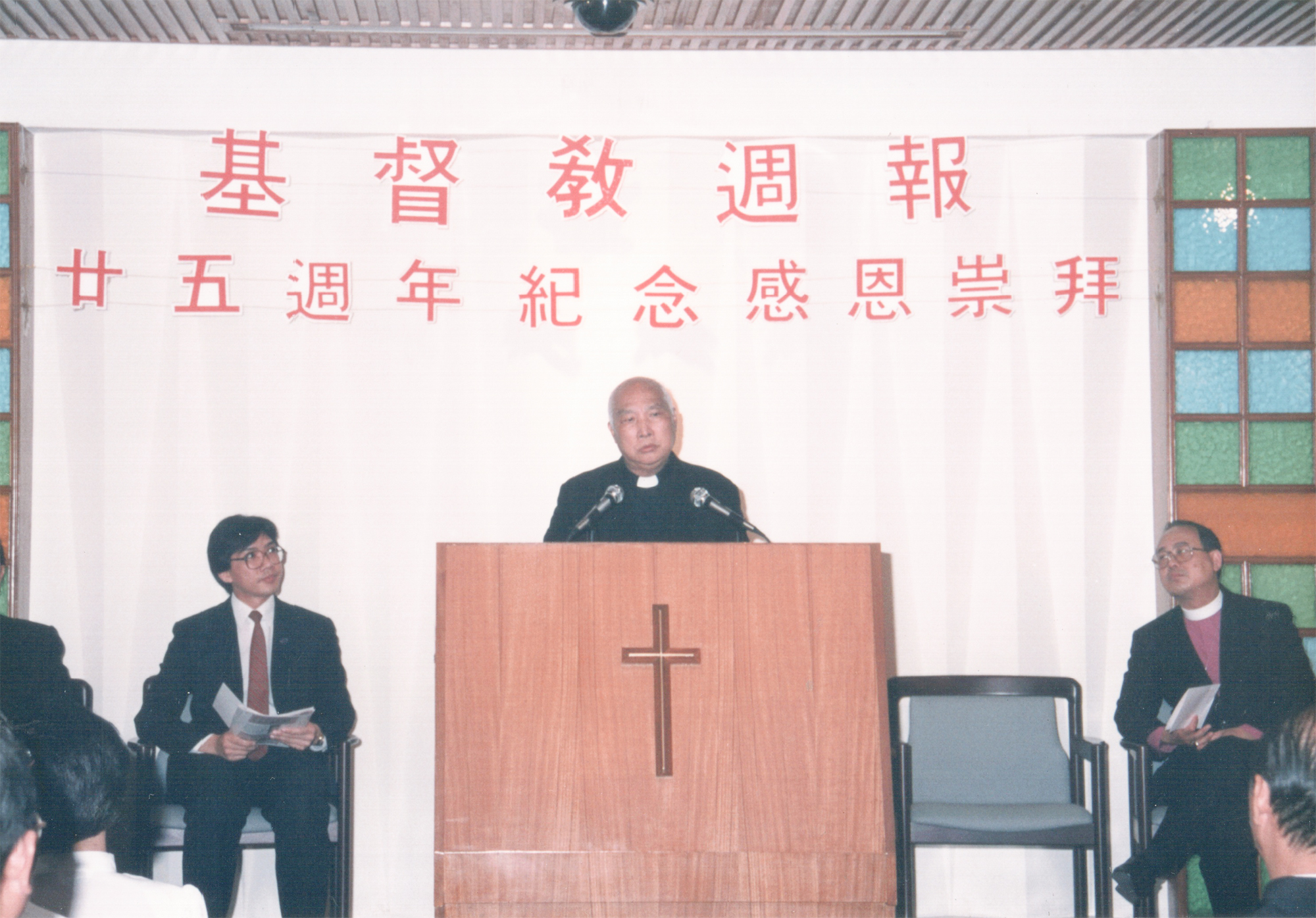 感恩崇拜儀式隆重,主席許朝英先生致詞說:感謝主,祂在不同之年代興起許多僕人利用文字來傳揚主之福音;更感謝主在廿五年前感動聯會同人創辦了基督教週報,報導基督教消息,培育基督徒靈性、宣揚基督教眞理。多年來,得到各教會同工同道的支持、撰稿、介紹、閱讀、參與⋯⋯許多人透過週報發表自己之心聲,各地的教會藉週報得以溝通,週報不但作教會的喉舌,也在社會中見證基督的大愛,廿五年來,扮演着重要角色。