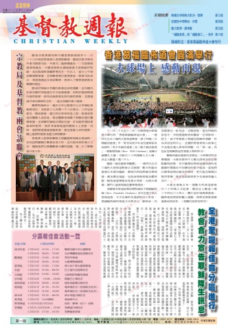 編輯及發行人:香港華人基督教聯會 督印人:陸幸泉 地址:九龍聯合道140號香港華人基督教聯會大樓二樓 電話:2337 4171 圖文傳真:2338 2314網址: http://ChristianWeekly.net 電子郵箱: [email protected] 承印: 穎生設計印刷公司 第一版 作者文責自負兩鐵合併與兩太對決·陸輝 第三版從饒恕中得釋放·丹雪 第四版腦力資源·譚偉豪 第五版「福臨香港」與「福臨香江」·浩然 第六版隨報附送:香港葛福臨佈道大會特刊香港葛福臨佈道會圓滿舉行大球場上 感動再現十一月二十九至十二月二日假香港大球場盛大舉行的「香港葛福臨佈道大會」,一連四天合共六場的大型佈道聚會。除了四場 ﹁公開福音盛會 ﹂外,更有為青少年及兒童與家長而設的 ﹁青少年福音盛會 ﹂及 ﹁親子福音盛會﹂,葛衛理牧師 ︵Rev. Will Graham ︶及陳以誠醫生主講。共吸引三十四萬總人次入場,決志人數逾三萬三千人。隨 ﹁福音盛會奉獻禮 ﹂,一連四天合共六場的大型佈道聚會正式展開。數天的福音盛會以本港為樞紐,藉現代科技將福音傳到港、澳及鄰近地區,包括南華會球場及體育館、跑馬地遊樂場及馬會公眾席、元朗大球場,澳門八區更現場直播聚會情況。美國著名佈道家葛培理牧師長子葛福臨牧師 ︵Rev. Franklin Graham ︶首次在港主領大型佈道會,不少在場的本港教牧同工形容,葛福臨牧師的佈道方式與其父一脈相承,內容踏實且一針見血、言簡意賅。他在四晚的信息中,分別透過稅吏長撒該、尼哥底母、財主、浪子等聖經人物遇見耶穌的事蹟,作為其信息的中心,並擅於將會眾投入故事之中及提出發人深省的問題,以「第一身」角色反思耶穌對這些聖經人物的呼召。數晚的福音盛會均安排近一小時精采的音樂環節,大會安排四千人聯合詩班及管弦樂隊獻唱詩歌。其中隨葛培理佈道團來港的美國鄉村樂隊由不同膚色的歌手組成,當他們以廣東話唱出福音詩歌時,更引起全場報以熱烈掌聲;接強勁節奏更令全場會眾融入其中。大會在會後公布一連數天的佈道會吸引三十四萬人次赴會,總決志人數達三萬三千四百六十四人。轉介員於每晚聚會後,隨即連夜將資料輸入電腦,即將安排教會跟進栽培初信者。(相關內容詳見特刊)宗教局及基督教兩會訪聯會 國家宗教事務局與中國基督教兩會於十一月二十八日到訪香港華人基督教聯會,國家宗教事務局外事司郭偉司長、外事司二處薛慧處長、二司基督教處郭琦處長;中國基督教全國兩會副主席鄧福村牧師、及出版部幹事顧夢飛先生一行五人,當日上午到訪聯會辦事處,並與聯會執行董事會面。郭偉司長表示,希望透過這次到訪聯會,更深入了解香港教會及機構的情況。鄧福村牧師分享國內教會近況時透露,近年國內教會在鄉村等地進行不少社會服務,同時亦應該開發內地的資源,使用沿海教會支持內地的教會,並透過海外弟兄姊妹的合作,一起支持國內事工發展。據鄧牧師表示,過去五年已經進行七百多個社會服務項目,並投放了人民幣三千六百萬元,工作包括救災、幫助教會、建立四百多所的老人院,教會安排退休醫療人員信徒,乘坐醫療車到鄉下對農民進行醫療救援,並到鄉村協助自閉症兒童,亦為提供預防愛滋病的教育,使許多落後地區的窮困人士受惠。同時,他們期望透過基層教會,接近基層人民的需要,關心他們的需要及建立深厚關係。香港華人基督教聯會主席龐建新牧師在會面時,亦向訪問團簡介聯會各項工作,並介紹未來的事工方向,隨後他們又參觀聯會大樓的設施,進一步了解聯會日常工作。教會合力宣告耶穌降生訊息全港聖誕報佳音分區進行香港華人基督教聯會降生﹂的信息傳開。目,一同將﹁耶穌為萬民景、話劇或其他表演節地,透過聖誕歌曲、聖商場或在屋苑的表演場車、巴士或各區域的大型將參與協辦,屆時乘坐電本港近百個教會及機構港分區聖誕報佳音活動,萬民樂繽紛﹂二零零七全多區舉辦﹁耶穌已降生、至二十六日期間,在本港傳道部將於十二月十五日負責統籌是次活動的精彩的節目。聖誕節的訊息和目,為市民帶來奏、話劇等節舞蹈、樂器獻福音粵曲、中西獻唱聖誕歌曲、的節目,包括有表演將安排豐富嘉年華。各區的舉行各類表演及人流較多的地點及市中心一帶,於區內購物商場音,其他區域則到區內巡迴報佳深水區將會走內、油尖旺區及及巴士巡迴區及北區分別租用開篷巴士將以電車報佳音、沙田區會機構參與。當中港島區附圖︶,合共近一百間教分十二個區域進行︵詳見港分區聖誕報佳音活動共周寶熙牧師透露,今年全為了讓市民掛帥的聖誕文化能在狂歡及物質不同的社區。聖誕節的真正意義實踐到良朋分享基督教信仰,將穌基督降生的日子與摯好的節目,透過這個慶祝耶同親友到場欣賞各場精采會鼓勵信徒把握機會,帶福音的好機會;故此,大誕佳節,同時亦是一個傳民分享一個歡樂繽紛的聖是次活動不單是與香港市慶祝聖誕活動。大會表示教聯會今年再次舉辦聯合信息,因此香港華人基督下,重申基督耶穌降世的據悉,過去舉行的分色。聯會亦希望透過聖誕動均有不同區域的地方特排,期望每區的報佳音活足的空間讓地區教會安籌及支援的角色,給予充區報佳音,聯會均擔任統地區推動福音事工。教會能彼此認識,同心在報佳音活動,使各區不同為有效地推動各區教︵深水區︶。︵元朗區︶、黃昌發牧師︵荃灣區︶、李一新