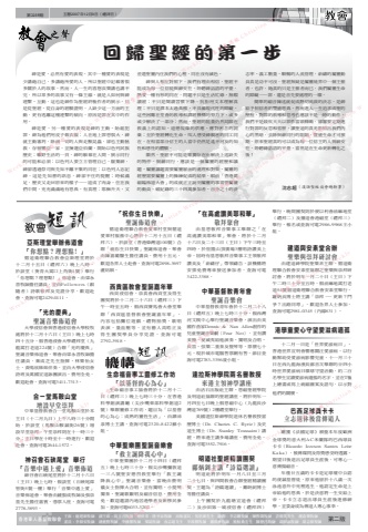 第2259期 主曆2007年12月9日(禮拜日)香港華人基督教聯會 第二版 主席:龐建新牧師 副主席:區玉君牧師 總幹事:陸幸泉牧師 出版部長:吳思源先生 顧問:李志剛牧師 陳黔開牧師 許朝英先生 鍾嘉樂牧師委員:李仰安牧師 鍾健楷牧師 李國權牧師 梁銘牧師 沈志超先生 李鴻標牧師 鄺偉衡牧師 植燊先生 陳德昌牧師 胡明添牧師 胡志偉牧師 沈志超(漢語聖經協會總幹事)神是愛,必然有愛的表現。其中一種愛的表現是少講祂自己,多講祂所愛的人,所以聖經中記載著很多關於人的故事。然而,人一生的喜怒哀樂講也講不完,所以眾多的故事又有一條主線,就是人如何與神連繫、互動,這也是神作為聖經終極作者的展示。只是從聖經、從自身的經驗證明,人缺少這一方面的主動,更有逃離這種連繫的傾向,原因是罪在其中的作用。神是愛,另一種愛的表現是神的主動。始祖犯罪,神為他們用皮子做衣服;人在地上罪惡很大,神就主動審判,除滅一切的人與走獸昆蟲,卻也主動拯救,存留挪亞一家,並揀選亞伯蘭,開始以色列民族歷史;曠野生活的一頁,神的帳幕在人間,展示同行的可能和必須;以色列人要立王管理自己、厭棄神,神卻透過祭司與先知不離不棄的同在;以色列人忘記神,這是先知書的訊息,神卻不住的提醒;時候滿足,歷史又走回原來的樣子—道成了肉身,住在我們中間,充充滿滿地有恩典、有真理;耶穌升天,又差遣聖靈內住我們的心裡,同在沒有減色。神與人相互對照下,我們有理由相信,聖經不能成為每一位信徒與神交往、聆聽神話語的平臺,熱愛一種有形的同在,問題不只是生活忙碌,無暇讀經;不只是閱讀習慣下降,抗拒用文本理解真理;不只是譯本太過典雅,不具備現代性的障礙。這些困難在堂會的教導和譯經機構的努力下,或多或少解決了一部分;然而,聖經的能量仍然局限在教義上的認知、道德規條的供應、應對困苦的詞彙;至於聖經轉化生命、叫人感受神親密的同工同在,在相當部分信主的人當中仍然是遙不可及的知性和感性的體驗。顯然,聖經不可能是單獨存在而解決上述缺失的物件。與神同行,應該是一個屬靈的經歷和議題,屬靈議題需要屬靈層面的處理和對策,屬靈的經歷需要屬靈上的操練促成的結果。眼前「香港葛福臨佈道大會」的成就正正說明屬靈的事需要屬靈的動員。破紀錄的三十四萬參加者、百分之十的決志率、義工數量、順暢的人流管理,祈禱的屬靈動員真是功不可沒。聖經無疑是屬靈境界中一個主催者,也許,她真的只是主催者而已,我們屬靈生命的障礙—罪,還是首先要處理的一環。簡單的福音陳述就促成熱切流淚的決志,是神給予初信者的豐盛恩典,然而進入一生追求成聖的歷程,對罪的教導和思考也應該不是一時的動作。我們不是鼓吹天天以罪作當頭棒喝,卻需要定期進行對罪的反思和省察,讓聖道的真光影照出我們內心的黑暗,去除與神同行的阻隔,豐盛生命才可預期。原來聖經真的可以成為每一位信主的人與神交往、聆聽神話語的平臺,當然是在生命更新轉化之後!回歸聖經的第一步亞斯理堂舉辦佈道會「你想點?理想點!」循道衛理聯合教會亞斯理堂將於十二月十五日(禮拜六)晚上八時,於該堂(葵青大窩口上角街1號)舉行「你想點?理想點!」佈道會。由梁永善牧師擔任講員,並由Fo l low e rs(跟隨者)詩歌敬拜及見證分享。歡迎赴會,查詢可電2429-0111。「光的慶典」聖誕音樂佈道會大學浸信會與香港浸信會大學校牧處將於十二月十六日(主日)晚上七時四十五分,假香港浸會大學禮拜堂(九龍窩打老道224號)合辦「光的慶典」聖誕音樂佈道會。聚會由梁永善牧師擔任講員,葉成芝先生指揮、林樂怡女士、黃鳴欣姊妹伴奏。並由大學浸信會詩班及萬國宣道詠團演出。費用全免,歡迎赴會。查詢可電3411-7313。合一堂馬鞍山堂增設早堂崇拜中華基督教會合一堂馬鞍山堂於本主日(十二月九日)上午八時三十分開始,於該堂(馬鞍山鞍誠街26號)增設早堂崇拜,午堂崇拜則在十一時三十分;主日學在十時至十一時進行。歡迎赴會。查詢可電2644-1572。神召會石硤尾堂 舉行「音樂中遇上愛」音樂佈道神召會石硤尾堂將於十二月十六日(主日)晚上七時,假該堂(石硤尾偉智街5號一樓)舉行「音樂中遇上愛」音樂佈道會。聚會由鍾振成牧師及張崇基先生擔任嘉賓。憑票入座,查詢可電2778-3893。「祝你生日快樂」聖誕佈道會循道衛理聯合教會愛華村堂與循道愛華村服務中心將於十二月十五日(禮拜六),於該堂(香港柴灣道100號)合辦「祝你生日快樂」聖誕佈道會,聚會由陳嘉璐醫生擔任講員。費用十五元,歡迎各界人士赴會。查詢可電2898-3697盧姑娘。西貢區教會聖誕嘉年華西貢浸信會、崇真會西貢堂及得生團契將於十二月二十六日(禮拜三)下午一時至五時,假西貢賽馬會大會堂舉辦「西貢區基督教會聖誕嘉年華」。內容包括攤位遊戲、禮物抽獎、歌唱表演,量血壓等,並有藝人高皓正及得生團契學員分享見證。查詢可電2792-3918。生命福音事工靈修工作坊「以基督的心為心」生命福音事工協會將於十二月十二日(禮拜三)晚上七時三十分,在香港科學館演講廳(尖沙嘴東部科學館道2號)舉辦靈修工作坊,題目為「以基督的心為心:成熟的靈性生活」,由譚沛泉博士主講。查詢可電2320-8422蘇小姐。中華聖樂團聖誕音樂會「救主誕降我心中」中華聖樂團於十二月十四日(禮拜五)晚上七時三