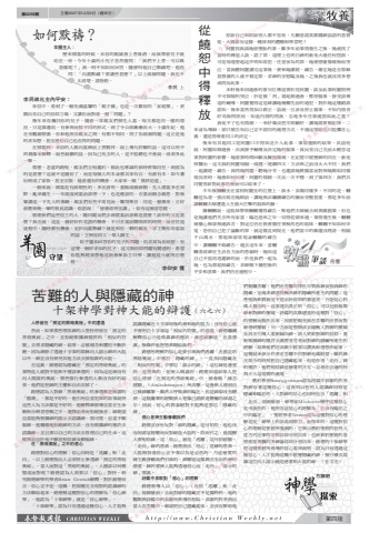 第2259期 主曆2007年12月9日(禮拜日) 第四版方鎮明李民弟兄主內平安:來信中,看到了一幅充滿溫馨的「親子圖」也是一次歡欣的「家庭樂」,更顯出你自己的信仰立場,又讓你面對一個「問題」?幾年來你攜同你的兒子,隨一眾親友們掃先人墓,每次都是同一樣的情況,只是靠邊站,有參與而採不同的形式。到了令公郎漸漸長大,十歲年紀,他在旁觀細察,你和他與各親友之間,有點不相同,問了你兩個問題,這正是他的求知慾,甚至連你自己也在問的問題。在掃墓時,未信的人都向墓碑前上香膜拜,說上幾句許願的話,這可以用不拜偶像來解釋,說些祝願的話,因為已死去的人,是不能聽也不會說,毋須多此一舉。那麼,老遠的路程,親友們互相邀約,彼此也專誠的依時齊集同往,到底為的是甚麼?這就不是隨俗了,而是每個人的本身都其來有自,有源有本。如今蕃衍到成了家族、甚至宗族,趁還有的機會,大家來一個「慎終追遠」。一般來說,掃墓是有節期性的,多在清明、重陽兩個節期,先人墳墓多在郊野,亂草叢生,一年兩度到墓前清理一下,也是應該的。在墓前細念親恩,對後輩講述一下先人的事蹟,親友們有些不常見面,難得聚首,同是一脈傳來,正好敘舊使晚一輩的彼此認識,俗語說:「留番清明至講」,似有這個意思罷。那麼我們這些信主的人,隨同親友們去到墳墓前該做是甚麼?該作的又是甚麼?我在說,這是一個好好作見證的機會,不只在墓前鬧哄哄的時間,而在往返途程中,隨時都有機會,至於向誰默禱?就是和你一夥的親友,求主賜你有當說的話,主與你同工,領人歸主。似乎還未回答你的兒子的問題,但非常為你欣慰,有這麼一個好求知的兒子,這又與信仰問題有關連的,希望你能夠經常帶他返教會參加主日學,讓他從小就明白聖經。李仰安 覆如何默禱?羊圈主人:歷來掃墓的時候,未信的親戚會上香奠酒,而我帶兒子就站在一旁,今年十歲的小兒子忽然發問:「我們不上香,可以做甚樣呢?」我一時不知如何回答,隨便叫他自己默禱吧。他再問:「向誰默禱?要講些甚麼?」以上兩個問題,我也不太清楚,請指教。李民 上丹雪從饒恕中得釋放人停留在「預定的黑暗奧祕」中的遭遇然而,如果那些尋找神的人堅持停留在「預定的黑暗奧祕」之中,並拒絕根據神提供的「相反的符號」去尋求隱藏的神,結果,必被痛苦和懼怕不斷折磨。因為神除了透過十字架的耶穌向人啟示神的大能以外,神並沒有使用其他方法去展現神的大能。在這,路德認為隱藏在「預定的黑暗奧祕」的事物是人絕對不能和不應該參透的,因為這是神沒有向人開啟的奧祕。那些強行參透的人都沒有好的結果,他們是把神的主權和自由丟掉了。路德認為人對神「黑暗奧祕」的參透都是無謂的「臆測」、都是不好的。他引用亞當犯罪的故事說明這些人為方法都是不好的,他解釋神教導亞當在生命樹和分辨善惡樹之中,選擇前者而拒絕後者;神期望亞當能夠根據神的啟示去認識神。很可惜,亞當不順服神,他驕傲地拒絕神的方法,沒有根據神的應許去認識神,並且要以自己的方法去管理自己的生命,這樣做是由於他不願意相信神及順服神。在「黑暗奧祕」之中的信心路德對信心的理解:信心同時是「逃離」和「走向」,以上路德指出人必須停止參透神「預定的黑暗奧祕」。當人面對這「黑暗的奧祕」,人應該以何種態度面對呢?路德認為人須要以「信心」對待。研究路德神學的學者Brian Gerrish解釋,對於路德而言,信心並不是一道橋,把兩種完全相對的認識神的方法聯結起來。路德稱這種對信心的理解為「信心神學」,他認為「十架神學」就是「信心神學」。「十架神學」認為只有透過這種信心,人才能夠認識隱藏在十字架背後的神和祂的能力,沒有信心就不會明白十字架這「相反的符號」的意義。路德繼續解釋信心乃是倚靠神的應許,就是神願意「在基督」無條件地把恩典賜給我們。路德所理解的信心是要引領我們逃離「在預定的黑暗奧祕」中那位「隱藏的神」,一直奔向隱藏在「相反的符號」中那位「啟示的神」,這位神是慈愛的、是恩典的、是使人稱義的。路德知道如果人把信心停留「在預定的黑暗奧祕」中,便會被「痛苦經驗」(Anfechtungen)所攻擊,這會使人感到自己被神離棄,雖然人呼喚神的臨在,但是神卻沒有聽到,這被離棄的經驗使人想像已經跌進驚嚇的深淵之中。因此,信心的對象絕對不能夠是那位「隱藏的神」。信心是神主動眷顧我們路德並沒有反對「神的隱藏」是可怕的,他也沒有因這經驗而反對神是大能的。取而代之,他提醒人要相信神,這「信心」就是「逃離」這可怕經驗,「走向」神的恩典。路德指出「信心」是神的恩典,人能夠得信心並不要以為是必然的,乃是慈愛的神主動眷顧我們引致的,神願意這樣做完全出於神的慈愛,神的愛使人能夠透過信心而「走向」「啟示的神」那。詩篇中哀歌對「信心」的理解路德教導人以「信心」(包括「逃離」和「走向」兩個層面)去面對神的隱藏並不是獨特的。他的觀點與詩篇中的哀歌所教導的相似。哀歌的作者指出當人在苦難中,神卻把自己隱藏起來,並沒有幫助他們脫離苦難,他們在苦難的掙扎中質詢神及投訴神的隱藏,並渴求神盡快解決神的隱藏所產生的問題;這些投訴和質詢並不是出於信仰的慕道者,乃是信心的偉人發出的,這表達出真正的「信心」可以包括倚靠神和對神的懷