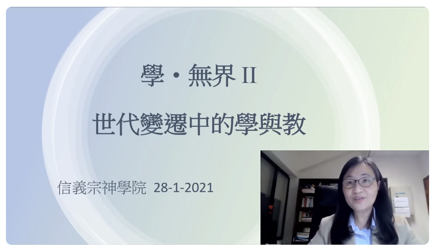 信義宗神學院已於一月二十八及二十九日晚上,在網上舉辦「學 . 無界」 第二期神學體驗課堂,由信義宗神學院講師(基督教教育)黎淑美老師主講「世代變遷中的學與教」,及信義宗神學院客席教授(聖經研究)劉榮佳博士主講「利劍穿心」。