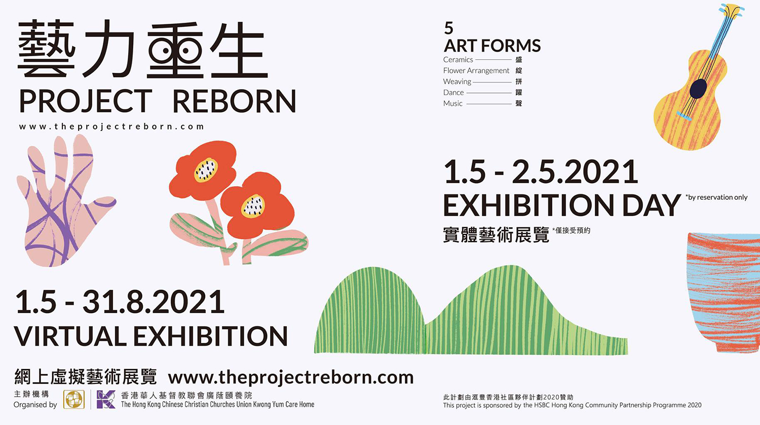 香港華人基督教聯會廣蔭頤養院將於五月一至二日(禮拜六至日)上午十時至下午六時,假沙田安耀街5號 W LUXE 11樓N7室,舉辦「藝力『重生』藝術展覽」。是次展覽將展出五個藝術創作媒介,包括音樂、舞動、編織、花藝及陶藝,目的是讓長者在藝術裏重新經歷與生俱來的創造能力,釋放在疫情的心理壓力,並推廣藝術在安老服務所扮演的重要角色。藝術家屆時將會到場與公眾分享,與長者相處的點滴及藝術如何把長者及社區連結起來。因疫情關係,展覽分不同時段開放,僅限已預約人士前往。此外,線上虛擬展覽亦同步於五月一日公開展出,向公眾分享五個不同藝術創作成品及創作過程,詳情及預約可瀏覽:http://www.theprojectreborn.com