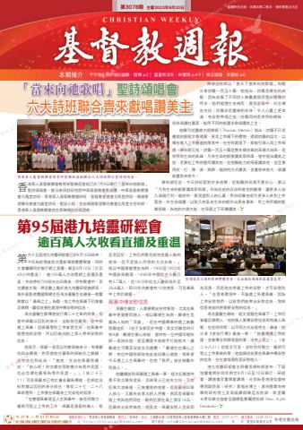 編輯及發行人:香港華人基督教聯會 督印人:陸幸泉 地址:九龍聯合道140號香港華人基督教聯會大樓二樓 電話:2337 4171 圖文傳真:2338 2314網 址:http://ChristianWeekly.net 電子郵箱:[email protected] 承 印:國強印刷制作公司 作者文責自負第3078期 主曆2023年8月20日 逢禮拜日出版.本期出紙二張半.每份零售五元正本期推介 不可彼此批評彼此論斷.陸輝 p.2∣ 盛夏有涼天.林慧琪 p.4-5∣ 修正錯誤.李碧如 p.6「當來向祂歌唱」聖詩頌唱會六大詩班聯合齊來獻唱讚美主第95屆港九培靈研經會逾百萬人次收看直播及重溫香港華人基督教聯會教育部聖樂促進組已於7月9日舉行「當來向祂歌唱」聖詩頌唱會,當日參與詩班包括中華基督教會聖頌團、中華基督教禮賢會九龍堂詩班、香港華人基督教聯會詩班、基督教宣道會北角堂詩班、循道衞理聯合教會九龍堂詩班、聖詠小組;並由循道衞理聯合教會北角堂主任牧師、香港華人基督教聯會前主席陳德昌牧師證道。陳德昌牧師以「普天下當來向祂歌唱」為題分享詩篇一百五十篇。他指出,詩篇是禱告的典範,因為收集了不同詩人無數處境而發出種種的呼求,他們經歷生老病死、喜怒哀樂中,向主禱告交託;詩篇亦是靈修的珍珠,令人心靈上更美滿,有安慰帶領之效;詩篇同時是崇拜的精粹,很多頌讚在裏面,能用不同的能量去歌頌讚美上主。他續引述靈修大師梅頓(Thomas Merton)指出,詩篇不只是優美的聖經文學瑰寶,更是上帝賜下的禮物,透過詩篇的語文,以禱告進入上帝豐盛的厚恩中,在任何處境下,都能引領人與上帝相遇。陳牧師又指,詩篇一百五十篇是整本禱告集的高潮大結局,是崇拜和生命的高峰,凡有生命的都要讚美耶和華。當中提出讚美之旨,是要在上帝的聖所讚美祂,在祂顯能力的穹蒼讚美祂,並且要用吹、打、彈、奏、跳舞、唱詩的方式讚美,音量愈來愈大,頌讚能量愈來愈大。陳牧師坦言,今日詩班面對許多挑戰,但勉勵詩班員不要灰心,要以「凡有生命的都要讚美耶和華」作為信徒的召命和普世的願景,讓更多人加入頌唱行列。唱詩時,要見證到人的心裏,用詩班聲音吸引更多人來到上帝面前,作生命頌讚,以致凡有氣息生命的都作出委身事奉,用上帝所賜的聖樂恩賜,為祂的大德大能,在穹蒼之下同聲讚美。香港華人基督教聯會教育部聖樂促進組聯合六大詩班舉行聖詩頌唱會。第九十五屆港九培靈研經會已於8月10日結束,今年為疫情後首次重新舉辦實體聚會,同時大會繼續同步進行網上直播。截至8月12日(計及48小時重溫),逾100萬人次收看網上直播及重溫,共收得約700份決志回應表,所有聚會中、英文講道文稿,將全數上載於港九培靈研經會網頁。海外基督使團國際總主任馮浩鎏醫生在最後一晚奮興會以「暴風之上」為題,指上帝在風暴下仍掌權及憐憫,籲信徒要在處境中傳安慰的信息。馮浩鎏醫生解釋使徒行傳二十七章的背景,指當時保羅以囚犯的身分,坐船前往羅馬,途中卻遇上風暴;但保羅看到上帝掌管生命,在風暴中經歷祂的安慰,所以仍能向船上眾人帶來安慰的信息。他表示,保羅一直是以宗教領袖身分,有尊嚴地四出傳道,然而當前往羅馬時卻被扣上鎖鏈,沒有地位和自由。「當夜,主站在保羅旁邊,說:『放心吧!你怎樣在耶路撒冷為我作見證,也必怎樣在羅馬為我作見證。』」(徒二十三11)可見保羅本已有計畫去羅馬傳道,但相信沒料到會以囚犯的身分前往,惟從二十七、二十八章卻看到,上帝要在保羅身上完成祂的旨意。「在整個風暴甚至人生風暴中,無任何勢力、權柄可阻止上帝的工作,保羅是基督的僕人,甚至是囚犯,上帝仍然要完成祂差遣人做的使命,但不是按人所想的方法去做。」他以中國教會歷史為例,1900至1920年中國政局動蕩,1890年中國信主人數只有3.7萬人,但1910年信主人數卻急升至36.6萬人,即20年內教會有10倍增長,可見暴風中上帝仍掌權。風暴中傳安慰信息馮醫生續言,人需要戰友扶持幫助,尤其在風暴中更需要同路人。他以戴德生為例,戴德生是廣為人知的「英雄」,但在中國傳教時遇上無數困難挫折,3名子女都死於中國。其女兒離世時只有8歲,戴德生傷心欲絕,當時有一位中國年輕牧師一直陪伴他,甚至購買木板親手打造棺木,讓戴德生可穩妥安放女兒遺體。「戴德生在傷心之際,有位中國牧師陪他走這段傷心道路,我希望今天遇上人生風暴時,也有『我們』彼此鼓勵作同路人。」他繼續談到保羅遇上風暴一事,經文記載當時看不到太陽和星辰,反映眾人已迷失方向,又有狂風大浪催逼,已無獲救的指望。但保羅卻叫眾人放心,又勸失去意志的人用餐,原因是保羅知道上帝與他們同在,縱然仍要在海上漂浮14日,但最終必安然無恙。他直言,保羅安慰人並非因為英勇,而是他先得着上帝的安慰,才可安慰別人。「在香港環境中,不論遇上各樣風暴,因為上帝安慰我們,以致我們能帶出安慰信息,我相信香港這時更需要安慰的信息。」馮浩鎏醫生總結,經文提醒在風暴下,上帝仍掌權及憐憫人,祂的僕人要傳安慰信息和有僕人風範,在任何時間,以不同方式去服侍主。最後,他分享《使徒行傳》最後一節:「放膽傳講上帝的國,並教導主耶穌基督的事,沒有人禁止。」(徒二十八31)從經文可見,沒有任何勢力、權柄可禁止上帝要做的事,他強調信徒要在風暴中傳安慰的信息,在社會每個角落安慰他人。港九培靈研經會主席樓恩德牧師宣布,下屆培靈會將