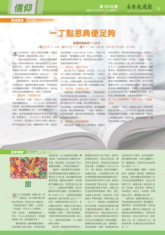 第 3078 期 主曆 2023 年 8 月 20 日(禮拜日) http://ChristianWeekly.net 信仰 3聖靈降臨後第十二主日(賽五十六 1、6-8,詩六十七 1-7,羅十一 1-2a、29-32,太十五 (10-20)、21-28)本主日的經文,最令人驚訝的事實,可能是耶穌稱一個絕望的婦人為狗。一個來自迦南地的婦人,因着女兒被鬼纏得很苦,前來向耶穌求助。雖然當時猶太人以狗來稱呼外邦人,這是一個侮辱的稱呼,但竟由救主耶穌的口說出來,這實屬罕見。然而這位迦南婦人也沒有放棄尋求耶穌幫助。故本文以「一丁點恩典便足夠」為中心,來研讀這段經文。在整個事件中,這位婦人對於耶穌的拒絕也快速的回答,讓耶穌也覺得有道理,不過耶穌卻沒有稱讚她的機智,而是稱讚她的信心。這位迦南婦人在這個關鍵時刻,採取了五個步驟。一、絕望時,向耶穌求助經文提及「主啊,大衞之子,可憐我 ! 我女兒被鬼纏得很苦。」(太十五 22)從說話的內容來看,這位母親真是落於絕望中。因她已沒有出路。當她聽聞鎮上來了一位行神蹟的拉比—耶穌,她便冒着風險來到她不熟悉的地方「推羅、西頓境內」(太十五 21)尋求幫助;她是一位外邦人,更與猶太人沒來往;她是一個女性,更不便與陌生人交談,樣樣好像不方便,但她已是走投無路。Vance Havner(1901–1986)牧師說過:「環境雖使人失望,但信心卻不絕望」,這便促成事件發展下去。當我們落在這光景中,你會向耶穌呼求嗎 ? 二、無言時,禱告不停止經文接下去「耶穌卻一言不答」(太十五23)這種沈寂更難堪;而門徒卻說:「這婦人在我們後頭喊叫,請打發她走吧。」(太十五23)當人人都請你離開,這位母親卻拒絕放棄,這更展示她的信心:堅持不懈。你有這種信心嗎? 三、落空時,仍敬拜上帝到這時候,耶穌終於開聲說:「我奉差遣只到以色列家迷失的羊那裏去。」(太十五 24)當她聽到這句話時,信心似乎又要落空了,因耶穌只會到以色列人那裏,她心想我是迦南人,一定沒有希望,按常理她該失望而回。她卻繼續尋找出路,跪在耶穌腳前說:「主啊,幫幫我 !」乞求祂的憐憫。當你沒有得到幫助時,你還會跪在耶穌前去敬拜嗎 ?四、蒙恩時,更需學謙卑就在這時,耶穌不近人情的做法,將她比作狗來看待,真的更使她無地自容。耶穌說:「拿孩子的餅丟給小狗吃是不妥的。」(太十五26)但她卻不氣餒,反而說:「主啊,不錯,可是小狗也吃牠主人桌上掉下來的碎屑。」(太十五 27)在這裏的狗與狗之間,隱藏着一個寶貴信息。耶穌說到的狗是小狗,即是家中的寵物狗,而婦人說到的狗,卻是在垃圾堆找東西吃的癩皮狗,她形容自己比耶穌提及的狗更加低劣,這表示她的謙卑態度。謙卑之可貴,在今天世代裏實在罕見。在上帝面前提出要求,像狗乞求餅的碎屑比憐憫容易得多,但要在上帝面前謙卑,比上帝形容的更不如,這種態度更加困難。你只有在上帝的恩典裏,才能有這種視野。五、在上帝供應時,恩典只是一丁點便足夠耶穌說:「婦人,你的信心很大 ! 照你所要的成全你吧。」(太十五 28)這位婦人沒有與耶穌談論偉大的理論,只要求點點碎屑,因為在上帝豐富恩典中,我們只要一點點便足夠了,這就是迦南婦人的信心。一丁點恩典便足夠不少人有這經驗,飽餐之後,來一個甜品,肚子裏好像仍然有空間容納,甚至有些人會笑說:「吃甜品的是另一個胃。」又有指:「吃甜食,可以令人心情愉快」。可是,又有說:「癌細胞愛吃甜!」所以,不少人也見甜說不。究竟甜是何物?甜,是好還是不好?最常認知的,糖或蜂蜜是甜的。若說某個人樣子甜美,即是說見到釋經講道意象傳真 早起鳥林(文.圖)鍾健楷 (禮賢會荃灣堂顧問牧師)她的時候,令人有愉快的感覺。聲音甜美,也就是說那人的聲音悅耳、和諧。甜言蜜語,卻比喻為了討人喜歡或哄騙人,而說些好聽的話。聖經中,甜的意象可以指香味,例如燃燒祭物時發出的馨香之氣。挪亞出方舟之後,拿各種潔淨的牲畜和飛鳥,獻給神為燔祭。耶和華聞了那馨香之氣,不再咒詛大地 ( 創八 21)。亞倫的祭司職事,把全羊獻給耶和華作燔祭,就是馨香的火祭 ( 出廿九 18)。亞倫每早晨整理燈的時候,燒芬芳的香 (出三十7)。然而,神重視我們的心和生活,多於獻任何的祭。每個女子挨次進去朝見亞哈隨魯王之前,均照例先塗抹身體十二個月:六個月用沒藥油,六個月用香料和塗抹的香膏 ( 斯二12)。這些都是有甜味,令人感到愉悅之情的。甜水呢!是指新鮮可飲用的水。摩西領以色列人到了瑪拉,他們不能喝瑪拉的水,因為水是苦的;摩西呼求耶和華,耶和華指示他把樹丟在水裏,水就變甜了 ( 出十五 23-25)。看!再苦的,神也可以變甜。物質界如是,人的際遇又如何?還記得那個稱為甜的寡婦拿俄米麼?因為她的喪夫和喪子之痛,她認為是神使她受了極大的苦,她認為神使她由豐足變空手而回,她更以為是全能的神降禍給她。總之,發生在她身上的苦事,全因為神。於是她要人不再叫她甜,而要叫她苦 ( 路一 20-21)。看到嗎?她懷疑神的保守和供應。神卻以那個對她不離不棄的媳婦的際遇,讓她一步一步看到神的作為,叫她往後的生命比前更甜。你又信得過神能叫你的生命可以由苦變甜嗎?約伯的遭遇,跟拿俄米也有相仿之處,由甜變苦,再由苦變甜。但願,我們能夠在或苦或甜的日子當中,如約伯那樣,看到賞賜和收取,神有主權變化一切。遭遇過後,我們的生命能如精金 ( 伯廿三 10)。你有否在靈修、讀經、小組查經中,經歷過、默想過、驚歎
