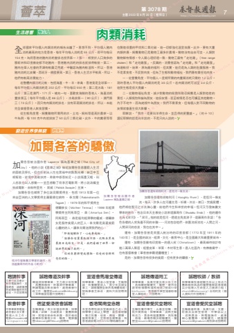 第 3078 期 主曆 2023 年 8 月 20 日(禮拜日) http://ChristianWeekly.net 薈萃 7加爾各答被法國作者 Lapierre 稱為喜樂之城(The City of Joy)。他的小說《喜樂之城》描述加爾各答底層窮人生活的面貌及掙扎,但也折射出人性在黑暗中的點點光輝:缺乏中互相幫助,逆境中勇敢扶持,卑微中感恩知足。小說既重又輕,叫人悲哀也叫人感動——並且感動了荷李活電影商,將小說改編並拍成電影,由帕特里克 ‧ 斯威(Patrick Swayze)主演。 加爾各答也哺育了多位諾貝爾獎得主,包括 1913 年第一位來自亞洲的人文學獎得主羅賓德拉納特 ‧ 泰戈爾(Rabindranath Tagore),1979 年的和平獎得主德蘭修女(Mother Teresa),1998 年經濟學獎得主阿馬蒂亞 ‧ 森(Amartya Sen)。阿馬蒂亞 ‧ 森是福利經濟學的權威,德蘭修女是服侍貧窮人的巨人,泰戈爾是澆灌貧窮心靈的詩人。讓泰戈爾滋潤我們的心: 「即使翅膀折了,心也要飛翔。」「寂靜在喧囂裏低頭不語,沈默在黑夜裏與目光結交,於是,我們看錯了世界,卻說世界欺騙了我們。」「你的負擔將變成禮物,你受的苦將照亮你的路。」加爾各答還有胡格利河(Hooghly River),是恆河一條支流。每天,許多人在河邊沈思、祈禱、沐浴、漱口、焚燒屍體,他們相信聖河之水洗滌心靈,給他們今生和來世的幸福。恆河又引發無數文學家的創作,包含日本天主教徒小說家遠藤周作(Shusaku Endo),他的遺作名為《深河》,「深河」指的就是恆河,透過主角美津子,遠藤周作承認:「各色各樣的人背負着不同的辛酸……河流包容他們,依舊流呀流地。人間之河,人間深河的悲哀,我也在其中。」還有,加爾各答曾是英國人統治時的印度首都(1772 年至 1911 年的140 年),是全國的政治、經濟、文化、教育中心,是全國最大和最重要城市。 還有,加爾各答擁有印度唯一的唐人街(Chinatown),最高峰時估計有逾二萬華人聚居,經營皮革、茶葉、木材等生意。唐人社區內,有佛教廟宇,也有基督教會(筆者曾參觀過靈糧堂)。 是的,加爾各答有很多的貧窮,但有更多的驕傲。生活迴響肉類消耗窮遊世界學無窮龔立人趙煥明加爾各答的驕傲 加爾各答還有胡格利河,是恆河一條支流。全球國家平均個人肉類消耗的報告出爐了。意想不到,平均個人豬肉消耗最高的地方是香港,每年平均每人消耗是 55 公斤,即平均每日154 克。為何香港的豬肉消耗會排名世界第一?第一,相對於人口夠多的穆斯林和印度教徒都不吃豬肉,香港豬肉消耗的排名就排得較前。第二,豬肉在華人社會的烹調有較廣泛用處,中醫認為豬肉較溫和。所以,香港豬肉消耗比波蘭、西班牙、德國要高。第三,香港人生活水平較高,所以,他們有較高消費能力。若整體肉類消耗比較,包括海產、牛、羊、家禽,香港竟是全球第一,每年平均個人肉類消耗是 202 公斤,平均每日 550 克;第二是冰島,181公斤;第三是澳門,171 斤。補充一句,喜歡食海鮮的香港人,海產消耗量排第五(每年平均個人是 66 公斤),冰島排第一(90 公斤)、澳門第三(73 公斤)。因只有肉類消耗排名,沒有菜蔬類消耗排名,所以,未能完全掌握香港人飲食習慣。從生態角度看,飼養動物所需用的水、土地、飼料等遠高於農耕。以牛為例,每 100 克牛肉就排放了 50 公斤二氧化碳。此外,牛的糞便等等也製造很重的甲烷和二氧化碳,這一切都強化溫室效應。此外,要有大量肉類供應,飼養動物已是動物工廠多於農場。動物沒有自由可言,人類對動物鮮有情感。令人類心理好過一點,動物工廠有「走地雞」(free range chicken)和「走地雞蛋」。反諷的,消費者認為「走地雞」和「走地雞蛋」味道較好。結果,原為雞的福利,但其實,這仍是為人類的肚腹服務。我不是素食者,不反對肉食,但為了生態和動物福祉,我們應有責任地肉食。一、從營養角度,平均個人一星期所需的肉量類消耗只需約 1.2 公斤。現時香港人平均個人肉類消耗是 3.5 公斤。若肉類消耗可減至 2.4 公斤,這對生態是很大貢獻。二、從動物福祉角度,減少對動物的殺戮和殘忍飼養是人類對他者的責任。人類視狗和貓為朋友,這份友情,甚至親情是否也可擴至其他動物。內子不吃牛,因為她視牛為朋友。我們不需素食,但每個人對不同動物的友情就會產生很大影響。耶穌說,「我來,是要叫羊得生命,並且得的更豐盛。」(約十 10)謹記耶穌的話是向羊說的,不是只向人說的。恆河引發無數文學家的創作,包括遠藤周作的作品《深河》。宣道會馬灣堂傳道神學畢業,委身小型堂會,主動熱誠,牧養關愛成人,青少年及婦女事工,請繕履歷至新界馬灣體育路1號執事會主席收,資料只供招聘用途。教會幹事中學畢業熟電腦,處理會計及文書,需週六日工作。電郵[email protected]誠聘牧師 / 教師神學畢業牧會經驗五年以上有活力團隊精神具函附履歷電郵致基督教尖沙咀潮人生命堂人力資源小組([email protected])合則約見(個人資料只作招聘用)香港閩南堂急聘本堂急聘牧師及宣教師各乙名,具神學學士或以上學歷,富牧會經驗,專注牧養、培育、傳道、關懷、發展等事工,並帶領各類聚會,有意者請致電28932242聯絡蕭牧師。信望愛浸信會誠聘全職傳道/青少年福音幹事,神學畢業/訓練,忠誠委身,重團隊精神,對福音使命有承擔,善於栽培教導和牧養青少年、職青,電郵履歷[email protected]招聘用誠聘傳道及幹事傳道須神學畢業,主力青少年牧養,具團隊精神。幹事須中學畢業,熟識電腦及影音操作,處理教會行政