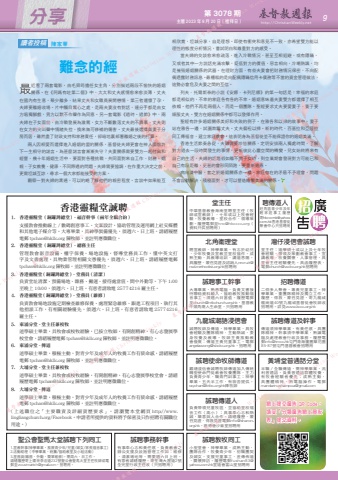 第 3078 期 主曆 2023 年 8 月 20 日(禮拜日) http://ChristianWeekly.net 分享 9難念的經讀者投稿 陳家華最近看了兩套電影,由毛舜筠擔任女主角,分別描述兩段不愉快的婚姻關係。在《阿媽有咗第二個》中,太太和丈夫感情愈來愈淡薄,丈夫在國內有生意,聚少離多,結果丈夫和女職員展開戀情,第三者還懷了孕,夫婦要離婚收場。片中觸目驚心之處,是兩夫妻沒有對話,連分手都是由女方唱獨腳戲,男方以默不作聲作為同意。另一套電影《過時。過節》中,兩夫婦在子女面前,由冷戰發展為激罵,女方不斷數落丈夫的不濟事,丈夫則在女方的尖叫聲中情緒失控,換來無可修補的傷害。丈夫最後選擇與妻子分房而居,雖然盡了財政支持和家務責任,卻暗地裏部署離婚之後的打算。兩人因相愛而選擇進入婚姻的盟約關係,基督徒夫婦更會在神人面前許下一生相守的諾言。為甚麼諾言會漸漸失守?夫妻關係需要雙方一起付出和經營,幾十年婚姻生活中,要面對各種挑戰,共同面對來自工作、財務、姻親、子女教養、健康、不同際遇的問題。夫婦需要協調,在作重大決定之前,更需坦誠互諒,尋求一個大家都能接受的方案。觀察一對夫婦的溝通,可以約略了解他們的親密程度。言談中如果能互聖公會聖馬太堂誠聘下列同工1.宣教幹事(神學畢業,推展青少年/兒童/婦女/家長福音事工) 2.活動助理(中學畢業,統籌/協助教堂及小組活動)3.堂務員(雜務、外勤、簡單維修)。需周六、日工作。請繕履歷寄上環荷李活道232號聖公會聖馬太堂主任牧師或電郵至[email protected]。招聘用。 香港靈糧堂誠聘1. 香港靈糧堂(銅鑼灣總堂)- 福音幹事(兩年全職合約)支援教會推動線上 / 數碼創意事工、文案設計,協助管理及運用網上社交媒體和其他電子媒介等。大專畢業,具神學裝備優先,須週六、日上班。請繕履歷電郵 [email protected] 陳牧師,並註明應徵職位。2. 香港靈糧堂(銅鑼灣總堂)- 總務主任管理教會影音設備、樓宇保養、場地設施,督導堂務員工作,懂中英文打字及文書處理,具物業管理相關文憑優先,須週六、日上班。請繕履歷電郵[email protected] 陳牧師,並註明應徵職位。3. 香港靈糧堂 ( 銅鑼灣總堂)- 堂務員 ( 清潔 )負責堂址清潔、預備場地、雜務、搬運、接待處當值、間中外勤等。下午 1:00至晚上 10:00,須週六、日上班。有意者請致電 25774216 羅主任。4. 香港靈糧堂 ( 銅鑼灣總堂)- 堂務員 ( 維修 )負責教會場地設施定期檢查維修保養、處理緊急維修、跟進工程項目、執行其他指派工作,有相關經驗優先,須週六、日上班。有意者請致電 25774216羅主任。5. 東涌分堂 - 堂主任兼校牧道學碩士畢業,具牧會或校牧經驗,已按立牧師,有開創精神,有心志發展學校堂會,請繕履歷電郵 [email protected] 陳牧師,並註明應徵職位。6. 東涌分堂 - 傳道道學碩士畢業,積極主動,對青少年及成年人的牧養工作有使命感,請繕履歷電郵 [email protected] 陳牧師,並註明應徵職位。7. 大埔分堂 - 堂主任兼校牧道學碩士畢業,具牧會或校牧經驗,有開創精神,有心志發展學校堂會,請繕履歷電郵 [email protected] 陳牧師,並註明應徵職位。8. 大埔分堂 - 傳道道學碩士畢業,積極主動,對青少年及成年人的牧養工作有使命感,請繕履歷電郵 [email protected] 陳牧師,並註明應徵職位。( 上述職位之「主要職責及詳細資歷要求」,請瀏覽本堂網頁 http://www.lingliangchurch.org/Facebook。申請者所提供的資料將予保密及只作招聘有關職位用途。)誠聘傳道及幹事傳道須神學畢業,有責任感,具團隊精神。幹事須中學畢業,熟識電腦及處理教會行政及事務。履歷電郵[email protected]屯門青海圍置樂花園85-87號屯門基督教會招聘用誠聘使命牧師傳道觀塘浸信會誠聘牧師傳道加入傳統轉型使命門徒教會牧養團隊,主力負責青少年、職青門訓事工;神學畢業。五天半工作,有宿舍提供。[email protected]陳牧師九龍城潮語浸信會誠聘牧師及傳道,神學畢業,具牧會經驗及團隊精神,主動熱誠,委身牧養及教導。牧師主責推動教會發展:傳道主責兒童事工。電郵[email protected]。招聘用誠聘事工幹事大專畢業,熟悉電腦,負責文書接待聯絡資料輸入,協助教牧推動福音事工,須週六日當值。履歷電郵至[email protected],基督教牛頭角潮人生命堂,只招聘用北角衞理堂聘宣教師、神學畢業、有志於幼兒、少年牧養及宣教並堂校協作。成熟主動,具教導培訓、講道恩賜。具履歷、蒙召見證及諮詢人[email protected]招聘用黃埔堂普通話分堂半職/全職傳道,需神學畢業,流利普通話,負責普通話群體牧養,有牧會經驗者優先;成熟主動,具團體精神,熟電腦操作。電郵[email protected]誠聘傳道人負責帶領兒童牧區,並協助堂校福音工作(高小);具事奉心志和熱誠,樂意與人合作。請繕履歷、蒙召見證、得救見證電郵[email protected]。路德會沙崙堂招聘用誠聘教牧同工小型堂會,神學畢業,成熟主動,團隊合作,牧養青少年、初職團契及婦女,支援兒童事工、差傳佈道、關懷探訪。履歷電郵[email protected]宣道會富山堂招聘用灣仔浸信會誠聘堂主任:道學碩士或以上及七年牧會經驗,帶領及策劃教會事工,宣講教導,牧養關懷,人事管理,具堂會主任經驗優先。具函履歷表,電郵[email protected]招聘用堂主任中華基督教會海南堂聘堂主任(牧師或宣教師),七年或以上牧會經驗。牧養教導、堂校合作、領導策劃。履歷電郵至[email protected](資料只供招