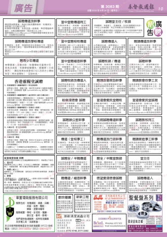 第 3083 期 主曆 2023 年 9 月 24 日(禮拜日) http://ChristianWeekly.net 廣告 10誠聘牧師/傳道神學畢業,負責牧養、教導及堂校福音事工具行政及管理經驗、團隊精神。履歷蒙召見證及諮詢人資料電郵[email protected]或寄深水埗培德街八號信義會深信堂招聘用誠聘幹事文書及行政工作,處理奉獻安排,支援各部事工,成熟主動,須周六日上班。履歷至[email protected]九龍深水埗巴城街43號香港聖公會聖多馬堂張先生收。招聘用聘請教會探訪幹事中學或以上程度懂電腦軟件操作,主動熱誠協助探訪教友,部組活動及文書工作,近地鐵站。請繕履歷電郵[email protected]聖公會聖士提反堂常務助理收。招聘用宣道會愛民堂聘牧全職牧養中學生、大專至初職、開拓外展佈道。神學畢業,成熟主動有活力,委身佈道重團隊,具牧養、佈道、教導恩賜及經驗優先。履歷至[email protected]招聘用宣道會愛民堂誠聘全職教會幹事,負責行政、文書、財務及自修室管理。中學或以上,成熟委身,熟電腦操作,處事細心重團隊,經驗優先。繕履歷[email protected]高牧師收招聘用聘請教會炊事工友負責清潔聖堂及週會炊事工作,每週工作六天。西營盤半山上班,近地鐵站。有意請致電2546-1212張先生約見。誠聘傳道及學校傳道牧養婦女,長者,發展家庭及社區福音工作。堂校合作,帶領學生歸主。需神學畢業或具神學訓練優先,週六日工作。履歷至[email protected]香港聖公會聖巴拿巴堂招聘用宣中堂聘傳道同工負責長者事工,具經驗,喜接觸長者。神學畢業,成熟主動重團隊,講道牧養傳福音恩賜。繕履歷蒙召得救見證九龍城富寧街二號宣中堂周生[email protected]招聘用宣中堂聘校牧傳道主責國際小學CAPCL福音事工;神學畢業重團隊,牧養教導傳福音恩賜,通中英文,英語流利。履歷蒙召見證九龍城富寧街二號宣中堂周生[email protected]招聘用宣中堂聘福音幹事青少年/長者事工;DSE文憑或學位,經驗優先;事奉心志、中英文電腦,全職或半職,五六日需上班。履歷九龍城富寧街二號宣中堂周生[email protected]只招聘用誠聘牧師及傳道人須認同崇真會宗旨,神學畢業,處事成熟獨立有活力,具牧養事工恩賜及經驗。以擅長策劃團契、主日學事工為優先考慮。請繕履歷寄新界粉嶺崇謙堂20A聘牧組。招聘用誠聘傳道及幹事傳道需神學畢業,熱誠主動具團隊精神;牧養婦女、家庭事工及兒童主日學。幹事需中學畢業,負責堂會一般事務、熟悉電腦軟件操作,主動具團隊精神;需星期六日上班。履歷電郵[email protected]中國佈道會祥華堂堂主任收。只招聘用合則約見粉嶺浸信會 誠聘助理幹事中學畢業,熟識電腦及影音操作,支援教會事工,有小型維修經驗優先考慮,需周六日當值。寄履歷粉嶺沙頭角道3號執事會主席收或電郵[email protected]招聘用聘青少年傳道神學畢業,主動合群;牧養學校兒童青少年、家長及長者,有教學經驗優先。繕履歷(只招聘用)、薦信致青衣長發邨CNEC呂明才小學校牧室(青衣堂聘牧),安排約見。新新工程承接水電油漆泥水各項裝修工程取價公道歡迎教會及主內肢體電90819077免費報價陳弟兄歡欣僱傭嚴格挑選菲印傭工適合不同家庭需要提供專業顧問服務經驗豐富服務真誠查詢21558177華置環衛服務有限公司服務包括:各種滅蚊、滅蟲、白蟻、 床蝨、鼠患、驅蛇、 蜂巢、塗層消毒等服務範圍:學校、安老院、餐廳、 辦公室、會所、商場。我們提供每週服務,採用有效藥餌及多種工具,消滅害蟲。本公司使用除害劑是安全及經漁護署 (AFCD) 批核電話:(852) 25510000/ (852) 69010277誠聘辦公室幹事熟電腦操作,負責辦公室文書,支援教堂活動,主動熱誠重視團隊,需周六日工作。履歷電郵[email protected]或郵寄聖馬提亞堂元朗媽廟路9號主任牧師收。招聘用元朗誠聘傳道幹事神學畢業或相關神學訓練,負責堂校青年事工,主動熱誠重視團隊,需周六日工作。履歷電郵[email protected]或郵寄聖馬提亞堂元朗媽廟路9號主任牧師收。招聘用信望愛浸信會誠聘全職傳道/青少年福音幹事,神學畢業/訓練,忠誠委身,重團隊精神,對福音使命有承擔,善於栽培教導和牧養青少年、職青,電郵履歷[email protected]招聘用誠聘傳道人神學畢業,主要牧養青少年(包括職青),並整體宣講和教導。具團隊精神,熱誠主動。履歷電郵至[email protected]鰂魚涌基督教中國佈道會香港萬善堂。只招聘用誠聘教牧同工小型堂會,神學畢業,成熟主動,團隊合作,牧養青少年、初職團契及婦女,支援兒童事工、差傳佈道、關懷探訪。履歷電郵[email protected]宣道會富山堂招聘用誠聘傳道人大角嘴浸信會,誠聘傳道人,主要負責婦女關顧牧養,並教會整體宣講及教導等服事。需神學畢業,與牧養團隊彼此配搭。履歷電郵至[email protected]。招聘用。聘請傳道及幹事青少、家長或長者傳道,熱愛宣講及教導、熟悉小組牧養。幹事,大專畢業,文書處理及設計,周六當值。電郵履歷[email protected]香港天樂浸信教會招聘用傳道(堂校事工)牧養婦女、長者及兒童。神學畢業,三年牧會經驗。主力策劃堂校福音事工。履歷電郵至[email protected]或寄九龍何文田邨適文樓地下何文田浸信會。只作招聘用。聘傳道及行政幹事傳道需神學畢業,協助拓展兒童、家長及婦女事工。行政幹事需大專畢業,負責策劃、統籌事工及場地管理。繕履歷電郵[email protected]宣道會筲箕灣堂招聘用。聘請家庭事工幹事銘恩浸信會誠聘全/兼職家庭事工