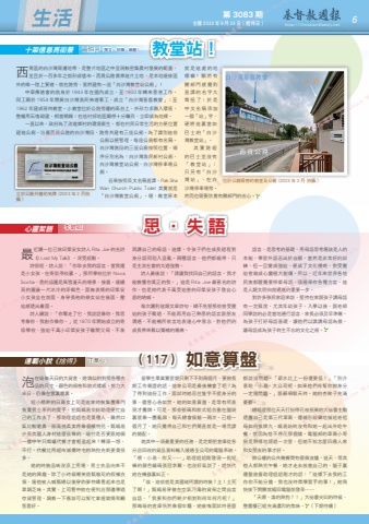 心靈絮語十架信息亮街景西貢區的白沙灣周邊地帶,是整片地區之中呈現較密集農村發展的範圍,並且於一百多年之前形成墟市。西貢公路貫串這片土地,是本地連接區外的唯一陸上要道。就在路旁,竟然建有一座「白沙灣教堂站公廁」!中華傳道會的前身於 1943 年在國內成立,至 1950 年轉來香港工作。同工瞬於 1954 年開展白沙灣漁民佈道事工,成立「白沙灣基督教會」;至1962 年建成現時教堂。小教堂位於公路旁邊的高台上,外形力求融入環境,整幢用石塊砌建,相當精緻;在這村郊地區顯得十分矚目,立即成為地標。一直以來,政府為了改進鄉村的環境衛生,都在村民日常生活的方便位置建造公廁。沿着西貢公路的白沙灣段,路旁共建有三座公廁。為了識別這些公廁以便管理,每座公廁都有名稱。白沙灣路段的三座公廁按照位置、順序分別名為:白沙灣漁民新村公廁,白沙灣教堂站公廁,白沙灣停車場公廁。若果按照英文名稱直譯,Pak Sha Wan Church Public Toilet 其實就是「白沙灣教堂公廁」。喔,教堂原本就是這處的地標 嘛! 顯 然 有關部門感覺到直譯的名字太彆 扭 了; 於 是中文名稱添加一個「站」字,硬將這裏當如巴 士 的「 白 沙灣教堂站」。其實路經的巴士並沒有「 教 堂 站 」;只 另 有「 白 沙灣 站 」, 在 白沙灣停車場旁。然而也需要欣賞有關部門的苦心。位於公路兩旁的教堂及公廁 (2023 年 2 月 拍攝 )立於公廁外牆的名牌 (2023 年 2 月拍攝 )第 3083 期 主曆 2023 年 9 月 24 日(禮拜日) http://ChristianWeekly.net 生活 6思.失語 教堂站! 李碧如區伯平(撰文、拍攝、繪圖)最近讀一位已故印第安女詩人 Rita Joe 的名詩《I Lost My Talk》,深受感動。詩很短,詩人說:「你取去我的語言,當我還是小女孩,在寄宿學校裏。」那所學校位於 Nova Scotia,書的插圖是風雪漫天的場景,接着,連續頁的圖畫一片冰冷的深褐色,面無表情的印第安小女孩坐在前面,身穿長袍的修女站在後面,壓迫感透出畫面。詩人續說:「你奪走了它,我說話像你,我思考像你,我創作像你。」從 1870 年開始成立的寄宿學校,強迫千萬小印第安孩子離開父母,不准再講自己的母語,這樣,令孩子們在成長過程對身分認同陷入混亂。兩種語言,他們都曉得,只是主流社會的太過強勢。詩人最後說:「請讓我找回自己的語言,我才能教懂你真正的我。」這是 Rita Joe 最著名的詩作,也是她代表千萬受迫害的印第安孩子發自心底的吶喊。每次讀到這類文章詩句,總不免替那些曾受壓迫的孩子難過,不能再用自己熟悉的語言跟朋友溝通,不能暢所欲言地表達心中意念,對他們的成長帶來難以彌補的傷痛。語言,是思考的基礎,用母語思考應該是人的本能,學習外語若出於自願,當然是非常好的訓練,但一旦變成強迫,便成了文化侵略,對受壓迫者做成心靈極大創傷。所以,近年來世界各地民族都醒覺要捍衛母語,積極保存各種方言,這是人類文明向前邁進的重要一步。對許多移民家庭來說,堅持在家跟孩子講母語有一定難度,尤其年幼孩子,入學以後,跟老師同學說的必是當地通行語言,家長必須及早準備,為孩子打好母語基礎,讓他們以識講母語為傲,讓母語成為孩子終生不忘的文化之根。《捨得》泡在暗無天日的大貨倉,遊魂似的對照各種衣品的尺寸、顏色的規格和款式樣板,努力大半日,仍像在雲裏霧裏。短小精幹的日裔女上司是這家時裝集團專門負責男士系列的買手,把甄曉易交給助理便忙自己的工作去了,那助理姐姐也是黃種人,雖然口氣比較嗆鼻,卻高挑柔美得像個模特兒。甄曉易少見美國人身材這麼苗條的,暗忖是否要跟她倆一樣中午只喝罐代餐才會輕盈起來?轉頭一想,不行,代餐比用超市減價時屯的熱狗充飢要貴很多。她的時裝品味沒派上用場,男士衣品向來不是她的興趣,除了小時候嘲笑過甄瀚咫的假襯衣領,連他被人喊甄總以後穿的夢特嬌看起來也是單調乏味。其實,上司看中她在便利店那邊學過存貨管理,調教一下應該可以幫忙掌握銷情和顧客喜好。都說沒問題。「薪水比上一份還要低!」「別介意啦,小易,大公司呢,如果他們肯幫你辦身分一定沒問題。」跟蘇珊聊天時,她的杏眸子充滿憂鬱。總經理那位天天打扮得花枝招展的大祕書主動透露自己是第三代華裔,還繪形繪聲地描述老祖母如何推牌九,曉易始終沒有和她一起出外吃午餐,就因為捨不得花那個錢。電腦部的華裔小哥倒是熱情地請過一次客,但她不知怎麼回應人家和女朋友的事才好。辦公樓的公共備餐間有個微波爐,這天,等其他人都熱完午餐,她才走去放進自己的,腦子裏還盤旋着助理姐姐剛才的話:「這樣下去我的工作你不能分擔,我也沒時間學買手的事!」她飛快按下開關就縮回電腦前發呆……「天哪,誰的熱狗?!」大祕書尖叫的時候,整層樓已經充滿濃烈的焦味。 (下期待續)留學生畢業實習期只剩下不到兩個月,要辦長期工作簽證的話,這家公司是最後機會了吧?為了得到這份工作,面試時她忍住隻字不提身分的事,儘管心急如焚。她的如意算盤,是等有所表現才攤牌。可是,那些號碼和款式組合塞在腦袋裏就像一團亂麻,每天總會搞錯一兩次。已經一個月了,她只覺得自己和它們簡直就是一場荒謬的錯配。她其中一項最重要的任務,是定期把倉庫從各分店回收的貨品資料輸入連通全公司的電腦系統。「喂,小易,你又……」助理姐姐剛發現一批短褲的顏色編碼張冠李戴,也沒好