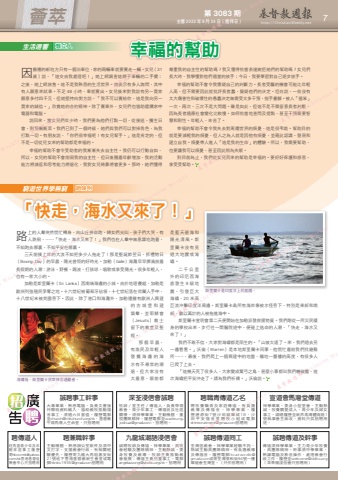第 3083 期 主曆 2023 年 9 月 24 日(禮拜日) http://ChristianWeekly.net 薈萃 7路上的人羣突然慌忙轉身,向山丘拼命跑,婦女們尖叫,孩子們大哭,有人跌倒,……「快走,海水又來了!」我們也在人羣中無意識地跑着,不知跑去哪裏,不知平安在哪裏。 三天前撲上岸的大浪不知把多少人拖走了!那是聖誕節翌日、拆禮物日 (Boxing Day)的早晨,陽光普照的好時光。加勒(Galle)海灘早早擠滿放着長假期的人潮:游泳、野餐、踢波、打排球、唱歌或享受陽光。很多年輕人,也有一家大小的。 加勒是斯里蘭卡(Sri Lanka)西南端海邊的小城。由於地理優越,加勒是歐洲列強殖民爭奪之地。十六世紀被葡萄牙佔領,十七世紀落在荷蘭人手中,十八世紀末被英國吞下。因此,除了港口和海灘外,加勒還擁有歐洲人興建的古城堡和建築羣,並耶穌會(Jesuits) 教 士留下的教堂及聖經。那 個 早 晨,有漁民及年輕人發覺海邊的海水有不尋常的潮退,但大家沒有太着意,眼前都是藍天碧海和陽光清風。斯里蘭卡沒有見過大地震或海嘯。 二千公里外的印尼西海底發生9級地震,引發巨大海嘯,20 米高巨浪沖擊印度洋周邊。斯里蘭卡島所有海岸像被水怪吞下,特別是東部和南部,數以萬計的人被拖進海中。 斯里蘭卡宣明會第二天便開始在加勒派發救援物資。我們剛從一所災民棲身的學校出來,步行往一間醫院途中,便碰上逃命的人潮,「快走,海水又來了!」我們不敢不信,大家對海嘯都是陌生的。「山坡太遠了。來,我們過去另一邊看看。」沃倫(Warren)是本地斯里蘭卡同事,他慌忙着給我們找避難所……,最後,我們爬上一個興建中的地盤,離地一層樓的高度,有很多人已爬了上去。 「這幾天死了很多人,大家變成驚弓之鳥,甚麼小事都叫我們嚇破膽,這次海嘯把平安沖走了。請為我們祈禱。」沃倫說。生活迴響幸福的幫助窮遊世界學無窮龔立人趙煥明「快走,海水又來了!」斯里蘭卡是印度洋上的島國。因搬遷的新地方只有一個泊車位,家的兩輛車就要賣走一輛。女兒(31歲)說,「這交由我處理吧!」她上網調查這牌子車輛的二手價;之後,她上網放售。這不是我熟悉的生活世界。她表示有多人詢問,其中有人願意來試車。不足 48 小時,車就賣出。女兒後來對我說有另一買家願意多付四千元,但她堅持向對方說,「我不可以賣給你,這是我向另一買家的誠信。」欣賞她的合約精神。除了賣車外,女兒們也協助選購家中電器和電腦。說回來,當女兒們年少時,我們要為他們打點一切,從接送、攪生日會,到預備飯菜。我們已到了一個時候,她們與我們可以對掉角色,為我打點一切。有朋友說,「你們很幸福呢!有女兒幫手。」這是肯定的,但不是一切從兒女來的幫助都是幸福的。幸福的幫助不會令受助者的我漸漸失去自主性。我仍可以行動自如,所以,女兒的幫助不會削弱我的自主性,但日後隨着年齡增加,我的活動能力將減低和思考能力將退化,我對女兒倚靠將會更多。那時,她們懂得尊重我的自主性的幫助嗎?我又懂得恰當表達婉拒她們的幫助嗎?女兒們長大時,我學懂對他們適當的放手;今日,我要學習對自己逐步放手。幸福的幫助不會令我懷疑自己的判斷力。長者受騙的機會可能比年輕人高,但不需要因此就批評長者蠢,質疑他們的決定。坦白說,一些沒有太大傷害性和破壞性的愚蠢決定無需受太多干預,指手畫腳。被人「搵笨」一次、兩次、三次不是大問題。雖是如此,但這不是不需留意長者判斷,因為長者適應社會變化比較慢。如何恰當地查問及提點,甚至干預需要智慧和耐性。年輕人,辛苦了。幸福的幫助不會令我失去對周遭世界的煩憂,這是很弔詭。幫助目的就是要減輕我的煩憂,但人之為人就是因他有煩憂,並藉此認識、發現和建立自我。煩憂帶人進人「這是我的生命」的體驗。所以,我需要幫助,也要讓我可以煩憂,甚至因此稍為失眠。到目前為止,我們從女兒而來的幫助是幸福的。要好好保護和感恩,享受受幫助。海嘯後,斯里蘭卡民眾悼念遇難者。誠聘傳道及幹事傳道須神學畢業,主力青少年牧養,具團隊精神。幹事須中學畢業,熟識電腦及影音操作,處理教會行政工作,履歷至[email protected](茶果嶺浸信會只招聘用)宣道會馬灣堂傳道神學畢業,委身小型堂會,主動熱誠,牧養關愛成人,青少年及婦女事工。請繕履歷至新界馬灣體育路1號執事會主席收,資料只供招聘用途。誠聘事工幹事大專畢業,熟悉電腦,負責文書接待聯絡資料輸入,協助教牧推動福音事工,須週六日當值。履歷電郵至[email protected],基督教牛頭角潮人生命堂,只招聘用聘職青傳道乙名聘牧養職青及家庭傳道,有負擔教導及傳福音,神學畢業。履歷瀝源街7號沙田娛樂城1B,沙田平安福音堂聘牧小組或電郵[email protected]招聘用九龍城潮語浸信會誠聘牧師及傳道,神學畢業,具牧會經驗及團隊精神,主動熱誠,委身牧養及教導。牧師主責推動教會發展:傳道主責兒童事工。電郵[email protected]。招聘用誠聘傳道同工荃灣區教會。神學畢業經驗不拘,熱誠主動具團隊精神。有負擔教導及傳福音。履歷電郵[email protected]或寄荃灣享和街94號一樓樂道會荃灣堂。(只作招聘用)聘傳道人旺角區青少年及年輕家庭事工履歷寄[email protected]香港基督徒聚會中心只招聘用聘兼職幹事 主動積極,熟悉辦公室軟件及須中文打字,支援教會行政,有相關經驗優先。履歷寄九龍大角咀惠安街21號地下香港基督