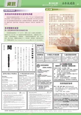 第 3083 期主曆 2023 年 9 月 24 日(禮拜日) http://ChristianWeekly.net 資訊 8香港華人基督教聯會 主席:鍾健楷牧師 副主席:余英嶽牧師 總幹事:陸幸泉牧師 出版部部長:吳思源先生 出版部顧問:翁傳鏗牧師 李志剛牧師 張振華牧師 許朝英先生 胡明添牧師 出版部委員:植栢燊先生 吳業立先生 蘇永權先生 黃文江先生 許立中先生 鄺偉衡牧師 關銳煊先生 梁銘牧師 李鴻標牧師 吳渭濱先生 關鎮威牧師誠心所願 李鴻標創造萬有的主,全地都要稱頌讚美祢!中秋佳節又快到了,當我們舉目觀看,無際天空,星朗月圓,就難禁頌讚祢,並相信萬物由祢創造,萬事由祢掌管,這廣大長空、無涯星際是祢所創造的!賜人平安的主,萬民都要稱頌讚美祢!人有悲歡,月缺月圓,有誰可保無憂?唯獨祢是天天背負我們重擔的主上帝,祢應許賜我們平安,救我們脫離兇惡。只要我們願將憂傷愁煩付託在祢手上,便可得着祢所賜的那不一樣的真平安,只要我們願意藉着禱告祈求凡事謝恩,便可從新得力,如鷹展翅,高低自在!憐愛世人的主,我們要在祢面前屈膝,為因貧困而沒能力歡度佳節的人禱告,求祢叫他們生活飽足,並早日認識祢,藉信得永生,更可以因信一生心歡暢。奉靠我們救主耶穌基督的聖名。阿們!教會及機構短訊香港伯特利教會榮光堂按牧典禮香港伯特利教會榮光堂將於 10 月 1 日(主日)下午 3 時,在香港伯特利教會榮光堂禮堂(香港九龍嘉林邊道 45-47 號)舉行按牧典禮,按立梁佐全先生為牧師。是次按牧典禮由李思敬牧師主禮,按牧團為李思敬牧師、盧家馼牧師、屈偉豪院長、柳鎮平牧師、區伯平牧師、郭貴珍牧師。歡迎出席,同頌主恩,查詢可電 2718-0498。香港聖樂促進會第八屆聖樂與崇拜教牧領袖研討會香港聖樂促進會將於 11 月 7 至 9 日 (禮拜二至四)於道風山基督教叢林(大圍道風山路 33 號)舉行「第八屆聖樂與崇拜教牧領袖研討會」(實體及網上同步),主題為 「直面神榮耀的光──耶穌基督 」,透過對崇拜課題的思考、探討、交流得啟發、建立及造就。 實體參加名額為 50 人,研討題目、講員資料、收費及報名方法等,可瀏覽該會網頁:https://www.hkchurchmusic.org 或電 3590-2835 周小姐查詢。本會鄭成業執事於主曆二零二三年八月二十九日蒙主寵召安返天家在世寄居七十九載謹定於九月三十日(禮拜六)上午十時三十分在尖沙嘴金馬倫道三十一號尖沙嘴浸信會大禮堂舉行安息禮棺柩隨即移送鑽石山火葬場舉行火化禮謹此報聞尖沙嘴浸信會執事會謹報敬辭花籃基督教靈實協會傳道人 ( 全職 / 兼職 ) ( 編號:RSD/Chaplain/W)• 有個人靈命關顧、探訪、帶領信仰小組及訓練探訪員經驗• 負責院舍的靈性關顧及福音工作,服務對象包括殘疾 / 智障人仕、照顧者及員工• 工作地點:將軍澳 / 觀塘 / 西貢蠔涌以上職位須具神學學士畢業,持有 CPE 或相關輔導課程訓練 ,曾受輔導或社工訓練而預備 / 正就讀 CPE 也可被考慮;有訓練探訪員經驗者優先;對老弱病者及照顧者有福音工作負擔。員工福利包括:有薪年假、生日假、產假、侍產假、婚假、恩恤假、醫療及牙科福利、培訓及發展津貼及培訓假期、每月酌情獎勵金及酌情年度表現獎勵金有意者請電郵至 [email protected] 或 WhatsApp至 65078148 ( 標題請註明職位編號 )。如一個月內未獲通知約見,則作落選論。( 申請人所提供的資料將予保密及作招聘有關職位用途。( 未經本協會書面同意,以上招聘廣告全部或部分內容均不得複製至其他招聘網站。)尖沙咀國語浸信會國語崇拜,講道雙語(國粵語互翻)誠聘主任牧師 / 主任傳道 / 傳道u 主任牧師:道學碩士或以上學歷,浸信會按立牧師。最少有七年認可之基督教機構工作,其中不少於四年為牧會。u 主任傳道:道學碩士或神學學士及最少有三年認可牧會經驗。u 傳道:神學學士或以上學歷。以上崗位,浸信會神學畢業優先,有意者電郵:[email protected],資料保密只作招聘用途。中華基督教會長洲堂聘請主任牧師 神學畢業,具五年或以上牧會經驗,策劃事工,人事管理,有團隊精神和教導恩賜,主責牧養小學及幼稚園家庭。教會提供宿舍或房津,5 天半工作,有薪年假 16 天及醫保。應 徵 者 請 繕 履 歷, 寄 ︰ 長 洲學校道 14 號,中華基督教會長 洲 堂 堂 主 任 收。 或 電 郵 ︰[email protected],合則約見。(招聘用 ) 查詢電話︰ 2981 0623招聘全職或半職傳道職青傳道 :牧養和帶領職青群體。青少年傳道 : 協助統籌青少年崇拜、團契、牧養及外展。需神學畢業、有愛心及樂於與人接觸,具團隊精神。請履歷致中國基督教播道會尖福堂或電郵 [email protected] 人事小組洽,只作招聘用。誠聘傳道神學畢業,兒童、家長及婦女牧養,請將履歷電郵至[email protected]西九浸信會招聘用九龍城潮語浸信會幹事,中六畢業或以上,負責資訊科技及多媒體事務,具相關工作經驗者優先,應徵者具責任心及團隊精神,有事奉心志,需輪班電郵[email protected]。招聘用中華便以利會誠聘香港仔堂聘傳道應屆神學畢業均可福音幹事協助教會行政福音事工中學畢業週六日上班履歷至[email protected]或寄九龍油麻地砵蘭街90號地下人事部招聘用聘請傳道團隊服事、牧養青少年、家庭及輔導寄天水圍天耀邨耀昌樓地下中華宣道會天耀堂招聘用。基督教週報 Christian Weekly 基督教週報 Christian Weekly 基督教週報 Christian Weekly 基督教週報 Christian Weekly 基督教週報 Christian Weekly 基督教週報 Christi