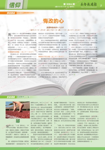 第 3084 期 主曆 2023 年 10 月 1 日(禮拜日) http://ChristianWeekly.net 信仰 3聖靈降臨後第十八主日(結十八 1-4、25-32;詩二十五 1-9;腓二 1-13;太二十一 23-32)馬太福音二十一章記載耶穌騎驢進入耶路撒冷,當時的羣眾和宗教領袖作出不同的回應。羣眾熱烈迎接耶穌,呼喊着說:「和散那歸於大衞的子孫,奉主名來的,是應當稱頌的,高高在上和散那。耶穌既進了耶路撒冷,合城都驚動了,說:這是誰?眾人說:這是加利利拿撒勒的先知耶穌。」(太二十一 9-11)。宗教領袖們因此更對耶穌存有敵意。耶穌權柄受質疑 (太二十一 23-27)正在教訓人時,祭司長和民間長老問耶穌兩個問題:(一)耶穌憑甚麼權柄作這些事?(二)耶穌得的權柄從何而來?其實這羣宗教領袖的質問不是要好奇耶穌的權柄,而是想從中找出反對耶穌的把柄。耶穌明白並看透他們的動機,沒有直接回答他們的問題,而是反問他們:「約翰的浸禮是從哪裏來的?是從天上來的,還是從人間來的呢?」(太二十一 25 上,和修本)。這反問令他們陷入兩難之間,「因為我們若說從天上來,他必對我們說,這樣你們為甚麼不信他呢。若說從人間來,我們又怕百姓,因為他們都以約翰為先知。於是回答耶穌說,我們不知道。」(太二十一 25-27)。因着他們回答耶穌「不知道」,耶穌也不回答他們的質問。從以上宗教領袖與耶穌的對話,讓我們知道昔日這羣宗教領袖不懷好意地向耶穌發出質問。同樣我們有時都像這些宗教領袖一樣,在日常生活、工作表現或人際關係上,表裏不一致,口不對心,對人存有敵意。從聖經反省,讓我們來到神面前認罪悔改,重新立志做個正直和表裏一致的信徒。兩個兒子的比喻(太二十一 28-32) 舊約聖經中曾多次以葡萄園或葡萄樹來比喻以色列(賽五 1-7、耶二 21 及結十五 1-8 等),所以對當時的人來說是耳熟能詳。在馬太福音二十一章二十八至三十二節 的比喻,記述一個人分別要兩個兒子到他的葡萄園工作,而兩個兒子各有不同的回應。大兒子聽到吩咐之後,起初的回應是不去的,但後來懊悔就去了(太二十一 28-29),小兒子聽了吩咐之後,回應是去,但後來卻不去(太二十一30)。耶穌說了兩個兒子的情形後,先讓當時的人自己加以判斷,然後直接將比喻套在他們身上。大兒子代表稅吏和娼妓,因他們後來懊悔,所以可以進神國(太二十一 31)。而小兒子是指當時的祭司和民間長老,他們依然沒有一顆懊悔的心,所以他們不能進神國。從以上兩段經文(太二十一 23-27 及 28-32)的鋪排,可見作者馬太刻意地將焦點放在施浸約翰所宣講「悔改」的重要性之上。 耶穌講這個比喻,要我們反省自己的信仰生活會否有昔日祭司長和民間長老的影子,不但沒有因約翰的信息而回轉,依然心硬和懼怕羣眾,只會回答「不知道」,沒有悔改和順服的心?現在讓我們重新正視自己與神的關係,徹底認罪悔改,並以行動回應踏上順命之路,遵行神的旨意。「你本不喜愛祭物,若喜愛,我就獻上;燔祭你也不喜悅。神所要的祭,就是憂傷的靈;神啊,憂傷痛悔的心,你必不輕看。」(詩五十一16-17)悔改的心常聽人說:「人老,腳先老」,中老年紀開始,腳力真的大不如前。先前,腳底患上筋膜炎,膝蓋也不時痛楚,自己勤做不同的練習、按摩塗藥,終於痊癒了,感謝天父。痊癒之後,也要繼續鍛煉,因為腳是支撐着整個身體的。腳,在聖經中有不同意義。摩西祝福就跟腳有關了,他祝福亞設可以「把釋經講道意象傳真 早起鳥林(文.圖)楊有恆(上環浸信會堂主任牧師)腳蘸在油中」( 申三十三 24),意指向一片盛產橄欖的土地,通常也是肥沃的土地,這地自然會有豐富的出產,供應食物之外,還可以增加收入。聖經不時出現「腳掌所踏之地」( 書一 3),表示某人在某地的權力;若是失去那地的權利,就不能再踏足那地了。故此,摩西要以色列人遵守神的律例、典章,那麼,他們的腳就不會挪移,離開列祖的地業。若把敵人踏在腳下,或踏在敵人的頸項上,表示帶着蔑視、侮辱、勝利來踩踏他。基督徒正會以此姿態,最終勝過魔鬼撒但。聖經中多處提到腳與順服的關聯意象。「坐在某人腳旁」表示順服、受教。馬利亞在主的腳前坐着聽耶穌的話(路十 39),正有此意。神又會保護信靠祂的人的腳步,使他的腳不偏離神的路。「捉住某人的腳」,就表示懇求的行動,猶太人通常會抓住,並親吻他們所敬拜,或祈求的人的腳或膝蓋。「滑腳」表示犯罪,相反,人若把上帝的律法放在心裏,他就能夠站穩了。「以腳揚塵」,表示拒絕訊息,那些不接待和不聽門徒話的人,門徒用腳揚塵之後,就可以到別的地方傳道了。「洗腳」是一項瑣碎和卑微的工作,通常由僕人執行的。耶穌基督正是以身作則,教導門徒怎樣完全奉獻,謙卑服侍別人(約十三2-5)。曾經有機會在青少年團契中,由執事和傳道同工們俯身用水替青年導師和團友洗腳,讓大家都有不少事奉和被服侍的提醒。當我抱起青年導師的腳時,有從未如此親密過之感。我感到她有點尷尬;而我則想着怎樣可以洗得乾乾淨淨。青年導師被洗完之後,她又會去替團友洗腳。教會正是一代接一代,以耶穌為榜樣,學習如何彼此謙卑服侍。在教會祈禱會中,曾經認識一位年長姊妹,她常常充滿笑容,口裏又常出恩言,毫不吝嗇說出鼓勵人的說話。平日,她或在車上、或在渡輪上,都會向人遞上福音單張,對方若是願意,她會向人傳福音作見證。我問她何能如此?她二話不說,直指因為她經歷太多神的恩