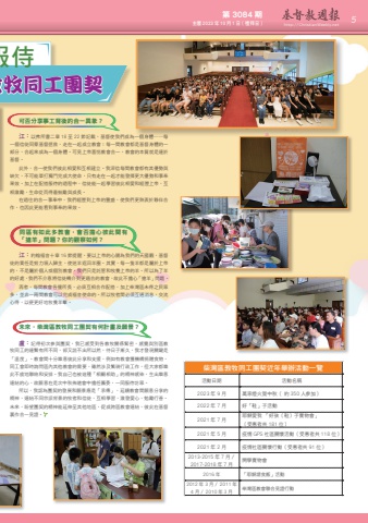 第 3084 期 主曆 2023 年 10 月 1 日(禮拜日) http://ChristianWeekly.net5同心同行同服侍柴灣區教牧同工團契可否分享事工背後的合一異象?江:以弗所書二章 18 至 22 節記載,基督使我們成為一個身體──每一個信徒同蒙基督拯救,走在一起成立教會;每一間教會都是基督身體的一部分,合起來成為一個身體。可見上帝喜悅教會合一,教會的本質就是連於基督。此外,合一使我們彼此相愛和互相建立。我深信每間教會都有其優勢與缺欠,不可能單打獨鬥完成大使命,只有走在一起才能發揮更大優勢和事奉果效。加上在配搭服侍的過程中,信徒能一起學習彼此相愛和經歷上帝,互相激勵,生命從而得着鼓勵與成長。在過往的合一事奉中,我們經歷到上帝的豐盛,使我們更熱衷於夥伴合作,也因此更能看到事奉的果效。同區有如此多教會,會否擔心彼此間有「搶羊」問題?你的觀察如何?江:約翰福音十章 16 節提醒,要以上帝的心腸為我們的天國觀,基督徒的責任是努力領人歸主,使迷羊返回羊圈。其實,每一隻羊都是屬於上帝的,不是屬於個人或個別教會,我們只是託管和牧養上帝的羊。所以為了羊的好處,我們不介意將信徒轉介到更適合的教會,故此不擔心「搶羊」問題。再者,每間教會各擅所長,必須互相合作配搭,加上柴灣區未得之民眾多,並非一兩間教會可以完成福音使命的。所以牧者間必須互通消息,交流心得,以便更好地牧養羊羣。未來,柴灣區教牧同工團契有何計畫及願景?盧:記得初次參與團契,我已感受到各教牧關係緊密,感覺與別區教牧同工的連繫有所不同,卻又說不出所以然,待日子漸久,我才發現關鍵是「溫度」。教會間十分樂意彼此分享和支援,例如有教會獲機構捐贈食物,同工會即時詢問區內其他教會的需要,雖然涉及繁瑣行政工作,但大家都樂此不疲地聯絡和安排。我自己也被這種「相顧相助」的精神感染,生出樂意連結的心,故願意在是次中秋佈道會中擔任籌委,一同服侍坊眾。所以,我認為團契的發展和願景應是「承傳」,延續教會間願意分享的精神,連結不同宗派背景的牧者和信徒,互相學習,激發愛心,勉勵行善。未來,盼望團契的精神能延伸至其他地區,促成跨區教會連結,彼此在基督裏作合一見證。柴灣區教牧同工團契近年舉辦活動一覽活動日期 活動名稱2023 年 9 月 萬家燈火賀中秋( 約 350 人參加)2022 年 7 月 好「鞋」子活動2021 年 7 月 耶穌愛我 「好孩(鞋)子賣物會」(受惠者共 181 位)2021 年 5 月 疫情 GPS 社區關懷活動(受惠者共 118 位)2021 年 2 月 疫情社區關懷行動(受惠者共 91 位)2013-2015 年 7 月/2017-2018 年 7 月 開學賣物會2016 年 「耶穌請食飯」活動2012 年 3 月/ 2011 年4 月/ 2010 年 3 月 柴灣區教會聯合見證行動