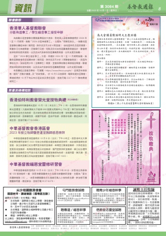 第 3084 期主曆 2023 年 10 月 1 日(禮拜日) http://ChristianWeekly.net 資訊 8香港華人基督教聯會 主席:鍾健楷牧師 副主席:余英嶽牧師 總幹事:陸幸泉牧師 出版部部長:吳思源先生 出版部顧問:翁傳鏗牧師 李志剛牧師 張振華牧師 許朝英先生 胡明添牧師 出版部委員:植栢燊先生 吳業立先生 蘇永權先生 黃文江先生 許立中先生 鄺偉衡牧師 關銳煊先生 梁銘牧師 李鴻標牧師 吳渭濱先生 關鎮威牧師聯會動態教會及機構短訊香港伯特利教會榮光堂按牧典禮(更正典禮地點)香港伯特利教會榮光堂於 10 月 1 日(本主日)下午 3 時,在香港伯特利教會榮光堂禮堂(九龍新蒲崗太子道東 698 號寶光商業中心 706 室)舉行按牧典禮,按立梁佐全先生為牧師。是次按牧典禮由李思敬牧師主禮,按牧團為李思敬牧師、盧家馼牧師、屈偉豪院長、柳鎮平牧師、區伯平牧師、郭貴珍牧師。歡迎出席,同頌主恩,查詢可電 2718-0498。中華基督教會香港區會2023 年按立牧師暨差遣宣教師感恩崇拜中華基督教會香港區會將於 10 月 8 日(主日)下午 4 時正,假香港中文大學崇基學院禮拜堂舉行 2023 年按立牧師暨差遣宣教師感恩崇拜,由該會鄧達榮牧師宣道,按立該會錦江紀念禮拜堂余啟民宣教師、柴灣堂汪寶雄宣教師、大角咀基全堂黃恩淞宣教師、馬灣基慧堂趙玉琼宣教師、龍門堂鄧承軒宣教師、錦江紀念禮拜堂魯聰言宣教師及屯門堂分堂天愛堂鍾嘉媛宣教師為牧師;差遣符蕾、陳天融、黃海樑、黃偉然及蕭玉芳為該會宣教師。查詢可電 2397-1022。中華基督教福恩堂靈修研習會中華基督教福恩堂將於 10 月 8 日(主日)下午 2 時 30 分,於香港北角春秧街 128 號港逸軒 1 樓,與香港優質靈修文化協會合辦靈修研習會,主題為「愛主與靈修進階(8)」,由香港優質靈修文化協會召集人小枝牧師主講。參加者可獲贈靈修用書。歡迎參加,查詢可電 9137-6379。誠聘主任牧師認同浸信會信仰和體制,有8年以上牧會經驗,負責領導本會同工、具行政管理、牧養、聖工策劃和執行力。有意應徵者,請繕履歷,蒙召見證及兩位諮詢人資料,郵寄九龍慈雲山毓華里22號嘉喜大廈二樓,博愛潮語浸信會「主任牧師招聘小組」收,或電郵至[email protected],註明「主任牧師招聘」。資料只供招聘用途。聘傳道/福音幹事大圍區堂校教會,具團隊精神、牧養教導恩賜和傳福音心志,神學畢業或相關訓練。履歷、諮詢人、蒙召見證電郵[email protected]中華宣道會豐盛堂。只招聘用信義會活靈堂誠聘聘請傳道同工或福音幹事,負責青少年及初職群體事工。熱心事奉、主動成熟、富團隊精神。神學畢業或具相關經驗優先。[email protected]只作招聘用。聘青少年福音幹事負責青少年福音工作並協助推展教會轄下服務單位的福音工作。中學畢業或以上,具責任感,團隊合作。親繕履歷元朗康樂路31號嘉好大廈2樓宣道會元基堂。招聘用屯門區教會誠聘半職幹事,負責日常文書、熟悉電腦操作、會計入帳等職務。有意請電郵履歷至恩景堂[email protected] 安排約見。招聘用尖沙咀國語浸信會國語崇拜,講道雙語(國粵語互翻)誠聘主任牧師 / 主任傳道 / 傳道u 主任牧師:道學碩士或以上學歷,浸信會按立牧師。最少有七年認可之基督教機構工作,其中不少於四年為牧會。u 主任傳道:道學碩士或神學學士及最少有三年認可牧會經驗。u 傳道:神學學士或以上學歷。以上崗位,浸信會神學畢業優先,有意者電郵:[email protected],資料保密只作招聘用途。為大會講員陳謳明大主教祈禱 感謝主為香港華人基督教聯會「第二十九屆培靈奮興大會」預備陳謳明大主教為大會講員,主講「天國的使命──從路加福音看耶穌的訓導」。求主看顧,保守祢僕人身心靈健康,滿有信心和力量,把從祢而來的信息,向我們宣講,使我們得到造就,建立豐盛的生命,在天國的使命,作主美好的見證,奉主名祈求,阿們。每天禱告禮拜一 求主恩待講員每天都有安靜時間,從主領受神的話,準備培靈會講道。禮拜二 求主眷佑講員身體健康,願他得着主的眷顧,有精神體力宣講事奉。禮拜三 求主幫助祢的僕人,從他過往建立和牧養信徒生命上,有更寶貴的體驗與我們分享。禮拜四 求主厚賜講員屬靈洞察力,求主加添能力,了解這時代社會的處境,適切信徒靈命需要。禮拜五 求主保守大主教每晚來往會場交通道路上,能夠暢順平安不受阻礙。禮拜六 繼續記念大主教與大會每晚工作人員、執行委員們有美好的配搭,使一切的程序都能順利進行。禮拜日 求主賜大主教宣講主道滿有感召的能力,讓信徒明白真理,回應神的感動,尋求豐盛的生命。陳鏡如(第二十九屆培靈奮興大會祈禱組組員)香港華人基督教聯會分區佈道事工/學生福音事工接受申辦為鼓勵分區堂會聯合實踐廣傳福音大使命,香港華人基督教聯會將於 2024 年1 至 11 月期間,推動「2024 分區佈道事工」,主題為「耶穌是救主」。鼓勵地區堂會聯合籌組申辦(需同區、跨宗派及不少於 4 間堂會),按地區特色及居民需要,策畫多元化佈道聚會。活動舉行日期、地點及形式由各區籌備委員會設計,聯會將按津助原則提供資助,以及派出代表參與各區籌備委員會,以作支援及鼓勵。至於「2024 學生福音事工」方面,同樣於 2024 年 1 至 11 月期間推動。鼓勵各區聯會會員堂組織申辦(需同區、跨宗派及不少於 3 間聯會會員堂),與區內學校合作,按該區青少年(全職學生)需要,堂會與學