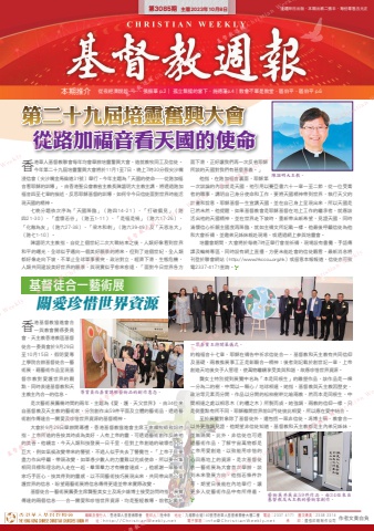 編輯及發行人:香港華人基督教聯會 督印人:陸幸泉 地址:九龍聯合道140號香港華人基督教聯會大樓二樓 電話:2337 4171 圖文傳真:2338 2314網 址:http://ChristianWeekly.net 電子郵箱:[email protected] 承 印:國強印刷制作公司 作者文責自負第3085期 主曆2023年10月8日 逢禮拜日出版.本期出紙二張半.每份零售五元正本期推介 從夜經濟說起…….張振華 p.2∣ 孤立無援的當下.施德藩p.4∣教會不單是教堂.區伯平.區伯平 p.6 第二十九屆培靈奮興大會 從路加福音看天國的使命基督徒合一藝術展關愛珍惜世界資源香港基督教協進會合一與教會關係委員會、天主教香港教區基督徒合一委員會於9月29日至10月15日,假明愛專上學院合辦基督徒合一藝術展,藉藝術作品呈現基督宗教對愛護世界的觀點,同時表達基督教和天主教主內合一的信息。是次藝術展籌備時間約兩年,主題為《愛.護.天父世界》,由34位來自基督教及天主教的藝術家,分別創作出59件平面及立體的藝術品,透過藝術創作傳達合一關愛及珍惜世界資源的基督精神。大會於9月29日舉辦開幕禮,香港基督教協進會主席王家輝牧師致詞時指,上帝所造的各按其時成為美好,人有上帝的靈,可透過藝術創作反映祂的美善。他續言,今天人類科技發展一日千里,但對上帝創造的破壞也十分巨大,例如氣候改變帶來的警號,不過人似乎失去了警覺性。「上帝子民要盡力作出呼籲,帶頭改變,如單憑少數人的力量難以完成使命,所以要召集相同目標和理念的人走在一起,羣策羣力才有機會達成。」他感謝一眾藝術家巧手匠心,按其得到的靈感,以不同藝術技巧展現出來,共同帶出悉心愛護世界的信息,盼望藉藝術展將信息傳得更遠並帶來實際改變。基督徒合一藝術展籌委主席龔聖美女士及馮少雄博士接受訪問時指,展覽傳達的兩個信息──合一關愛和珍惜世界資源,均是聖經教導。前者記載於一眾嘉賓主持開幕儀式。約翰福音十七章,耶穌在禱告中祈求信徒合一,基督教和天主教有共同信仰及基礎,兩教推展事工正是彰顯合一精神;後者則記載於創世記一章,上帝創造天地後交予人管理,使萬物繼續享受美與和諧,故應珍惜世界資源。龔女士特別提到展覽中名為「本是同根生」的雕塑作品,該作品是一棵一分為二的樹,中間以一顆心/地球相連。她指,基督教與天主教因歷史、政治等元素而分開,作品以分開的松柏樹幹比喻兩教,然而本是同根生,中間相連之處以相思木(約櫃之木)所製而成。她強調,兩教的信仰一樣,只是側重點有所不同,耶穌離開世界前叫門徒彼此相愛,所以應在愛中結合。至於展覽對象除了基督徒外,還包括一眾非信徒。馮博士稱,教會合一以外更強調見證,他期望非信徒知道,基督教和天主教都是主內弟兄姊妹,並無隔閡。此外,非信徒也可透過藝術作品,了解宇宙萬物都是上帝用愛創造,以致能用珍惜的心回應地上的資源。是次基督徒合一藝術展為大會首次舉辦,談到未來發展方向,他指若條件許可,期望日後能在內地舉行,讓更多人從藝術作品中有所得着。香港華人基督教聯會每年均會舉辦培靈奮興大會,造就教牧同工及信徒。今年第二十九屆培靈奮興大會將於11月1至7日,晚上7時30分假尖沙嘴浸信會(尖沙嘴金馬倫道31號)舉行。今年主題為「天國的使命──從路加福音看耶穌的訓導」,由香港聖公會教省主教長陳謳明大主教主講,將透過路加福音四至七章的描述,反思耶穌基督的訓導,如何令今日信徒面對世界時能活現天國的精神。七晚分題依次序為「天國降臨」(路四14-21)、「打破偏見」(路四21-30)、「虛懷若谷」(路五1-11)、「是福是禍」(路六17-26)、「化敵為友」(路六27-38)、「梁木和刺」(路六39-49)及「天恩浩大」(路七1-10)。陳謳明大主教指,自從上個世紀二次大戰結束之後,人類好像看到世界和平的曙光,全球似乎邁向一個美好願景的將來。但到了這個世紀,全人類都好像走向下坡,不單止全球軍事衝突、政治對立、經濟下滑、生態危機,人類共同建設美好世界的願景,與現實似乎愈來愈遠,「面對今日世界各方面下滑,正好讓我們再一次反省耶穌所談的天國對我們有甚麼意義。」他指,在路加福音裏面,耶穌第一次談論的內容就是天國,祂引用以賽亞書六十一章一至二節,從一位受膏者的職事,講明自己身分使命和工作,要將天國精神帶到世界,執行天父的計畫和旨意。耶穌基督一生宣講天國,並在自己身上呈現出來,所以天國是已然未然。他提醒,如果基督教會是耶穌基督在地上工作的繼承者,就應該活出祂的天國精神,並在世界走下坡時,重新帶出新希望,見證天國,同時滿懷信心祈願主國度再降臨,就如主禱文所記載一樣。他最後呼籲信徒為他和大會祈禱,並邀弟兄姊妹親赴現場,或透過網上參與培靈會。培靈會期間,大會將於每晚7時正舉行會前祈禱,現場設有書攤、手語傳譯及輪椅專區,同時設有網上直播,方便未能赴會的信徒觀看。最新消息將刊登於聯會網站(http://www.hkcccu.org.hk)或留意本報報道,信徒亦可致電2337-4171查詢。耶穌的訓導從 路加福音 看每晚分題:11月1日(禮拜三) 天國降臨(四章14-21節)11月2日(禮拜四) 打破偏見(四章21-30節)11月3日(禮拜五) 虛懷若谷(五章1-11節)11月4日(禮拜六) 是福是禍(六章17-26節)11月5日(禮拜日) 化敵為友(六章27-38節)11月6日(禮拜一) 梁木和刺(六章39-49節)11月7日(禮拜二) 天恩浩大(七章1-10節)2023年11月1-7日(禮拜三至