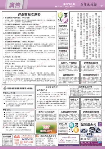 第 3085 期 主曆 2023 年 10 月 8 日(禮拜日) http://ChristianWeekly.net 廣告 10刊登廣告請致電23374171新新工程承接水電油漆泥水各項裝修工程取價公道歡迎教會及主內肢體電90819077免費報價陳弟兄歡欣僱傭嚴格挑選菲印傭工適合不同家庭需要提供專業顧問服務經驗豐富服務真誠查詢21558177香港靈糧堂誠聘1. 香港靈糧堂 ( 銅鑼灣總堂 ) - 牧兒部部牧道學碩士畢業,積極主動,制訂牧兒部事工策略和相關行政工作。請繕履歷電郵 [email protected] 陳牧師,並註明應徵職位。2. 香港靈糧堂 ( 銅鑼灣總堂 ) - 福音幹事 ( 兩年全職合約 )支援教會推動線上 / 數碼創意事工、文案設計,協助管理及運用網上社交媒 體和其他電子媒介等 。大專畢業,具神學裝備優先,須週六、日上班。請繕 履歷電郵 [email protected] 陳牧師,並註明應徵職位。3. 香港靈糧堂 ( 銅鑼灣總堂 ) - 堂務員 ( 中更清潔 )負責堂址清潔、場地佈置、物資搬運及雜務、接待處工作、按需要外勤。工時由下午 1:00 至晚上 10:00,須在週六、日上班。有意者請致電 2577 4216 香港靈糧堂勞主任。4. 香港靈糧堂 ( 銅鑼灣總堂 ) - 堂務員 ( 晚更清潔 )負責堂址清潔、場地佈置、物資搬運及雜務、定時巡樓。工時由晚上 9:30 至翌日早上 7:30,逢週日晚上例假。有意者請致電 25774216 香港靈糧堂勞主任。5. 香港靈糧堂 ( 銅鑼灣總堂 ) - 堂務員 ( 維修 )負責教會場地設施定期檢查維修保養、處理緊急維修、跟進工程項目、執行其他指派工作,有相關經驗優先,須週六、日上班。有意者請致電 2577 4216 勞主任。6. 大埔分堂 - 堂主任兼校牧道學碩士畢業,具牧會或校牧經驗,有開創精神,有心志發展學校堂會,請繕履歷電郵 [email protected] 陳牧師,並註明應徵職位。7. 大埔分堂 - 傳道道學碩士畢業,積極主動,對青少年及成年人的牧養工作有使命感,請繕履歷電郵 [email protected] 陳牧師,並註明應徵職位。8. 東涌分堂 - 行政幹事 ( 部份職 )中英文良好,熟悉一般電腦軟件操作,主動成熟,委身事奉,具兩年以上經驗,請繕履歷電郵 [email protected],並註明「應徵東涌靈糧堂部份時間行政幹事」職位。( 上述職位之「主要職責及詳細資歷要求」,請瀏覽本堂網頁 http://www.lingliangchurch.org/Facebook。申請者所提供的資料將予保密及只作招聘有關職位用途。)我們敬愛的何漢德長老於二○二三年八月廿四日蒙主一生忠心為主,對教會貢獻良多,事主愛人,深得會眾愛戴。寵召,釋去地上勞苦安返天家,在世寄居七十八載。何長老安息禮拜謹定於二○二三年十月十三日(禮拜五)晚上八各主內兄姊、親友。靈柩隨即移送至和合石火葬場火化。特此敬告由主恩靈糧堂主持,翌日上午十一時三十分舉行出殯儀式,時假九龍紅磡暢行道十號世界殯儀館一樓恆基堂舉行,儀式基督教靈糧世界佈道會主恩靈糧堂謹啟二○二三年十月一日聘傳道人獨立教會牧養兒青少具牧會經驗優先主動願配搭履歷長洲大石口西灣路1號永光會堂招聘用神召會禮拜堂誠聘傳道同工 本會誠聘傳道同工一名,協助總堂牧養兒童和少年,須神學畢業、熱誠盡責、有牧養心志及認同本會信仰,每週工作五天半。 有意申請者請於10月16日或前親繕履歷及蒙召見證,寄九龍亞皆老街123號神召會禮拜堂人力資源部收或電郵到[email protected]。(信封面請註明申請職位,申請人的個人資料只供招聘用途。)誠聘全/半職傳道浸信宣道會耀基堂誠聘傳道同工:負責家庭牧養、社區關顧、長者。具異象者須受神學訓練。請繕履歷至竹園北邨梅園樓地下(白普理社會服務中心)。註明應聘。招聘用誠聘傳道同工深水埗區一所有歷史的駐中學堂會,主責職青婦女及兒童,發展家庭事工及社區福音工作。神學學士或以上。履歷電郵[email protected]中華聖潔會麥傳道。只招聘用。誠聘傳道負責兒童、婦女、少年牧養教導。繕履歷致[email protected]深井靈光堂人事小組招聘用誠聘傳道及幹事傳道需神學畢業,熱誠主動具團隊精神;牧養婦女、家庭事工及兒童主日學。幹事需中學畢業,負責堂會一般事務、熟悉電腦軟件操作,主動具團隊精神;需星期六日上班。履歷電郵[email protected]中國佈道會祥華堂堂主任收。只招聘用合則約見聘請傳道及幹事青少、家長或長者傳道,熱愛宣講及教導、熟悉小組牧養。幹事,大專畢業,文書處理及設計,周六當值。電郵履歷[email protected]香港天樂浸信教會招聘用聘傳道及福音幹事傳道神學畢業,重溝通團隊,婦女兒童福音工作。幹事主動熱誠,入中學及統籌活動,兼行政電腦更佳。履歷至北角福音堂[email protected]招聘用。教會誠聘教牧同工神學學士,三年以上牧會經驗、懂輔導及禱告服事,重團隊精神,牧養初職至年輕家庭群體。履歷可電郵[email protected]香港伯特利教會恩光堂(資料只供招聘用)九龍城潮語浸信會誠聘牧師及傳道,神學畢業,具牧會經驗及團隊精神,主動熱誠,委身牧養及教導。牧師主責推動教會發展;傳道主責兒童事工。電郵[email protected]。招聘用九龍城潮語浸信會幹事,中六畢業或以上,負責資訊科技及多媒體事務,具相關工作經驗者優先,應徵者具責任心及團隊精神,有事奉心志,需輪班電郵[email protected]。招聘用全職傳道傳道1名(青少年或年青夫婦)。神學畢業,牧養佈道。請電郵[email protected]聘傳道人旺角區青少年及年輕家庭事工履歷寄[email protected]香港基督徒聚會中心只招聘用德信牙科診所誠聘德信牙科診