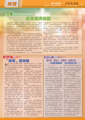 第 3085 期 主曆 2023 年 10 月 8 日(禮拜日) http://ChristianWeekly.net 輿情 2坊間熱議「夜經濟」、「夜繽紛」,攪活夜市,言下之意,是發覺普羅市民習慣了放工之後回家吃飯,沒有了四出娛樂消費的衝動,這下子影響就大了,有是酒樓飯店捱不下去;有是旅客覺得香港太冷清,不符合東方不夜城的美譽,以後就不再來趁熱鬧;而最大的問題是,如果香港人再這樣下去,真的不再是活力香港了。觀乎此,值得借鑑的是教會又如何重新挑旺信徒的動力呢?堂會本身的活動是重要的,但帶領信徒參與香港基督教的活動也是重要的,目標不是要怎樣增長,而是要一起參與一些活動,盼望可重燃動力,寧可一思進,莫在一思停。在未來幾個月,值得我們參考的,一是在 10 月 25—31 日,由基督教出版聯會在尖沙嘴街坊福利會舉辦的第38屆聯合書展。正所謂「埋嚟睇、埋嚟揀」,對於我個人來說,時至今日,不同教會裏面仍然有這班被召作文字出版的弟兄姊妹,上帝在他們的身上,一定有着奇妙作為。我們要鼓勵弟兄姊妹去書展,去買書、去讀書、去分享、去寫作。五年前你可能覺得基督教聯合書展是理所當然,但今天一定是有召命、有感召,才會有這書展,用幾個日與夜的時段,帶幾個不同組別的弟兄姊妹出去尋書看文,相信總有得着。另外,香港華人基督教聯會在每年 11 月 1—7 日在尖沙嘴浸信會都有培靈奮興大會,今年是第 29 屆,講員是陳謳明大主教,主題是「天國的使命—從路加福音看耶穌的訓導」,這也是一個很好的聚會,一連七晚 ,可以全去,也可以按實際情況,找幾個晚上與團友組員先吃一個簡單晚飯,再一起參加培靈會,從團契吃飯到一起聽道。想想疫情的幾年,所有聚會都在雲上線上,多麼遙遠,也造就了我們不再腳踏實地地走出來,漸漸我們就會走開走遠!所以今年一定要行出來,今年都不來,下年還會走出來嗎?最後,好好善用今年聖誕節兩天公眾假期,剛好是禮拜一和二,即是要利用之前的禮拜五、六、日或是之後的禮拜三、四、五 ,趁着學校假期舉辦一些青少年的營會—很多青少年在疫情之時,都宅在家,邀請他們出來三日兩夜,宅在營會。禮拜六、日,再加上聖誕節,怎樣也要搞些節目,要如保羅所說:「凡我所做的,都是為福音的緣故,為要與人同得這福音的好處。」(林前九 23)。以上不是想推介活動,而是舉一些例子以分享一種想法,當下的教會,要用不同的方法和聚會來凝聚信徒,挑旺信徒。現在是 10 月初,正是好時機,事不宜遲,無論如何,總要找些人。教會之聲從夜經濟說起……教會(尤其是華人教會)有好些稱謂,不單止教外人多不明其所以,就算是返教會日子久的基督徒,也有很多誤會和錯用。就如「師母」和「師太」,前者因比較普遍,故用錯的機會也較多。其實若要把這稱謂用得精準,不單要好好掌握其本意,也要清楚分辨這究竟是「自稱」抑或「他稱」,是「謙稱」抑或「尊稱」;因為若弄不清楚,除了帶來閱讀上的「歧義」(ambiguity),更加會貽笑大方。「師母」一般指老師的妻子或牧師的妻子。英語沒有相應的稱呼,因西方文化看人是獨立的個體,不會把老師或牧師的妻子看為他的一部分。但華人社會不同,因特別尊師重道,連帶老師或牧師的妻子也尊稱「師母」(但醫生、律師、法官、立法會議員等等的妻子就沒享有此尊稱,只在丈夫銜頭後加上「夫人」兩個字)。惟必須留意的,是「師母」本是他稱和尊稱,是別人對她的稱謂。譬如說有位牧師名陳大文,他太太名黃小玲,那麼教友們多尊稱黃小玲為陳大文師母,或簡稱陳師母。但陳大文牧師可以叫他妻子「師母」嗎?也許在飲茶閒聊時口快的叫聲「師母」(例如:「我出門口時,必同師母 goodbye kiss),旁人聽來好甜蜜,也知道他說的是誰,但若用文字書寫下來,就很容易陷於歧義,帶來重重誤解。曾看過一篇文章,是位牧師寫他和妻子去旅行,但每次寫到妻子,他就不加思索的用上「師母」這個稱謂,例如「起床時看到師母睡得很甜」、「我知道師母饞嘴,特別買了美食來哄她」; 教友看了不以為然,但教外人看了就以為這個牧師的人格有問題。「師母」是尊稱而非自稱,所以陳大文師母黃小玲也不能自稱「黃小玲師母」;「師母」不是獨立而自足的個體,永遠倚仗於作為牧師的丈夫。這樣說來,黃小玲只可勉強自稱我是陳大文師母(但又不能說我是陳大文的師母),只差一個字,但意思就截然不同。至於「師太」, 原本出處是指出家尼姑,是庵堂的女性主持。而在金庸筆下,也有位武藝高強的滅絕師太。後來華人教會把「師太」這名詞用於尊稱牧師的母親,有時也用來尊稱享有高齡的信徒姊妹。差之毫釐,謬以千里。教會用詞也必須精準,絕對不能「差不多先生」,否則必惹來重重誤會。甲、巴刻生平簡述《全民神學家巴刻》一書是著名牛津大學學者麥葛福(Alister E. McGrath)於 1997 年完成的作品,子題為「從認識神到事奉神」(To Know and Serve God),正是英文原著書名。中譯本則於 2016年面世,增收了一篇由華人門生曾劭愷撰寫的萬言長文。傳記全書共十一章,止於巴刻轉到加拿大維真學院(Regent College)任教時期(1979-1996)。由於巴刻高壽至九十七歲才離世,他後期近四分之一世紀的事蹟便未能錄進書中。巴刻全名 James Innell Packer,於 1926 年 在 英 國 格 洛 斯 特 郡(Gloucestershire)鐵路工人家庭誕生。七歲時因意外重創頭骨,需要接受長期治療。治療期間,他開始沈醉於閱讀和寫