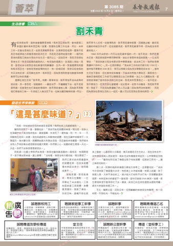 第 3085 期 主曆 2023 年 10 月 8 日(禮拜日) http://ChristianWeekly.net 薈萃 7「院長,你知道這怪怪的味道是甚麼嗎?我們在街上四處都嗅到。」醫院院長靜下一會,慢慢地說:「我估可能是屍體的味道。情況是,很多人在海嘯中被大海浪拖來拖去,最後撞暈,失救死了。還有貓、狗、牛、羊……不同動物也是同一命運。現在四處都有人和動物的屍體,埋在瓦礫中或雜物下。太陽猛烈,海水鹽分高,屍體開始脹大和發出惡臭,而且會愈來愈嚴重。我們根本沒有人手或設備去處理眼前這龐大需要。你們要小心,這裏的衛生環境一天比一天差。你們下去殮房看看便明白。」院長請一位護士帶我們去殮房。殮房在醫院最底層的一個角落,有兩間房子。房子傳出那味道。護士解釋:「沒有電,殮房沒有冷藏功能,情況壞透了。我們已要求政府那邊盡快把屍體埋葬,但很多屍體還未辨認出身分,這問題很燙手。」踏進房裏,那惡臭撲來,胃液又在攪動,一位同事走了出去嘔吐。三張枱面放着三具屍體,身體變黑變形,發脹了幾倍,形狀恐怖,蒼蠅不停在屍割禾青生活迴響窮遊世界學無窮龔立人趙煥明「這是甚麼味道?」(2)海嘯的破壞痕跡隨處可見。有很多朋友問,退休後會離開香港嗎?馬來西亞朋友問,會申請第二家園計畫來馬來西亞嗎?查實,我還有全職工作在身,所以,未來三年一定會在香港生活。若真是要離開香港,主要原因是經濟。重點不是是否有經濟能力承擔香港的高昂生活,而是是否值得這麼花費。一個月的香港的屋租已夠支付我在外地生活一個月以上。話說回來,我是否很想在香港生活?我是個喜歡四處跑的人,有很強的適應力,容易跟人搭訕。再者,基督徒身分使我容易在教會找到歸屬感,主內一家。我會選擇到英國和馬來西亞住。前者是我曾留學的地方,有一份親切感,我對日短夜長的冬天沒有反感,反而樂在其中。馬來西亞,因為我想到對當地教會和神學教育可以有些貢獻。選擇在港生活與「割禾青」有關。簡單來說,割禾青指禾苗未成熟時就收割,另一意思是,指賭錢時,一贏就收手,不繼續賭下去,這不是甚麼問題。但當發生在打麻雀的場境時,割禾青就會被人罵,因為割禾青製造打麻雀的三缺一,令其他三人無法玩下去,也無法贏回輸掉的錢。所以,割禾青令人忿怒。從賭博角度,割禾青是最有智慧,因逢賭必輸,最好是在贏的時候及早收手;但從遊戲角度,割禾青是最要不得,因為他沒有考慮其他人。1960 年代出世的一代可以說是最幸福的一代。這不是說,我們是豐衣足食。兩星期前跟中學同學相聚,彼此分享那時家庭的困難。一位女同學說,「我很多謝父母沒有要求我中學畢業後,就出來工作。他們給我學費讀中六和中七。」另一位男同學說,「我出來工作時的月薪只有1700元。當時每月學費約 200 多元,我可以想像父母為我交學費是很辛苦。」當時生活並不富裕,但社會有很多機會。不論成功考進大學與否,願意努力、進修及循規蹈矩工作就可以慢慢建立自己的事業。加上九七議題出現,留港者就填補了當時很多高職位的空缺,我是其中受惠者之一。這不是說,我不需努力,但我受惠社會變遷。從此看來,若我今日離港,我是割禾青呢!我留下,不是因為要讓輸了的人可以贏(因為我們沒有賭博),而是因為要陪在香港生活的人一起玩。讓人可以玩是我在香港的原因。親友沒有機會哀悼送別已逝者。聘職青傳道乙名聘牧養職青及家庭傳道,有負擔教導及傳福音,神學畢業。履歷瀝源街7號沙田娛樂城1B,沙田平安福音堂聘牧小組或電郵[email protected]招聘用誠聘幹事文書及行政工作,處理奉獻安排,支援各部事工,成熟主動,須周六日上班。履歷至[email protected]九龍深水埗巴城街43號香港聖公會聖多馬堂張先生收。招聘用誠聘辦公室幹事熟電腦操作,負責辦公室文書,支援教堂活動,主動熱誠重視團隊,需周六日工作。履歷電郵[email protected]或郵寄聖馬提亞堂元朗媽廟路9號主任牧師收。招聘用傳道(堂校事工)牧養婦女、長者及兒童。神學畢業,三年牧會經驗。主力策劃堂校福音事工。履歷電郵至[email protected]或寄九龍何文田邨適文樓地下何文田浸信會。只作招聘用。誠聘教牧同工小型堂會,神學畢業,成熟主動,團隊合作,牧養青少年、初職團契及婦女,支援兒童事工、差傳佈道、關懷探訪。履歷電郵[email protected]宣道會富山堂招聘用聘請家庭事工幹事銘恩浸信會誠聘全/兼職家庭事工幹事,有神學訓練或相關經驗優先。需重視團隊精神、主動熱誠,請將履歷電郵至[email protected]。資料只供招聘用。堂主任中華基督教會海南堂聘堂主任(牧師或宣教師),七年或以上牧會經驗。牧養教導、堂校合作、領導策劃。履歷電郵至[email protected](資料只供招聘用)誠聘傳道及學校傳道牧養婦女,長者,發展家庭及社區福音工作。堂校合作,帶領學生歸主。需神學畢業或具神學訓練優先,週六日工作。履歷至[email protected]香港聖公會聖巴拿巴堂招聘用身上盤旋。心裏感到十分難過,幾天前還是活生生的人,現在沒有名字、沒有機會跟親人朋友道別,親友也沒有機會哀悼送別。心中默默送別他們,……「醫院在附近借了幾個空房子存放屍體,但屍袋已用完。」護士無助地剖白。 第二天,同事約翰弄來幾個口罩給大家帶上,並興奮地說,「政府今次很快做了幾個重大決定,包括晚上 8 時後戒嚴,有軍人巡邏,除了救援人員,大家不准在街上,減少