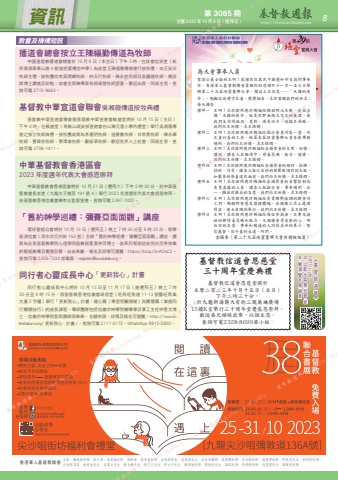 第 3085 期主曆 2023 年 10 月 8 日(禮拜日) http://ChristianWeekly.net 資訊 8香港華人基督教聯會 主席:鍾健楷牧師 副主席:余英嶽牧師 總幹事:陸幸泉牧師 出版部部長:吳思源先生 出版部顧問:翁傳鏗牧師 李志剛牧師 張振華牧師 許朝英先生 胡明添牧師 出版部委員:植栢燊先生 吳業立先生 蘇永權先生 黃文江先生 許立中先生 鄺偉衡牧師 關銳煊先生 梁銘牧師 李鴻標牧師 吳渭濱先生 關鎮威牧師播道會總會按立王陳福勤傳道為牧師中國基督教播道會總會於 10 月 8 日(本主日)下午 3 時,在該會信泉堂(新界葵涌華景山路 4 號迦密愛禮信中學)為該堂王陳福勤傳道舉行按牧禮,由王安洋牧師主禮,按牧團尚有莫潤輝牧師、林天行牧師、陳永就牧師及袁麗連牧師;楊詠嫦博士講道及訓勉;該會主席陳傳華牧師頒發牧師證書。歡迎出席,同頌主恩,查詢可電 2715-9683。基督教中華宣道會聯會吳湘薇傳道按牧典禮基督教中華宣道會聯會暨基督教中華宣道會鞍盛堂將於 10 月 15 日(主日)下午 4 時,在鞍盛堂(馬鞍山頌安邨宣道會台山陳元喜小學內禮堂)舉行吳湘薇傳道之按立牧師典禮。按牧團成員為李嘉明牧師、温寶儀牧師、甘家勇牧師、陳永輝牧師、曹偉彤牧師、黎澤崙牧師、鄺振華牧師。歡迎各界人士赴會,同頌主恩,查詢可電 3708-1411。中華基督教會香港區會2023 年度週年代表大會感恩崇拜中華基督教會香港區會將於 10 月 21 日(禮拜六)下午 2 時 30 分,於中華基督教會長老堂(九龍太子道西 191 號 A)舉行 2023 年度週年代表大會感恩崇拜,由基督教香港信義會楊有志監督宣道。查詢可電 2397-1022。「舊約神學巡禮:彌賽亞面面觀」講座環球聖經公會將於 10 月 13 日(禮拜五)晚上 7 時 30 分至 9 時 30 分,假學基浸信會(深水埗元州街 162 號)主辦「舊約神學巡禮:彌賽亞面面觀」講座,講員為宏恩基督教學院心理學院副教授黃葉仲萍博士。該系列幫助信徒明白活得快樂的聖經教導及實踐智慧,自由奉獻,報名及詳情可瀏覽:https://bit.ly/3nAOsC2。查詢可電 2356-7234 或電郵:[email protected]。同行者心靈成長中心「更新我心」計畫同行者心靈成長中心將於 10 月 13 日至 11 月 17 日(逢禮拜五)晚上 7 時30 分至 9 時 15 分,假基督教香港信義會頌恩堂(旺角旺角道 11-13 號藝旺商業大廈 2 字樓)舉行「更新我心」計畫:健心篇(學習照顧情緒)與關懷篇(掌握同行關懷技巧)的成長課程。導師團隊包括信義宗神學院輔導學及事工主任林雪文博士、信義宗神學院客席講師梁錦榮。名額有限,詳情及報名可瀏覽:http://www.leshalom.org/ 更新我心 - 計畫 /。查詢可電 2111-0172、WhatsApp 9812-5800。教會及機構短訊手機瀏覽本報網頁可以配合各類型智能QRCode《基督教週報》為大會事奉人員 聖潔公義全能的主啊!感謝祢從萬民中揀選和呼召我們事奉祢。香港華人基督教聯會靠賴祢的恩領於十一月一至七日舉辦第二十九屆培靈奮興大會,闡述上主訊息──「天國的使命」,勉勵信徒遵守主道,廣傳福音。求祢垂聽我們的祈求:每天禱告禮拜一 主啊!求祢按照應許賜福給陳謳明大主教,使他宣講「天國的使命」就是祢那無偽又完全的真理,使我們生命得拯救、更新,滿有活力,迎接主再臨。我們向主祈禱,求主憐憫。禮拜二 主啊!求祢按照應許賜福給執行委員同感一靈,作正直行善的工具,統籌本屆培靈奮興大會各樣事務順利。我們向主祈禱,求主憐憫。禮拜三 主啊!求祢按照應許賜福給各場聚會的主席、祈禱、讀經,讓各人在服侍中,得着恩典、能力、健康。我們向主祈禱,求主憐憫。禮拜四 主啊!求祢按照應許賜福給各場聚會的領詩、指揮、詩班、司琴,讓各人能以美妙的歌聲歌頌祢的大能,如馨香的祭直達祢面前。我們向主祈禱,求主憐憫。禮拜五 主啊!求祢按照應許賜福給各場聚會的音響控制及負責直播的人員,讓各人配搭合宜,事奉順利、合一,顯出祢榮美的旨意。我們向主祈禱,求主憐憫。禮拜六 主啊!求祢按照應許賜福給負責聯繫協調的聯會同工們,賜聰明智慧及強健體魄,在預備工作上處理得宜,使大會順利舉行。我們向主祈禱,求主憐憫。禮拜日 主啊!求祢按照應許賜福給每位參與者,主事及協助的都得着恩賜和能力,又預備會眾受教的心,明白祢的旨意,事奉和聽道的人同結美好的果子,堅信基督,從今直到永遠。阿們。金錫泰(第二十九屆培靈奮興大會祈禱組組員)基督教信道會恩慈堂三十周年堂慶典禮基督教信道會恩慈堂將於主曆二零二三年十月十五日(主日)下午二時三十分,於九龍新蒲崗大有街三號萬廸廣場15樓K室舉行三十周年堂慶感恩崇拜,歡迎弟兄姊妹出席,以證主恩。查詢可電2328-8699梁小姐。CMYCMMYCYCMYK2023 CBF_newsadv.pdf 1 29/9/2023 下午12:12基督教週報 Christian Weekly 基督教週報 Christian Weekly 基督教週報 Christian Weekly 基督教週報 Christian Weekly 基督教週報 Christian Weekly 基督教週報 Christian Weekly 基督教週報 Christian Weekly 基督教週報 Christian Weekly 基督教週報 Christian Weekly 基督教週報 Christian Weekly 基督教週報 Christian Weekly 基督教週報 Christian Weekly 基督教週報 Christian Weekly 基督教週報 Christian Weekly 基督教週報 Christian Weekly基督教週報 Christian Weekly 基督教週報 Christian Weekly 基督教週報 Christian Weekly 基督教週報 Christian Weekly 基督教週報 Christian WeeklyChristian Weekly 基督教週報 Christian Weekly 基督教週報 Christian Weekly 基督教週報 Christian Weekly 基督