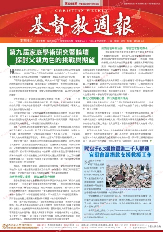 編輯及發行人:香港華人基督教聯會 督印人:陸幸泉 地址:九龍聯合道140號香港華人基督教聯會大樓二樓 電話:2337 4171 圖文傳真:2338 2314網 址:http://ChristianWeekly.net 電子郵箱:[email protected] 承 印:國強印刷制作公司 作者文責自負第3086期 主曆2023年10月15日 逢禮拜日出版.本期出紙三張.每份零售五元正本期推介 求主憐憫.吳思源 p.2∣ 被揀選的恐懼.梁遠耀 p.3∣ 「同工夏令退修會」上海、無錫、湖州、桐鄉.羅志祥 p.8阿富汗6.3級地震逾二千人罹難宣明會籲捐款支援救援工作第九屆家庭學術研究暨論壇探討父親角色的挑戰與期望村民徒手挖掘,嘗試從瓦礫下救出生還者。維護家庭基金已於10月9日,在網上舉行「第九屆家庭學術研究暨論壇2023」,當日除了發布「不同家庭成員眼中的父親角色」研究結果外,多位講員亦分享作為父親的挑戰,並建議社會、學校以不同方式支援父親。「不同家庭成員眼中的父親角色」研究於本年5至7月進行,以量性研究的問卷調查形式收集數據,成功收集891份有效問卷。香港樹仁大學商業、經濟及公共政策研究中心中心主任李樹甘博士指,研究目的旨在探討不同家庭成員對父親參與教養的評價、影響父親參與教養的因素,以及對父親角色的期望。研究主要部分,要求家庭成員就父親參與「管教」、「鼓勵」、「支持」、「照顧」等四個教養範疇作出評價。研究發現,父親對四個教養範疇的自我評價,均較其他家庭角色高;母親和子女的評價相對接近,專業人士對父觀的評價則為最低。至於期望差距方面,父親對四個參與教養範疇表現的期望,均高於實際自我評價,而子女對父親參與教養範疇的期望,則是所有家庭角色中最低。惟他特別提到在經濟支持方面,例如滿足孩子基本物質與需要、承擔為孩子提供經濟支持的責任上,母親對父親的評價高於期望。最後,研究問及父親參與教養所受的三項限制,所有家庭成員不約而同指「工作繁忙,沒有時間」和「不太清楚自己可以為孩子做甚麼」為兩大主要因素。其他限制包括,父親和母親均認為「侍產假不足夠」、子女認為「和太太的夫婦溝通並不理想」、專業人士認為「不懂如何教養孩子」。李樹甘博士表示,隨着多元性別意識抬頭及家庭結構變革,現代父親除了負擔家計,更被期望積極參與家庭生活,分擔教養子女責任。研究結果顯示,父親對父職的認知和實踐程度都有所提高,然而在個人因素和外在環境的壓力下,仍有不少障礙有待跨越。他解釋,疫情為家庭生活和關係帶來前所未有的挑戰,對父親教養能力的表現和信心產生負面影響;加上工時過長和教養知識不足,都限制了父親與子女建立親密關係,故子女普遍對父親關懷與陪伴能力不抱太大期望。 他認為,社會應提供資源、政策和培訓支援父親,提高父親的教養知識和技巧。此外,僱主應安排靈活的工作政策,如侍產假、彈性工時和遠程工作選項,使父親更容易平衡工作和家庭責任,有助鞏固家庭關係。年輕爸爸壓力嚴重 難以適應角色轉變基督教香港信義會社會服務部助理總幹事竺永洪先生分享「新世代爸爸的新需要—社區中孩子的成長與爸爸角色的挑戰」。他分享年輕爸爸無論計畫或非計畫,都經歷決定生產,身分轉變加入爸爸角色,對29歲以下的年輕爸爸壓力尤其大。機構早年曾於「賽馬會新世代爸媽支援計畫」服務研究報告,發現有57.1%年輕爸爸經常吸煙、25%飲酒及21.4%曾經濫用藥物;而年輕爸爸的壓力情況屬於嚴重或非常嚴重,較年輕媽媽為高。他指,與今次研究結果相若,年輕爸爸壓力源自於經濟、爸爸角色及夫婦關係,而工時長亦難以回應伴侶及孩子的期望,年輕爸爸亦不認識子女的需要。他續言,社會轉變帶來教養孩子的轉變,雙職家庭的父親不再像從前回家不用處理其他家庭事務;隨着父母教育水平提升,家庭趨向教育化,在管教上多了衝突。在照顧上,近十年多了很多跨代照顧,兩代人的溝通與協調,爸爸易成當中磨心。他認為爸爸需要被聆聽,如成立爸爸同盟互相支持。針對爸爸舉辦活動 學習型家庭助傳承家庭與學校合作事宜委員會主席方奕展先生分享「親職協作新契機 - 如何藉今天校園推動的家長教育,處理夫婦之間對爸爸角色期望的落差」。他直言,父親的教育方法多是來自於原生家庭、身邊朋友和尋找其他資訊,學校相對有更科學的方法。但學校即使舉辦各類活動幫助提升夫妻溝通關係,但出席者多是媽媽。他建議,可找同樣是爸爸的男教師去辦活動,他們較易體會同理,也可舉辦運動日、機械人體驗等活動,吸引爸爸出席。他認為,需要幫爸爸安排出席原因,如協助搬運等,而學校亦不應給予第三方營運活動,因過程中父母可向老師了解到子女情況,日常老師亦可多主動聯絡父親。他認為社會大環境要推動,而學習型家庭(Learning Family)可以幫助到家庭文化傳承,家庭成員各自成長,一同保持學習,家長亦可將人生看法傳承,學校則可幫助他們達成傳承目標。轉化父親威權心態 同行角色陪伴成長顯理中學校長吳浩然先生分享「今天豈只是談母嬰健康的年代?–社會對爸爸在孩子成長中角色的新期望」,他認為社會對「爸爸」的期望一直存在,卻十分模糊。他承認,爸爸在教養孩童、陪伴妻子上,有時確實會有出糗的場面,但限制卻可以成為優勢。他以學校舉辦親子活動為例,部分爸爸雖然在活動中出糗或說錯話,結果全場捧腹大笑,不