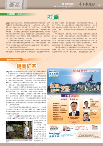 第 3086 期 主曆 2023年 10月 15日(禮拜日) http://ChristianWeekly.net 薈萃 5在崎嶇不平,彎彎曲曲的山路爬了一個多小時,四驅車走進努沃勒埃利耶(Nuwara Eliya)的茶園種植區,這裏海拔近 2000 米,比山下清涼不少。宣明會在這裏有長遠社區發展工作,協助貧窮家庭自力更生,長遠獲得生活基本需要,特別是孩子有上學及健康成長機會。很多家庭都是在茶園做散工,沒有穩定收入,茶葉收成季節會有多些工作。「熟手的女工一天賺得約一美元多的工資。」 路得(Ruth)說,她是本地人、負責這個社區發展項目的同工。 雨後,小路濕滑,上落窄窄的小石級探訪當地家庭。婦女們打開家門,分享她們簡陋但整潔的居所,分享她們的小故事及小願望。願望都是有多些穩定工作,孩子多讀書,將來有更好的工作機會。 「我帶你們去茶園那邊看看。」四驅車沿山坡轉了幾彎,薄薄雲霧中,眼前突然出現一望無際、矮矮的茶樹,覆蓋着每個山坡,整整齊齊,有一份仙氣,叫人神往。「這就是錫蘭紅茶種植場,是英國人統治多年留給我們的一份遺產。到今天,茶葉出口仍是我們斯里蘭卡的重要收入。努沃勒埃利耶的高山區的地形及氣候能種出最好的茶。」路得用心地解釋。 「這就是小時候已開始聽聞的錫蘭紅茶(Ceylon Tea)!」心裏有一份欣喜。小時候,墟上的冰室和士多常常見到「錫蘭紅茶」的廣告海報,覺得名字很醒目,腦海會想像錫蘭是個很美麗的地方,能種出這樣出名的錫蘭紅茶。 茶樹林中,有戴着紅頭巾的婦女們彎下身採茶,每人背部都背着一個竹籮,放着採下的新鮮茶葉。路得大聲向她們打招呼,她們也抬頭向我們揮手,滿臉汗水和笑容。 「回程下山路上,我們會經過一些賣茶的茶舍,我們可喝杯茶和上廁所。」路得催趕我們上車,希望入黑前要回到旅館,這是安全指引。打氣 生活迴響窮遊世界學無窮龔立人趙煥明錫蘭紅茶退休可以是很自由的人生,不需再要滿足機構給你的責任或指標,也不用請假,但我總想起耶穌向彼得說的話,「你年輕的時候,自己束上帶子,隨意往來;但年老的時候,你要伸出手來,別人要把你束上,帶你到不願意去的地方。」(約廿一 18-19)約翰福音作者加上註腳,「指彼得會怎樣死來榮耀神。」我不會將自己看成為彼得,但彼得的遭遇向我們說,原來年老或退休不必然如想像中自由自在,所謂退出江湖,更可能另有使命。使命沒有因年齡而消失,卻因年齡而變化。那麼,我看我退休使命之一是為青年人打氣。青年人泛指比我年輕的人(20-40 歲)。九月底要到馬來西亞開會,我「順道」(查實是專程)到越南的河內和胡志明市。因六月時曾指導兩位越南學者,所以,希望專程探望他們,為他們打氣。這是資深者或退休者可以為年輕人和後輩做的事,不是倚老賣老,所以,我會減少他們可以對我的款待。生活在胡志明市的年輕人帶我參觀她的學院,與其系主任見面。後來,找個地方飲茶,聆聽她的生活點滴、分享她的研究。她表達她想多做宗教研究。我問,「越南是一個社會主義國家,研究宗教與文學似乎較安全。」她說,「我們從小就沒有機會認識宗教。我真的很想做宗教研究呢!」這使我想起 1980 年代的中國青年對宗教的渴求。我問,「你一個人在這城市生活孤單嗎?」她答,「我已離婚。一個人生活有時會有些孤單。」拍拍她的肩膀,為她打氣。到馬來西亞出席「生態神學」研討會,竟遇上一位香港青年人在這邊實習。此外,相認了一位正在英國進修博士學位的馬來西亞青年人,我們是臉書朋友,但似乎沒有面對面傾談。交換了 Whatsapp,傾談了一會。盼望在十二月,我在英國可以「順道」見面,請她吃飯,為她在寒冷日子打氣。會議結束時,又遇上另一位曾經在 2018 年韓國有一面之緣的青年人,她向我詢問生態神學一事,我將講稿給她,讓她好好準備她在十月份的報告。打氣不是指指點點;打氣要同聲同氣(尤其對建制的批判);打氣是協助連繫(人物、資源);打氣是請客;打氣可以一次過,不一定要持續;打氣是聆聽和鼓勵。打氣只是一種「小動作」,他們是否記起從不重要。努沃勒埃利耶(Nuwara Eliya)茶園種植區盛產錫蘭紅茶。Christian Weekly 九月底要到馬來西亞開會,我「順道」(查實是專程)到越南的河內和胡志明市。因六月時曾指導兩位越南學者,所以,希望專程探望他們,為他基督教週報有因年齡而消失,卻因年齡而變化。那麼,我看我退休使命之一是為青年人打氣。青年人泛指比我年輕的人(20-40 歲)。九月底要到馬來西亞開會,我「順道」(查實是專程)到越南的河內和Christian Weekly 隨意往來;但年老的時候,你要伸出手來,別人要把你束上,帶你到不願意去的地方。」(約廿一 18-19)約翰福音作者加上註腳,「指彼得會怎樣死來榮耀神。」我不會將自己看成為彼得,但彼得的遭遇向我們說,原來年老或退休不必然如想像中自由自在,所謂退出江湖,更可能另有使命。使命沒有因年齡而消失,卻因年齡而變化。那麼,我看我退休使命之一是為青年人基督教週報休可以是很自由的人生,不需再要滿足機構給你的責任或指標,也不用請假,但我總想起耶穌向彼得說的話,「你年輕的時候,自己束上帶子,隨意往來;但年老的時候,你要伸出手來,別人要把你束上,帶你到不願意Christian Weekly 打氣基督教週報主曆 2023年 10月 15日 Christian Weekly第 3086 期 (禮拜日)Christian Weekly 會。很多家庭都是在茶園做散工,沒有穩定收入,茶葉收成季節會有多