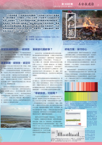 第 3086 期 主曆 2023年 10月 15日(禮拜日) http://ChristianWeekly.net 主曆 2023年 10月 15日(禮拜日) 7文:林慧琪(基督教自然保育及環保組織「生命草」同工)圖:林慧琪、網上圖片 上月香港經歷了十號風球和連場暴雨,大家有被大自然的力量震懾嗎?風從哪裏來,往哪裏去,只有上主知曉,今回更多人談論極端天氣來自「氣候變化」。大氣的流動看似隨機,實為順應背後的物理規律,各有其時。四季的變化相對穩定,讓生物的生長配合其年度規律,農業社會的民間智慧如春播、夏長、秋收、冬藏,亦是配合氣候而作。不同氣候協助調節地上和海洋的多變生態,滋養眾生。今期就讓我們了解既熟悉又陌生的「天氣」和「氣候」。改變氣候的元兇—碳排放九月的五百年一遇大暴雨,不少論述指與氣候變化引起的極端天氣相關,而元兇離不開過量的碳排放。讓我們仔細認識這個神奇的「碳」(Carbon,C),為何威力如此巨大。溫室氣體、碳排放、碳足印空氣中有些成分有吸收紅外線(熱能)的能力,最為人熟悉的是二氧化碳和甲烷(Methane,CH4),它們協助保持地球溫暖,所以稱為溫室氣體,令地球上的生命有合適的居住條件。然而近百年因為人類活動,大量增加大氣中的溫室氣體,尤以二氧化碳為甚,這些額外的溫室排放就稱為「碳排放」,量度單位以噸計算(CO2e)。即使是其他溫室氣體,如同一份量的甲烷吸熱能力是二氧化碳的 21 倍,則會轉換計算。現時地球主要的碳排放來源是燃燒化石燃料,按香港政府 2020 年統計資料,首要的碳排放來自發電,佔整體六成以上,其次是運輸相關(接近兩成),以及廢物處理(約 9%)。我們的起居飲食全部涉及碳排放,就是我們的「碳足印」(Carbon Footprint)。香港人的人均碳足跡,屬亞太區第三名,全球第十四名,若全球人口按我們的碳足印生活,需要約 4.4 個地球才足夠。氣候變化關碳事?如前文所言,溫度會影響空氣和水氣的流動。當太陽持續為地球供應能量,人類產生的碳排放持續增加,地球就像蓋了一層厚厚的被,熱能被困在大氣層無法散失,令到全球暖化,平均氣溫上升。每上升攝氏一度,足夠改變一貫的空氣與海洋流動形態(pattern)。所謂牽一髮動全身,除了影響天氣系統,二氧化碳十分容易溶於水,令海洋儲存了大量二氧化碳。海水溫度提升不止影響洋流,亦會減低吸收大氣中二氧化碳的能力!另一邊廂,溫度提升有助大氣中累積水氣,形成更多特大暴雨與超強颱風。近年夏季在高緯度國家出現極端酷熱天氣,甚至大量山火,也是源於本來流經那些地區的冷洋流減弱,降低了溫度調節能力。香港 9 月不停出現的暴雨,原屬於初夏的五六月。還有天文台在四季都錄得屢破紀錄的高溫!我們習以為常的四季特性已慢慢起變化,正是全球暖化造成的氣候變化惡果。「零碳排放」可能嗎?大自然本身有其碳排放,生物呼吸就會排出二氧化碳,細菌將已死的生物分解就會產生甲烷,然而上主設計的大自然裏,物質能循環使用不浪費。一切有機物質都含有碳,於是種樹有「鎖碳」的效果——藉光合作用將空氣的二氧化碳與水結合為碳水化合物,變成植物身體的一部分,從而減碳。植物生長時會不停「吸碳」,死後若被其他生物分解或是被焚燒,當中的碳水化合物就會變回二氧化碳,釋放回大氣中,繼續供養其他植物。既然生活中不可能做到「零碳排放」,「碳中和」/「碳補償」計畫就提供另類出路:當我從事高碳排放的活動,就做一些「負碳排放」的活動如植樹,減低甚至中和自己生產的碳排放幅度,達至「淨零排放 net zero carbon emission」。現時外國已有專門機構為減少碳排放而植樹、保護濕地等工作,巿民可以購買他們的服務來補償自己的碳足跡。終極方案:保守你心人類因着科技發展,發展不同的碳滙方法,卻忽視人類其實無法駕馭上主所創造的精細大自然,也忽略今天我們已經可以透過減少自己的碳足跡,減少影響。香港人熱愛旅遊以舒緩生活和工作的壓力,本無不妥。然而航空業的碳排放比陸地運輸高很多。植物生長吸碳需時,一年少飛兩次、改為每次逗留長一點時間,或是以短途為主可以嗎?還是由根源着手,思考我們的生活工作模式,減低壓力,或者選擇其他低碳的閒暇方案?當我們的心靈不再被生活擠得滿滿的,才有空間留意身邊的人和事;唯有我們願意學習以上主的眼光看世界,愛衪手所造的一切,才會在意自己會否不小心成為氣候變化的幫兇,虧缺了上主的榮耀。使用再生能源能夠大幅減低發電產生的碳排放。若想將樹木中的碳成分牢牢鎖住,木頭就需在缺氧環境加熱成炭(Charcoal)或是維持「木頭」的狀況如成為傢具,像倉庫般保存當中的碳成分,稱為碳滙(Carbon sink)。有些航空公司在你購買機票時,可按你的飛行里程一併購買碳抵償 / 補償方案。像香港飛台北來回只需要多付 約 20 元, 我 們是否願意為愛護環境支付這「額外開支」?電費單如實反映你家主要的碳排放情況。用冷氣的夏季明顯比不用冷氣的冬季耗電量高一倍有多。圖片顯示由 1970 年至 2018 年的數據,上半是按氣溫變化顯示,顏色愈紅代表當年的全年平均溫度相比平均值升幅愈高。下半是按生物多樣性顯示,愈綠代表物種數量愈多。可見隨着全球暖化,愈來愈多物種無法生存,只剩下灰色。圖源:biodiversitystripes.infoClear18°15°14°16°20°19°City Name 23 MAY 2016狂風起了— 天氣與 氣候概述
