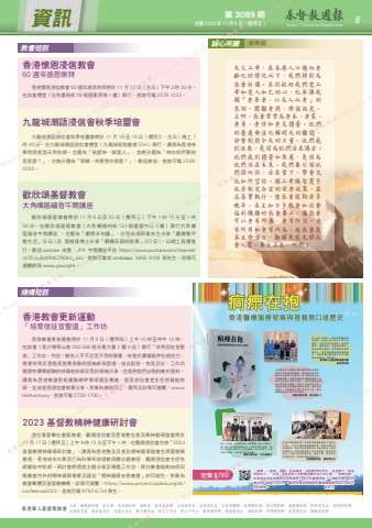 第 3089 期主曆 2023 年 11 月 5 日(禮拜日) http://ChristianWeekly.net 資訊 8香港華人基督教聯會 主席:鍾健楷牧師 副主席:余英嶽牧師 總幹事:陸幸泉牧師 出版部部長:吳思源先生 出版部顧問:翁傳鏗牧師 李志剛牧師 張振華牧師 許朝英先生 胡明添牧師 出版部委員:植栢燊先生 吳業立先生 蘇永權先生 黃文江先生 許立中先生 鄺偉衡牧師 關銳煊先生 梁銘牧師 李鴻標牧師 吳渭濱先生 關鎮威牧師教會短訊每一次疫情,我們總想起一羣醫護人員日以繼夜、盡心竭力地守護這個地方。細閱本書的故事,我的心靈被他們的所行所想觸動。盼望這羣忠心服侍者的經歷,能成為你們的鼓勵。華英中學校長 尹志華博士主耶穌作為人類靈性與身體最偉大的醫生,曾賦予門徒醫治的權柄,幫助患病的信眾。歷代信徒秉承主的教導,除了傳福音以外,亦贈醫施藥,發展宣教地區的醫療服務。本校與另外兩所中學的學生,有幸跟隨香港浸會大學歷史系教授,學習以口述歷史形式,記載香港基督教醫療服務的發展;讓受惠的香港人,了解教牧先賢所付出的心血,並承擔醫療服務背後的信仰精神。協恩中學校長 梁少儀女士從 1843 年開始,香港首辦醫務傳教醫院,跟着 1893 年成立那打素醫院,其後有信義會醫院、浸信會醫院、播道醫院、香港港安醫院、基督教聯合醫院、靈實寧養院等相繼成立,基督教藉醫療服務傳揚福音,此書詳盡記載香港百多年的醫療服務發展,值得推介。香港華人基督教聯會總幹事 陸幸泉牧師我校同學透過參與「香港基督教醫療發展口述歷史計畫」,不單了解到教會贈醫施藥、惠澤社羣的歷史和精神,更深受訪談對象的人生使命感染。期望同學能以一眾基督教醫療工作者為榜樣,傳承基督使命,在各行各業貢獻社會,造福人羣。訪談文章能結集成書,絕對值得推薦給大家。英華書院校長 鄭鈞傑先生香港華人基督教聯會為慶祝創會一百零五週年暨《基督教週報》創刊五十五週年,於二零二零年十二月出版《痌瘝在抱:香港醫療服務發展與基督教口述歷史》專書,藉此探討基督教「全人醫療」的理念如何於香港落實,並深化宗教及通識教育,讓年輕一輩認識香港教會在醫療系統的貢獻和參與,彰顯教會在社區的見證。專書由香港浸會大學歷史系黃文江博士主編,他率領 29 名歷史系大學生、66 名協恩中學、英華書院及華英中學的中學生,訪問 23 位香港基督教醫療界舉足輕重的人士,包括教會牧師、信徒領袖、基督徒醫生、護士和院牧等,藉着受訪者的真知灼見,讓教會重新反思在社會關懷的角色和使命,拓展基督信仰的廣度及深度。定價 $120「痌瘝」(粵音:通關)是指痛苦。從修辭學的界定,這是借代,意指受苦的人。「在抱」是指把別人的苦難放置於自己的心懷。「痌瘝在抱」的原意是從政者應明白民間疾苦。用之於醫療語境,「痌瘝在抱」的同義詞是「醫者父母心」,顧名思義是把醫者的專業精神類比為父母對子女的親情。 黃文江香港懷恩浸信教會60 週年感恩崇拜香港懷恩浸信教會 60 週年感恩崇拜將於 11 月 12 日(主日)下午 2 時 30 分,在該會禮堂(北角書局街 28 號國賓商場 1 樓)舉行,查詢可電 2578-1233。九龍城潮語浸信會秋季培靈會九龍城潮語浸信會秋季培靈會將於 11 月 18 至 19 日(禮拜六、主日)晚上 7時 45 分,在九龍城潮語浸信會禮堂(九龍城衙前圍道 55A)舉行,講員為香港神學院院長張天和牧師。主題為「敬愛神,誠愛人」,首晚分題為「神向你所要的是甚麼?」,次晚分題為「耶穌,祢要我作甚麼?」。歡迎參加,查詢可電 2339-0220。歡欣頌基督教會大角嘴區福音午間講座 歡欣頌基督教會將於 11 月 8 日及 22 日(禮拜三)下午 1 時 15 分至 1 時50 分,在歡欣頌基督教會(大角嘴通州街 123 號國貿中心 2 樓)舉行大角嘴區福音午間講座 ,主題為「優閒半句鐘」,分別由馮炳業先生分享「讓運動平衡生活」(8 日 ) 及 黃植禧博士分享「聽聽石頭的故事」(22 日 )。以網上直播進行,歡迎 youtube 收看,JPA 午間講座平台 https://www.youtube.com/channel/UCfDJyj8qftB4CZ9Dk3j_IxQ,查詢可電或 whatsapp 5962-3108 郭先生,詳情可瀏覽網頁 www.jpa.org.hk。香港教會更新運動「培育信徒宣聖道」工作坊香港教會更新運動將於 11 月 9 日(禮拜四)上午 10 時至中午 12 時,在該會(長沙灣青山道 260-266 號永隆大廈 2 樓 A 座)舉行「培育信徒宣聖道」工作坊。內容:教牧人手不足是不爭的事實,牧者於講壇服侍倍感吃力,需要培育及發掘具宣講恩賜的領袖參與證道,彼此配搭。有見及此,工作坊邀請有實戰經驗的徐健能牧師及受訓領袖分享,並提供他們自製的教材資料。講員為香港教會更新運動總幹事梁國全傳道、宣恩浸信會堂主任徐健能牧師,並由宣恩浸信會執事分享。對象為教牧同工,費用及詳情可瀏覽:www.hkchurch.org,查詢可電 2728-1700。2023 基督教精神健康研討會浸信會愛羣社會服務處、觀潮浸信會及香港整全普及精神健康協會將於11 月 17 日(禮拜五)上午 9 時 15 分至下午 1 時,在觀潮浸信會合辦「2023基督教精神健康研討會」。講員為香港整全及普及精神健康協會主席黃德興教授、香港城市大學及行為科學系助理教授關志健教授、觀潮浸信會主任牧師鄭佑中牧師。研討會將透過主題分享及專題工作坊,探討教會能夠如何回應教會內外的精神健康需要及建設「精神健康友善教會」的可能性。對象為教會羣體及基督教機構,詳情可瀏覽:https://