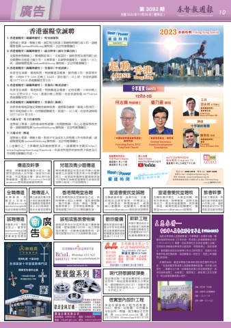 第 3092 期 主曆 2023年 11月 26日(禮拜日) http://ChristianWeekly.net 廣告 10歡欣僱傭嚴格挑選菲印傭工適合不同家庭需要提供專業顧問服務經驗豐富服務真誠查詢21558177信實室內設計工程承 造 各 類 裝 修 工 程 包 括 教 會、NGO、 學 校、 幼 稚 園、 中 西 醫 及牙科診所、商舖、寫字樓及住宅等網 頁 www.bhd.com.hk 電 話24130988 WhatsApp94613739香港靈糧堂誠聘1. 香港靈糧堂 ( 銅鑼灣總堂 ) - 牧兒部部牧道學碩士畢業,積極主動,制訂牧兒部事工策略和相關行政工作。請繕履歷電郵 [email protected] 陳牧師,並註明應徵職位。2. 香港靈糧堂 ( 銅鑼灣總堂 ) - 福音幹事 ( 兩年全職合約 )支援教會推動線上 / 數碼創意事工、文案設計,協助管理及運用網上社交媒體和其他電子媒介等。大專畢業,具神學裝備優先,須週六、日上班。請繕履歷電郵 [email protected] 陳牧師,並註明應徵職位。3. 香港靈糧堂 ( 銅鑼灣總堂 ) - 堂務員 ( 中更清潔 )負責堂址清潔、場地佈置、物資搬運及雜務、接待處工作、按需要外勤。工時由下午 1:00 至晚上 10:00,須在週六、日上班。有意者請致電 25774216 香港靈糧堂勞主任。4. 香港靈糧堂 ( 銅鑼灣總堂 ) - 堂務員 ( 晚更清潔 )負責堂址清潔、場地佈置、物資搬運及雜務、定時巡樓。工時由晚上9:30 至翌日早上 7:30,逢週日晚上例假。有意者請致電 25774216香港靈糧堂勞主任。5. 香港靈糧堂 ( 銅鑼灣總堂 ) - 堂務員 ( 維修 )負責教會場地設施定期檢查維修保養、處理緊急維修、跟進工程項目、執行其他指派工作,有相關經驗優先,須週六、日上班。有意者請致電25774216 勞主任。6. 大埔分堂 - 堂主任兼校牧道學碩士畢業,具牧會或校牧經驗,有開創精神,有心志發展學校堂會,請繕履歷電郵 [email protected] 陳牧師,並註明應徵職位。7. 大埔分堂 - 傳道道學碩士畢業,積極主動,對青少年及成年人的牧養工作有使命感,請繕履歷電郵 [email protected] 陳牧師,並註明應徵職位。( 上述職位之「主要職責及詳細資歷要求」,請瀏覽本堂網頁 http://www.lingliangchurch.org/Facebook。申請者所提供的資料將予保密及只作招聘有關職位用途。)新新工程承接水電油漆泥水各項裝修工程取價公道歡迎教會及主內肢體電90819077免費報價陳弟兄全職傳道神學畢業,牧養成人及青年。繕歷[email protected]海怡浸信教會招聘用教會幹事行政文書財務,熱誠主動中學畢業周六日需上班,履歷寄西貢新安村97號西貢浸信會招聘用兒區及青少區傳道聘神學畢業且有意在駐中學小組教會建立及發展兒童及青少年群體的同工。有意請寄履歷至觀塘翠屏道102號新生命教育協會新生命福音堂招聘小組收(只供招聘用)傳道及幹事傳道:神學畢業牧養青少成人,履歷見證諮詢人及待遇。福音及行政幹事:中英電腦文書,辦公室行政聚會事務。履歷[email protected]香港真道教會招聘用現代詩歌鋼琴彈奏想自彈自唱?留意到團契和小組缺乏司琴?相信這簡易彈奏方法幫到你,歡迎聯絡95089181,年齡不限,今期也招收退休人士,上課地點:太子或上水。香港閩南堂急聘本堂急聘牧師及宣教師各乙名,具神學學士或以上學歷,富牧會經驗,專注牧養、培育、傳道、關懷、發展等事工,並帶領各類聚會,有意者請電28932242聯絡蕭牧師。宣道會愛民堂誠聘全職教會幹事,負責行政、文書、財務及自修室管理。中學或以上,成熟委身,熟電腦操作,處事細心重團隊,經驗優先。繕履歷[email protected]高牧師收招聘用誠租或售教會物業誠租或售深水埗荔枝角道三樓教會物業。建築面積2380呎,地方開揚無柱實用。合教會或機構使用。詳情可致電96292314與陳幹事洽談。宣道會愛民堂聘牧全職牧養中學生、大專至初職、開拓外展佈道。神學畢業,成熟主動有活力,委身佈道重團隊,具牧養、佈道、教導恩賜及經驗優先。履歷至[email protected]招聘用誠聘傳道牧養青少年、職青及男士,履歷寄[email protected]宣道會將軍澳堂招聘用聘傳道人獨立教會牧養兒青少具牧會經驗優先主動願配搭履歷長洲大石口西灣路1號永光會堂招聘用是次講座共吸引了二百三十八位人士出席。主恩永偕─香港華人基督教聯會百年史(1915-2015)為配合香港華人基督教聯會(下稱聯會)百週年活動,聯會出版部特別出版《主恩永偕─香港華人基督教聯會百年史(1915-2015)》專書。由吳思源先生及李金強博士合編,並得到本港教會史學者李志剛牧師、邢福增博士、吳梓明博士、黃彩蓮牧師及彭淑敏博士等合力研究撰文,從過去片段殘卷中追溯先賢創會,促成教會合一的宏志,見證上帝福臨香江的恩典。本書的出版,冀望如聯會主席胡明添牧師在書中序言所說:「盼望前賢對香港華人基督教聯會的貢獻,可作後人的指引。」專書共分十章,按聯會各部事工詳述發展歷史,其中包括佈道事工、社會事工、賑濟事工、教育事工及文字事工,盼以前賢貢獻成後人指引。合編:吳思源、李金強出版:香港華人基督教聯會頁數:二百八十三頁定價:港幣一百六十元正