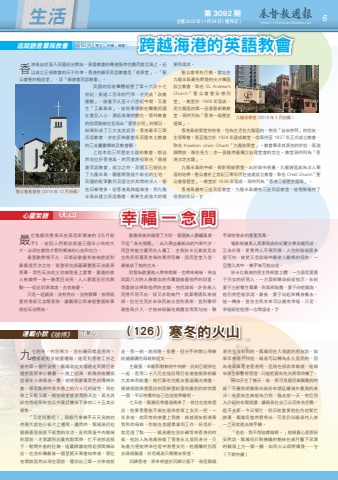 心靈絮語追蹤語言羣族教會香港島自從落入英國佔治開始,基督教會的傳道服侍也隨而踏足島上。若以成立正規教會的日子作準,香港的最早英語教會是「佑寧堂」、「聖公會聖約翰座堂」、及「循道會英語教會」。英國的信徒羣體經歷了第十六及十七世紀、長達二百年的鬥爭,才完成「改教運動」。接着不久至十八世紀中期,又產生「工業革命」。這些事情都在觸動英國社會及人心,湧起急激的變化。那時教會的信仰路線也呈現出「愛恨分明」的情況,結果形成了三大支流派別。香港最早三間英語教會,亦在反映着當年英國本土教會的三支屬靈傳統及教會觀。上述本地三所歷史久遠的教會,都自然地位於香港島。然而當原初取名「循道會英語教會」成立之時,英國又已經佔治了九龍半島。隨着開發這片新佔的土地,英國的駐軍數目及居住於其間的洋人,都在日漸增多。從香港島跨越海港,到九龍半島去建立英語教會,漸漸生成強大的需要和渴求。聖公會率先行動,選址在九龍半島最先開發的尖沙嘴區設立教會,取名 St. Andrew's Church「 聖 公 會 聖 安 德 烈堂」。教堂於 1906 年落成,是九龍區的第一座基督新教教堂,現時列為「香港一級歷史建築」。香港島佑寧堂的牧者,也為生活在九龍區的、崇尚「自由崇拜」的信徒,主理聚會;甚至協力於 1924 年建成教堂。信眾待至 1927 年正式成立教會,取名 Kowloon Union Church「九龍佑寧堂」。教會秉承其源流的宗旨,既強調開放,融合各方;亦一直維持着獨立自理堂會的定位。教堂現時列為「香港法定古蹟」。九龍半島的中部,相對稍後開發。出於城市規畫,九龍塘區成為洋人聚居的地帶。聖公會於上世紀三零年代在這處設立教會,取名 Christ Church「聖公會基督堂」。教堂於 1938 年落成,現時列為「香港三級歷史建築」。香港島擁有三座英語教堂,九龍半島擁有三座英語教堂。這情勢維持了很長的年日。九龍佑寧堂 (2019 年 3 月拍攝 )聖公會基督堂 (2019 年 12 月拍攝 )第 3092 期 主曆 2023年 11月 26日(禮拜日) http://ChristianWeekly.net 生活 6幸福一念間跨越海港的英語教會李碧如區伯平(撰文、拍攝、繪圖)最近進戲院看馬田史高西斯導演的《花月殺手》,皆因人們都說長達三個半小時的大片,必須在戲院才看到導演的心血和功力。最喜歡開場不久,印第安歐塞奇族被趕逐到最偏遠荒涼之地,竟發現地底蘊藏豐富石油資源那幕,黑色石油從土地噴發直上雲霄,圍着的族人被噴得一身一臉黑且油亮,人人歡喜若狂地舞動——從此財源滾滾,衣食無憂。只是一組鏡頭,沒有旁白,沒有解釋,拍得既富詩意卻又言簡意賅,讓觀眾立即掌握整個故事就從石油開始。歐塞奇族的確發了大財,個個族人腰纏萬貫,不但「身光頸靚」,出入乘坐最新出的汽車代步,而且有能力僱用白人傭工,主角狄卡比奧就是女主角莉莉葛萊吏東的專用司機,因而登堂入室,最後成了她的丈夫。財富為歐塞族人帶來物質,也帶來禍端,來自四面八方的人像嗜血的秃鷹覬覦着他們的財富,想盡辦法榨取他們的金錢,包括謀殺,許多族人死得不明不白,卻又求助無門,就算聘請私家偵探,也往往死於非命而無法查到真相,直到聯邦調查局介入,才抽絲剝繭地揭露官商黑勾結,聯手謀財害命的重重黑幕。電影根據真人真事寫成的紀實文學改編而成,正由於真,更看得人不寒而慄:人性的陰暗面多麼可怕,貪婪又是陰暗中最使人顫慄的惡欲,一旦墮入其中,幾乎無可能自拔。狄卡比奧演的男主角相當立體:一方面是愛妻子兒女的好男人,一方面卻聽命叔叔指示,去給妻子注射慢性毒藥,到真相敗露,妻子向他質詢,他仍然拒絕承認。最後,妻子站起來轉身離去。這一轉身,宣告主角本來可以擁有幸福,只是,幸福卻從他那一念間溜走。《捨得》九七的冬,特別寒冷,洛杉磯同樣溫度時,體感絕對沒這麼糟糕。這是到香港工作之後的第一個平安夜,甄曉易從文福道走到窩打老道對面那家小餐廳,一路上迎風,飢餓和夜霧很容易令人哆嗦成一團。她使勁裹緊黑色的薄棉外套,那是剛來時意外遇上的六十元的貨色,現在穿上又輕又暖。她抬頭望望漆黑的天空,莫名其妙地想起那枚從公共電話機掉下來的二十五美分硬幣。「又是照舊吧?」兩個月來幾乎天天見她的侍應大姐在小紙片上邊寫、邊問時,甄曉易仍在適應着屁股底下板凳的冰涼。直到窩蛋牛肉飯端到面前,才意識到店裏有點悶熱,忙不迭抓起筷子,鬆開外套的拉鍊。這裏總讓她想起那間雜碎店。在洛杉磯最後一個星期天聚會結束後,那位老闆娘居然出現在面前,還說自己第一次來她就易完全沒料到的。甄瀚咫在入境處的朋友說,如果早幾個月找他,曉易可以轉為永久居民的,因為易媽算是老香港呢,但現在卻非常敏感,這類申請全都暫停受理,只能把資料先交齊等時機了。兩口子住了幾天,唉,那可是個百業艱難的時候,不要勞師動眾向政府申請延續海外雇員的身分,老朋友也無能為力呢。臨走前一天,有位別人介紹的老闆提議:讓曉易在自己公司掛名任職,但不支薪。今日幫忙,明日就會要他在內地幫忙辦事,甄瀚咫當然看得出,可是仍叫曉易待人家一上班就過去辦手續。「爸爸,我不想這樣做啊。」她順着心底那份安然說,甄瀚咫只剩幾縷的髮絲在歲月鑿下深溝的額頭上方一顛一顫,如同火山即將爆發……(下期待續)走,那一刻,她很窘,很窘,但分手時開心得像給媚媚讀完母親節短文…