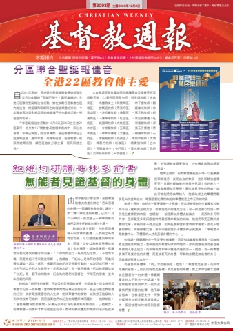 編輯及發行人:香港華人基督教聯會 督印人:陸幸泉 地址:九龍聯合道140號香港華人基督教聯會大樓二樓 電話:2337 4171 圖文傳真:2338 2314網 址:http://ChristianWeekly.net 電子郵箱:[email protected] 承 印:國強印刷制作公司 作者文責自負第3093期 主曆2023年12月3日 逢禮拜日出版.本期出紙二張半.每份零售五元正本期推介 立志警醒 迎接主來臨.葉子良p.3∣新會員堂巡禮.上村基督徒佈道所 p.4-5∣處處是芳草.李碧如 p.6鮑維均研讀哥林多前書無能者見證基督的身體分區聯合聖誕報佳音全港22區教會傳主愛由環球聖經公會主辦,基督教宣道會北角堂合辦之「活出基督的身體——再讀哥林多前書」講座,第二講「辨明主的身體」已於11月25日舉行,由美國三一神學院新約教授及系主任鮑維均博士主講。鮑維均博士提到,古時民間傳統不同宗教的聖禮,人們視之為有特別功能,可以透過聖禮與神明相交;同樣,信徒以為參與聖禮就能與上帝有關係,成為保護網,保羅就針對此錯誤的觀念作回應,「『你們如此行,為的是記念我』,不是吃和喝,而是背起十字架跟從耶穌。」他續言,「記念」是敬拜的意思,同義詞還有讚美、認信、感恩,保羅所談的記念是帶着行動的,或說話或行善。他特別引述以色列人失敗歷史,是因為忘記上帝,敬拜偶像,所以他提醒信徒「忘記」是一個不忠的動作,記念為的是明白基督在十字架死的意義,並作出合適的回應。他指出「辨明主的身體」所談及的是基督的身體,亦即教會。前文曾提及教會忘記合一的身體,當時聚會中間有分黨分派的紛爭,甚至可能是有階層的分別,估計是指責富裕的人先來,吃掉聚會中的食物,以致勞工階級的人到來時沒有可吃的,因而指責他們忘記主的身體原本同屬於一,他歸納說:「基督身體為我們擘開,分黨分派的行為是最背叛耶穌的死。」他笑言,彷彿教會一同崇拜才有可能發生紛爭,有時不參與團契和崇拜似乎少犯很多罪。他強調教會需要進步,才有機會散發出基督的香氣。鮑博士提到,初期教會慶祝主日時,以聖餐慶祝耶穌復活,表明自身的軟弱,宣告耶穌被羞辱至死,甘願在最無能的光景中見證上帝的能力。而教會羣體就是聖禮,藉信徒看見神的恩典,如此行就能將恩典帶給人。他認為世上的羣體問題多是出於虛偽自大,唯獨基督徒標榜無能的羣體就是上帝工作的時候。鮑博士直指,由於合一需要圍繞一定意義,很容易被視為在位掌權者控制的手段,壓制異見的方法,故無論是目的還是方法,合一都是難以討論,特別是社會撕裂的時候。他續指,一般理解以身體去談論合一,是因為多元和共存,但保羅更多是回應當時希羅哲學家類似的比喻,他借用和更正關於身體的比喻。保羅刻意不提及肚腹,因為肚腹相當於當時的掌權者,亦是人慾望的標記,保羅顛覆比喻,用不同器官提及不體面部分更重要,「掌權者不是教會中心,不體面的人才是基督身體的中心。」他強調,保羅講的合一不是要控制羣體,而是指出掌權者要降卑,叫無能者見證福音的能力。當保羅提到教會紀律的問題時,亦再提醒福音是要在最卑微的人身上建立,而非將稅吏和罪人驅逐而達成合一。他指,合一的教會表徵不是復活後的身體,而是被釘死的身體,耶穌的身體是無能者的身分,因羞辱記號建立出合一。而基督的身體中 「的」字是種描述,他說:「教會就是基督,而非單是屬於基督。」因此信徒就是聖禮,就是基督的身體,對上帝存在最大證據就是基督合一的身體。保羅顛覆當時人們對合一的認識,見證無能者恩典的偉大,從而改變我們對現實的詮釋。他不諱言指出,在教會歷史中,得勢時候很多次都是最黑暗敗壞之時,反倒被壓制時就見到基督身體。鮑維均博士提醒不體面的人才是基督身體的中心。自2001年開始,香港華人基督教聯會傳道部每年12月均會舉辦「耶穌已降生、萬民樂繽紛」全港分區聯合聖誕報佳音活動,旨在鼓勵各區教會在區內報佳音,將溫暖和耶穌降生的福音傳遞給街坊。今年聯會再次與全港22區的教會攜手合作舉辦活動,祝福區內坊眾。今年聖誕報佳音活動於12月2日至24日在全港22區舉行,合共有167間教會及機構參與其中,同心合意將「耶穌已降生」的消息傳開。各區將會舉辦巴士巡遊報佳音、嘉年華會、商場報佳音、福音晚會、街頭佈道等活動,讓各區信徒分享主愛、居民同感主恩。大會邀請區長負責該區組織籌委會及策畫管理等相關活動,22個分區區長包括:郭星燁牧師(港島東區)、朱露茜女士(筲箕灣區)、林子富牧師(觀塘區),曾繁庭牧師(秀茂坪區)、羅雄光牧師(慈雲山區)、李祖耀牧師(塘黃區)、莫元和牧師(新蒲崗區)、陳仲康牧師(紅土區)、葉宏健傳道(旺角區)、姚國樑牧師(大角咀區)、梁遠耀牧師(深水埗區)、岑世顯牧師(荃葵區)、張玉芬傳道(將軍澳區)、林素華傳道(大圍區)、楊蘭琴牧師(石門區)、李錫賢牧師(西貢區)、李煥華牧師(大埔區)、陳蕙芳牧師(粉嶺區)、楊貴福牧師(上水區)、伍國榮先生(屯門區)、黃志東牧師(元朗區)及梁彩燕牧師(天水圍區)。荃葵區中華基督教禮賢會荃灣堂五旬節聖潔會荃灣堂尖沙咀潮人生命堂葵福支堂基督教宣道會大窩口堂基督教香港信義會天恩堂基督教銘恩堂葵涌堂葵盛浸信會城市睦福團契路得會黃鑑全人發展中心將軍澳區生命頌浸信會基督教宣道會將軍澳堂基督教宣道會調景嶺新堂基督教香港崇真會將軍澳堂基督教會忠愛