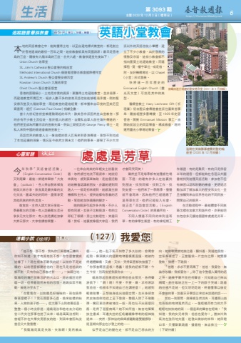 心靈絮語追蹤語言羣族教會本地的英語教會之中,能夠獲得土地,以至自建地標式教堂的,都是創立於香港建城的最初一百年之間。這些教會都具有英國淵源;最早是香港島的三座,隨後有九龍半島的三座,合共六處。教會依建堂先後如下:Union Church 佑寧堂St. John's Cathedral 聖公會聖約翰座堂Methodist International Church 循道衞理聯合教會國際禮拜堂St. Andrew's Church 聖公會聖安德烈堂Kowloon Union Church 九龍佑寧堂Christ Church 聖公會基督堂香港的面積細小,土地是珍貴的資源;要獲得土地建造教堂,並非易事。而建造教堂所費巨大,絕非人數不多的旅港英語信徒能够輕易承擔。例如聖安德烈堂及九龍佑寧堂,兩座教堂的建造經費,都幸獲來自印度的亞美尼亞裔富商、遮打 (Catchick Paul Chater) 捐獻全數。當十九世紀普世宣教運動潮起的年代,歐美各宗派固然差出宣教者;那時亦有不少教士及信徒、基於個人的感召,自費私自單人前往海外傳道的,他們甚至成為所屬宗派的宣教先鋒。例如上期提及的 George Piercy 俾士,是私人來到中國的循道會義務宣教士。英語世界的教會人士,像這樣的單人匹馬來到香港傳道,意想不到地成了本地延續的現象,情況至今依然方興未艾!他們的事奉,凝聚了不少大宗派以外的英語信徒小羣體,建立了不少小教會。出於發展的情勢及宗旨,這些小教會都不指向置買土地建造教堂;而選擇租、買、樓宇單位,或是借、附、友好機構場地,以 Chapel ( 小堂 ) 形式發展。快 將 達 一 百 年 歷 史 的 Emmanuel English Church ( 靈光英文堂 ) 可說是其中的典型。醫療宣教士 Harry Lechmere Clift ( 祈理廉 ) 初由聖公會傳道會差派往廣東省事奉,隨後經歷多番轉變,至 1929 年定居香港,開展 Emmanuel Mission 事工。由開始就設立的英語聚會,構成教會,現時運用靈光小學場地聚會。俯瞰由遮打捐建的聖安德烈堂 (2011 年 9 月拍輯 )遠眺在英倫籌募建費的聖約翰座堂 (2020 年 12 月拍攝 )第 3093 期 主曆 2023 年 12 月 3 日(禮拜日) http://ChristianWeekly.net 生活 6處處是芳草英語小堂教會李碧如區伯平(撰文、拍攝、繪圖)今年 秋 季「 英 語 會 話 活 動 」(English Conversation Circle)又到尾聲,最後一節通常舉辦「大食會」(potluck),各人帶自製家鄉食物與大家分享,飲食真是最快樂的文化交流,圍桌共吃的同時,盡情享受其他民族的特色美食。進食前,主持人請大家分享這一季最難忘的活動。有人說最難忘是分享多元文化那次,有人說是講述加拿大節日那次,大家愈講愈興奮。一位來自南美的年輕女士說着說着,忽然感性地流下眼淚來。她說初來異地,感到孤單無助,是這個活動給她機會認識新朋友,亦讓她遇到同路人——都是初來甫到,她感激主辦機構和主持人,提供這樣有意義的活動,幫助她加快適應的腳步。她的眼淚引起許多共鳴,不少人都有同感,女孩子比較眼淺,有的立即紅了眼睛;男士比較理性,笑着回應:對呀,這裏就像個大家庭,我們才會同哭同笑!雖然並不是每季都有這種感性場面,不過,的確有許多人在這裏找到朋友、找到同鄉、找到工作、找到支援……他們來了一季兩季,慢慢就不會再來,因為他們已經適應了溫哥華生活,他們已經投入社會,這正是「英語會話活動」(English Conversation Circle)的意義所在。不同人懷着不同目的來到溫哥華,有的拿學生簽證、有的拿短期工作簽證、有的是難民、有的只是停留半年的過客,但都能夠在各區公共圖書館找到這種英語活動,參加者不但有練習口語和聆聽的機會,更透過活動加深了解加拿大的歷史和文化,並且接觸到來自世界各地的不同民族,開闊自己的眼界。在活動過程中,最能體會不同族裔怎樣在加拿大和諧共存,亦更能明白包容多元讓這個國家處處是芳草。《捨得》「這不想,那不想,我為你打算還嫌三嫌四,你知不知道,我才有資格說不想!你怎麼會變成這樣了!?現在根本不聽我的話!以前你不是這樣的,以前甚麼都聽爸爸的,現在凡是爸爸說的都不對,只有你自己那套才對……」一如既往地,甄瀚咫的嘴巴就像忌妒的火山口,熔岩瘋狂地吞噬一切,但帶着前所未有的怨恨。易媽如常不敢勸,躲進浴室去了。「你看看你,以前還是好端端的,現在搞得像甚麼樣子!?我花那麼多心血,換來這樣的結果,人家的孩子都……」從太陽下山到夜幕低垂,整整一個小時沒停過,連曉易沒和他老友介紹的官二代交往那事也挖了出來。曉易萬萬沒想到,曾經不許在大學交男朋友的他,到頭來會因為沒當岳父大發雷霆。「我甄瀚咫真是失敗,失敗啊!竟然教出向,她戰戰兢兢地抽泣着,顫抖着,到達他跟前,空氣像凝住了。正當腦袋一片空白之際,她雙膝發軟,撲通一下跪倒。「爸爸,求求不要再罵了,爸爸,我愛您,無論您怎樣,我都愛您!」除了這令整個人驚愕的話之外,她幾乎聽不見任何聲音,只知道自己伸出兩臂,抱住喉結正在一上一下的脖子哭喊;跪着的彷彿不是她,但又明明是她,幹着懂事以後從不會做的事,說着牙牙學語以來從未說過的話……就在一剎那間,麻痺感全然消失,耳邊那山崩地裂般的咆哮戛然而止,一隻粗糙而有力的大手輕輕地拍拍她的頭,一個溫柔的聲音在呢喃:「我知道,我的女兒疼我,爸爸也愛你!」猶如冷熱氣流在強烈地交匯,迸發出微妙的祥和,她目瞪口呆,只懂默默跪着,摟着他,無言飲泣……(下期待續)個……」他一肚子氣不知憋了多久似的,愈罵愈起勁,像頭噴火的猛獸咆哮着橫衝直撞。她被