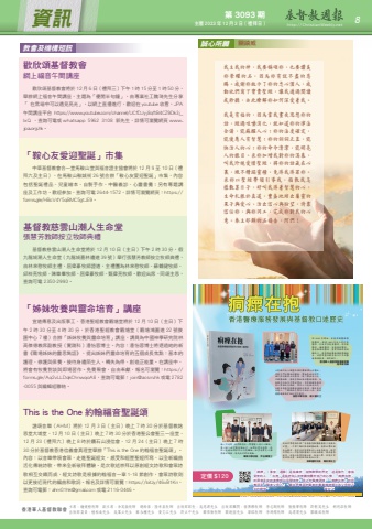 第 3093 期主曆 2023 年 12 月 3 日(禮拜日) http://ChristianWeekly.net 資訊 8香港華人基督教聯會 主席:鍾健楷牧師 副主席:余英嶽牧師 總幹事:陸幸泉牧師 出版部部長:吳思源先生 出版部顧問:翁傳鏗牧師 李志剛牧師 張振華牧師 許朝英先生 胡明添牧師 出版部委員:植栢燊先生 吳業立先生 蘇永權先生 黃文江先生 許立中先生 鄺偉衡牧師 關銳煊先生 梁銘牧師 李鴻標牧師 吳渭濱先生 關鎮威牧師教會及機構短訊每一次疫情,我們總想起一羣醫護人員日以繼夜、盡心竭力地守護這個地方。細閱本書的故事,我的心靈被他們的所行所想觸動。盼望這羣忠心服侍者的經歷,能成為你們的鼓勵。華英中學校長 尹志華博士主耶穌作為人類靈性與身體最偉大的醫生,曾賦予門徒醫治的權柄,幫助患病的信眾。歷代信徒秉承主的教導,除了傳福音以外,亦贈醫施藥,發展宣教地區的醫療服務。本校與另外兩所中學的學生,有幸跟隨香港浸會大學歷史系教授,學習以口述歷史形式,記載香港基督教醫療服務的發展;讓受惠的香港人,了解教牧先賢所付出的心血,並承擔醫療服務背後的信仰精神。協恩中學校長 梁少儀女士從 1843 年開始,香港首辦醫務傳教醫院,跟着 1893 年成立那打素醫院,其後有信義會醫院、浸信會醫院、播道醫院、香港港安醫院、基督教聯合醫院、靈實寧養院等相繼成立,基督教藉醫療服務傳揚福音,此書詳盡記載香港百多年的醫療服務發展,值得推介。香港華人基督教聯會總幹事 陸幸泉牧師我校同學透過參與「香港基督教醫療發展口述歷史計畫」,不單了解到教會贈醫施藥、惠澤社羣的歷史和精神,更深受訪談對象的人生使命感染。期望同學能以一眾基督教醫療工作者為榜樣,傳承基督使命,在各行各業貢獻社會,造福人羣。訪談文章能結集成書,絕對值得推薦給大家。英華書院校長 鄭鈞傑先生香港華人基督教聯會為慶祝創會一百零五週年暨《基督教週報》創刊五十五週年,於二零二零年十二月出版《痌瘝在抱:香港醫療服務發展與基督教口述歷史》專書,藉此探討基督教「全人醫療」的理念如何於香港落實,並深化宗教及通識教育,讓年輕一輩認識香港教會在醫療系統的貢獻和參與,彰顯教會在社區的見證。專書由香港浸會大學歷史系黃文江博士主編,他率領 29 名歷史系大學生、66 名協恩中學、英華書院及華英中學的中學生,訪問 23 位香港基督教醫療界舉足輕重的人士,包括教會牧師、信徒領袖、基督徒醫生、護士和院牧等,藉着受訪者的真知灼見,讓教會重新反思在社會關懷的角色和使命,拓展基督信仰的廣度及深度。定價 $120「痌瘝」(粵音:通關)是指痛苦。從修辭學的界定,這是借代,意指受苦的人。「在抱」是指把別人的苦難放置於自己的心懷。「痌瘝在抱」的原意是從政者應明白民間疾苦。用之於醫療語境,「痌瘝在抱」的同義詞是「醫者父母心」,顧名思義是把醫者的專業精神類比為父母對子女的親情。 黃文江歡欣頌基督教會網上福音午間講座歡欣頌基督教會將於 12 月 6 日(禮拜三)下午 1 時 15 分至 1 時 50 分,舉辦網上福音午間講座,主題為「優閒半句鐘」,由專業社工魏琦先生分享「 在黑暗中可以遇見亮光」,以網上直播進行,歡迎在 youtube 收看,JPA午間講座平台 https://www.youtube.com/channel/UCfDJyj8qftB4CZ9Dk3j_IxQ ,查詢可電或 whatsapp 5962 3108 郭先生,詳情可瀏覽網頁 www.jpa.org.hk。「鞍心友愛迎聖誕」巿集中華基督教會合一堂馬鞍山堂與福音證主協會將於 12 月 9 至 10 日(禮拜六及主日),在馬鞍山鞍誠街 26 號合辦「鞍心友愛迎聖誕」巿集,內容包括聖誕禮品、兒童繪本、自製手作、中醫義診、心靈書攤;另有專題講座及工作坊。歡迎參加,查詢可電 2644-1572,詳情可瀏覽網頁:https://forms.gle/HBcV4Y5qBMC5gtJE9。基督教慈雲山潮人生命堂張慧芳教師按立牧師典禮基督教慈雲山潮人生命堂將於 12 月 10 日(主日)下午 2 時 30 分,假九龍城潮人生命堂(九龍城嘉林邊道 39 號)舉行張慧芳教師按立牧師典禮,由林來慰牧師主禮,屈偉豪牧師證道,主禮團為林來慰牧師、蘇鶴健牧師、邱梓亮牧師、陳樂羣牧師、屈偉豪牧師、甄偉亮牧師。歡迎出席,同頌主恩,查詢可電 2350-2990。「姊妹牧養與靈命培育」講座宣道傳意及出版事工、香港聖經教會觀塘堂將於 12 月 10 日(主日)下午 2 時 30 分至 4 時 30 分,於香港聖經教會觀塘堂(觀塘鴻圖道 22 號俊匯中心 7 樓)合辦「姊妹牧養與靈命培育」講座,講員為中國神學研究院林高傑德教席副教授(實踐科)潘怡蓉博士。內容:潘怡蓉博士將透過她的新書《職場姊妹的靈思雋語》,提出姊妹們靈命培育的五個成長焦點:基本的護理、修護與保養、接待身邊陌生人、轉失為得、創造正能量。在講座中,將會有牧養對談與即場習作。免費聚會,自由奉獻,報名可瀏覽:https://forms.gle/Aq2vLLDqkChnwqoA8,查詢可電郵:[email protected] 或電 2782 -0055 與編輯組聯絡。This is the One 約翰福音聖誕頌譜頌音樂(AHM)將於 12 月 3 日(主日)晚上 7 時 30 分於基督教銘恩堂大埔堂、12 月 10 日(主日)晚上 7 時 30 分於香港聖公會聖三一座堂、12 月 23(禮拜六)晚上 8 時於鑽石山浸信會、12 月 24(主日)晚上 7 時30 分於基督教香港信義會真理堂舉辦「This is the One 約翰福音聖誕頌」。內容:以音樂帶領會眾,走進聖誕經文,感受和經歷聖經所寫,以全新編曲活化傳統詩歌,帶來全新敬拜體驗。是次歌述崇拜以原