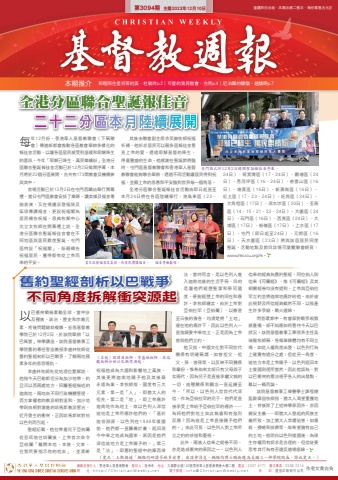 編輯及發行人:香港華人基督教聯會 督印人:陸幸泉 地址:九龍聯合道140號香港華人基督教聯會大樓二樓 電話:2337 4171 圖文傳真:2338 2314網 址:http://ChristianWeekly.net 電子郵箱:[email protected] 承 印:國強印刷制作公司 作者文責自負第3094期 主曆2023年12月10日 逢禮拜日出版.本期出紙二張半.每份零售五元正本期推介 和睦同住是何等的美.杜敏玲p.2∣可愛的漁民教會.方然p.4∣尼泊爾的驕傲.趙煥明p.7舊約聖經剖析以巴戰爭不同角度拆解衝突源起以巴衝突戰禍牽動全球,當中涉及種族、政治、歷史和宗教元素,背後問題錯綜複雜。宏恩基督教學院已於12月2日,於該院舉辦「以巴風雲」神學講座,該院基督教事工學院舊約專任客座教授李盛林牧師從舊約聖經剖析以巴戰爭,了解兩地積累多年的恩怨情仇。李盛林牧師先從地理位置解說,他指今天巴勒斯坦分為加沙地帶、約旦河以西兩處地方,同屬聖經描述的迦南地。兩地由不同行政機關管理,西方掌權者的教派相對溫和,加沙地帶則由相對激進的哈馬斯教派管治,近月發生的衝突,正因哈馬斯欲對抗以色列而引起。聖經記載,他拉帶着兒子亞伯蘭從吾珥前往哈蘭後,上帝首次命令亞伯蘭「離開本地、本族、父家、往我所要指示你的地去」,並清晰法,當時而言,是以色列人進入迦南地後的生活手冊,目的是讓他們經歷聖潔和祭司國度,便能經歷上帝的同在和應許。李牧師續言,由於上帝對亞伯拉罕(亞伯蘭)、以撒甚至日後的雅各,均清楚將「土地」連在祂的應許下,因此以色列人一直強調要中東地土,正是因為上帝曾與他們立約。他又指,中國文化對不同世代關係有明確稱謂,如曾祖父、祖父、孫、曾孫等,以反映不同關係和輩份。惟希伯來文卻只有父母與子女兩代,因為兒子是直接承繼父親的一切,這種關係和觀念一直延續至今,「所以,以色列人世世代代深信,作為亞伯拉罕的兒子,他們是直接承受上帝給予亞伯拉罕的應許……為何他們對地土如此執着和有強烈反應?因為這是上帝直接賜予他們的。」由此可見,以色列人對上帝所立之約的珍惜和重視。此外,兩族人信奉之經卷不同,亦是造成衝突的原因之一。以色列人信奉的經典為舊約聖經,阿拉伯人則信奉《可蘭經》,惟《可蘭經》及其相關經卷均沒有提到,上帝與亞伯拉罕立約並將迦南地應許給他。由於彼此視野及所信經典截然不同,以致產生許多爭拗,戰火連綿。問答環節中,有會眾對戰爭殺戮感憂傷,卻不知應如何看待今天以巴狀況。該院基督教事工學院系主任吳瑞龍牧師稱,各報章媒體均有不同立場,如從人權角度出發,以色列行為上確實有過分之處;但從另一角度,這地方本是上帝賜予,以色列返回本土復國則理所當然。因此他認為,對以巴衝突的看法視乎各人的出發點,難以一概而論。該院基督教事工榮譽學士課程總監歐偉昌牧師指,猶太人渴望重獲地土,背後除了上述神學原因外,亦因錫安主義──即猶太人發起的民族主義所致。加上猶太人常遭迫害,如屠殺、侵略和排擠等,故希望擁有自己的土地。他明白以色列復國後,為保生存權而有訴求是合理的,但信徒要思考其行為有否違反道德底線。每年12月份,香港華人基督教聯會(下稱聯會)傳道部都會推動各區教會舉辦多樣化的報佳音活動,以讓各區居民感受到溫暖和耶穌降生的喜訊。今年「耶穌已降生、萬民樂繽紛」全港分區聯合聖誕報佳音活動已於12月2日揭開序幕,本月將於22個分區展開,合共有173間教會及機構參與其中。首場活動已於12月2日在屯門西鐵站舉行開幕禮,當日屯門區教會安排了樂隊、讚美操及福音粵曲表演,又在場邊派發福袋及氣球傳講福音,更設祝福閣為居民禱告祝福。恩典牧鄰中心沈立文牧師在開幕禮上說,全港分區聯合聖誕報佳音會在不同地區與居民歡度聖誕,屯門區特設「祝福閣」,盼藉禱告祝福居民,獲得都有從上帝而來的平安。其後由聯會副主席余英嶽牧師祝福祈禱,他祈求居民可以藉多區報佳音看見上帝的愛,透過耶穌基督的降生,得着豐盛的生命。他感謝在聖誕節將臨時,屯門區基督教聯會和香港華人基督教聯會能夠聯合舉辦,透過不同活動讓居民得到祝福,並願上帝的恩惠和平安臨到世界每一個角落。全港分區聯合聖誕報佳音活動由即日起直至本月24日將在各區陸續舉行,港島東區(23、24日)、筲箕灣區(17、24日)、觀塘區(24日)、秀茂坪區(16、24日)、慈雲山區(16日)、塘黃區(16日)、新蒲崗區(16日)、紅土區(17、23、24日)、旺角區(24日)、大角咀區(17日)、深水埗區(20日)、荃葵區(14、15、21、23、24日)、大圍區(24日)、石門區(16日)、西貢區(24日)、大埔區(17日)、粉嶺區(17日)、上水區(17日)、屯門(即日起至24日)、元朗區(16日)、天水圍區(23日)將與該區居民同度聖誕,活動地點及節目詳情可瀏覽聯會網頁:www.hkcccu.org.hk。屯門區已於12月2日揭開聖誕報佳音序幕。全港分區聯合聖誕報佳音二十二分區本月陸續展開當日派發福袋及氣球,向居民傳講福音。 福音粵曲獻唱。(左起)歐偉昌牧師、李盛林牧師、吳瑞龍牧師分析以巴衝突源起。(更正:上期報道「鮑維均研讀哥林多前書」座談會消息,鮑維均博士職銜應為美國三一神學院院長,特此更正。)祝福他成為大國和影響地上萬族,其後更將迦南地賜予他及其後裔永遠為業。李牧師指,國度有三大元素,第一是「人」,即猶太人的祖先。第二是「地」,即上帝應許迦南地