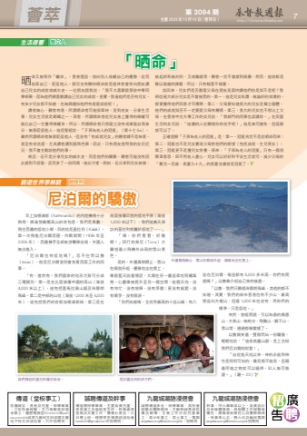 第 3094 期 主曆 2023年 12月 10日(禮拜日) http://ChristianWeekly.net 薈萃 7早上加德滿都(Kathmandu)的內陸機場十分熱鬧,擠滿預備闖高山的背包客。我們是異數,飛往西邊的低地小鄉,目的地是蓋拉利(Kailali)。第一次飛進尼泊爾西陲。內戰期間(1996 年至2006 年),西邊幾乎全部被游擊隊佔領,外國人無法進入。 「 尼 泊 爾 也 有 低 地 嗎?」 忍 不 住 問 以 撒(Issac),他是尼泊爾宣明會負責西面工作的同事。 「有,當然有。我們國家的地形大致可分成三種類別:第一是在北面接壤中國的高山(海拔4,000 米以上),這包括喜馬拉雅山脈及珠穆朗瑪峰。第二是中部的山地(海拔 1,000 米至 4,000米),這包括我們的首都加德滿都城。第三是在「晒命」生活迴響窮遊世界學無窮龔立人趙煥明尼泊爾的驕傲外邊萬物靜止,雪山在眼前升起,優雅地坐在雲上。晒命又被寫作「曬命」,香港俚語,指向別人炫耀自己的優勢,從而抬高自己,貶低他人。跟兒女有關的晒命就是退休者會常向朋友講自己兒女的成就或威水史。一位朋友跟我說,「我不太喜歡跟那些中學同學相聚,因為他們總喜歡講自己兒女的成就。查實,我連他們是否有兒女、有多少兒女都不知道,也無興趣知他們有甚麼成就呢!」講者無心,聽者有意。所謂晒命者可能很單純,見到老友,分享生活事,兒女生活就是範疇之一。再者,所謂晒命者從兒女身上獲得的榮耀可能比自己一生獲得榮耀多。所以,所謂晒命者只想建立沒有或漸退自我身分,無意貶低他人。這是聖經說,「子孫為老人的冠冕」(箴十七 6a)。雖然所謂晒命者無意貶低他人,但沒有「有成就兒女」的聽者總不是味意,甚至有些苦澀,尤其講者講到眉飛色舞。因此,只有朋友查問我的女兒近況,我不會主動說他們的事。相反,若不是分享兒女的威水史,而是他們的艱難,聽者可能沒有因此感到不舒服,反而多了一份同情,彼此守望。例如,若分享到兒女被捕、被起訴和被判刑,又或離婚等,聽者一定不會感到煩厭。然而,這些都是難以啟齒的課題,所以,只有報喜不報憂。說回來,兒女們是否歡喜父母在朋友見面時講他們的是與不是呢?我相信絕大部分兒女是不會接受的。第一,這是兒女私隱,無論好的或壞的,都要獲得他們同意才可傳開。第二,父母要知道長大的兒女是獨立個體,他們的成就與否不一定要跟父母有關係。第三,長大的兒女也不想沾上父母。在香港中文大學工作的女兒說,「我部門的同事也認識你。」在英國生活的女兒說,「這邊的人也聽過你的名字呢!」這是無可避免,但低調就可以了。正確理解「子孫為老人的冠冕」是:第一,冠冕肯定不是從晒命而來;第二,冠冕也不是兒女實現父母對他們的期望(包括成就、生兒育女);第三,冠冕更不是獲兒女供養。原來,「子孫為老人的冠冕」只有一個很簡單意思,即不用老人憂心,兒女可以好好和平安生活就可。減少父母的「養兒一百歲,長憂九十九」的長憂苦慮就是冠冕了。我們探訪的蓋拉利屬於低地。南面接壤印度的低地平原(海拔1,000 米以下)。我們這幾天探訪的蓋拉利就屬於低地了……」「 嘩, 你 們 看 看, 好 靚啊!」同行的東尼(Tony)大聲指着小飛機外出現的雪山景色。 是的,外邊萬物靜止,雪山在眼前升起,優雅地坐在雲上,像跟藍天說着情話,太陽在另一邊溫柔地照耀萬物。心靈像被提升至另一個空間:這個天地,沒有匆忙、沒有喧嘩、沒有爭競;更沒有貧窮、沒有戰爭、沒有眼淚。 「你們知道嗎,全世界最高的十座山峰,有八座在尼泊爾,每座都有 8,000 多米高。你們有爬過嗎?」以撒像介紹自己家的後園。 「以撒,我們只聽過珠穆朗瑪峰,其他的都不知道。其實,我們的城市香港也有不少山,最高那座叫大帽山,但連 1,000 米也沒有,用你們的標準,只是低地。」突然,曾經爬過、引以為傲的鳳凰山、大東山、蚺蛇尖、飛鵝山、獅子山、青山等,通通都像變矮了。 以撒微笑着,雙眼閃出一份驕傲,輕輕地說:「這些美麗山脈,是上主給我們尼泊爾的財富!」 「自從造天地以來,神的永能和神性是明明可知的,雖是眼不能見,但藉着所造之物就可以曉得,叫人無可推諉。」(羅一 20)九龍城潮語浸信會誠聘傳道多名,神學畢業,具牧會經驗及團隊精神。主動熱誠委身牧養及教導。主責工作分別兒童事工、青少年事工、男士事工。電郵[email protected]。招聘用九龍城潮語浸信會幹事,中六畢業或以上,負責設計及多媒體事務,具相關工作經驗者優先,應徵者具責任心及團隊精神,有事奉心志,需六日及輪班電郵[email protected]招聘用誠聘傳道及幹事傳道需神學畢業,主要負責兒童、家長事工及協助堂主任。幹事處理堂務及文書工作,懂會計更佳。六日需上班,繕歷寄荃灣潮語浸信會[email protected]作招聘用。居於蓋拉利的孩子們。傳道(堂校事工)牧養婦女、長者及兒童。神學畢業,三年牧會經驗。主力策劃堂校福音事工。履歷電郵至[email protected]或寄九龍何文田邨適文樓地下何文田浸信會。只作招聘用。