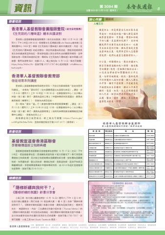 第 3094 期主曆 2023年 12月 10日(禮拜日) http://ChristianWeekly.net 資訊 8香港華人基督教聯會 主席:鍾健楷牧師 副主席:余英嶽牧師 總幹事:陸幸泉牧師 出版部部長:吳思源先生 出版部顧問:翁傳鏗牧師 李志剛牧師 張振華牧師 許朝英先生 胡明添牧師 出版部委員:植栢燊先生 吳業立先生 蘇永權先生 黃文江先生 許立中先生 鄺偉衡牧師 關銳煊先生 梁銘牧師 李鴻標牧師 吳渭濱先生 關鎮威牧師聯會短訊教會短訊香港華人基督教聯會墓園部 華人基督教墳場認可修墳/執骨承造商注意:1. 墳主自行委託承造商承造工程時,由於墓碑式樣及材料不同、手工各異,故不同承造商之收費可能相距甚大,本聯會建議墳主應盡量聯絡多間承造商作比較,以免引起不必要之爭拗,本聯會亦建議墳主於結算餘款給承造商前,先到墳場查看已承造之工程,如有不妥善之處,可直接與有關承造商交涉。2. 所有本聯會轄下華人基督教墳場之修墳⧸執骨等工程均須由上列已登記認可承造商辦理。3. 市面上可能有些公司與本聯會認可承造商名稱或相同,本聯會建議墳主簽約付款前認清公司名稱、電話及地址。4. 所有墓碑建造或修葺等工程,必須依本聯會墳場管理條例規則申請,經批核後方可動工。5. 墳主若有任何疑問,請賜電本聯會職員查詢。聯會總辦事處:2337 4171 華人基督教墳場:(香港)2817 1821 (九龍)2336 0653更新日期:2022-01-01承 造 商 東主姓名 地 址 電 話忠記石廠 余永忠先生 九龍深水埗福華街43號 2728 0840合盛石廠 譚承東先生 九龍紅磡溫思勞街33號地下 2387 8440德安石廠有限公司 陳紫梃女士 香港柴灣連城道240C 9019 2000江聯基石廠 林潔芳女士 香港域多利道大口環村61號 2817 5796�9027 0334張碩記石廠 張經國先生 香港柴灣小西灣曉翠苑雅翠閣3207室 2817 3744�9305 8157百福營造廠 藍金泉先生 九龍慈雲山蒲英里8號慈華大廈五樓 D 座 2327 7324陳諏建築公司 陳希和先生 香港域多利道大口環977號 2817 74059269 8741朱炎記石廠有限公司 陳鎮藩先生 香港德輔道西343號均益商場16B地下 2382 2445朱新記石廠有限公司 朱耀權先生 九龍紅磡馬頭圍道37-39號紅磡廣場二樓B86舖 2395 96789096 1877賴金記石廠有限公司 陳冠生先生 香港域多利道大口環6485地段 2817 3161�9422 1238李煥記雲石公司(梁華) 曾兆祥先生 九龍土瓜灣譚公道82號香港工商銀行大廈地下 2519 7618香港華人基督教聯會廣蔭頤養院(綜合安老服務)《生死前的八種味道》繪本共讀派對香港華人基督教聯會廣蔭頤養院(綜合安老服務)將於 12 月 16 日(禮拜六)下午3時至4時30分,假德慧文化荃灣書店暨Life Reading繪本館(荃灣南豐中心 1908 室)舉辦《生死前的八種味道》繪本共讀派對。內容:從《生死前的八種味道》的起初懸念、採訪到成書出版說起,歷經其他晚期長者生命的最後絮語和惦記,間或穿插個人對生命和失去的觀察和頓悟,並帶領參加者一同尋回味道的記號。導師為《生死前的八種味道》繪本策畫人何婉慧,費用為港幣 $60,名額 20 人,截止報名為 12 月 13 日。報名可瀏覽:https://bit.ly/3N0oc3N,查詢可電 3707-2787 林小姐或電郵:[email protected]。香港華人基督教聯會教育部信徒培育系列講座香港華人基督教聯會教育部將於明年 1 月份分別舉辦兩場「信徒培育系列講座」,首場為「愛伴同行(從夫妻關係建立出基督化家庭)」講座,於1 月 6 日(禮拜六)上午 10 時至 11 時 30 分,在聯會教牧中心(尖沙嘴山林道 1 號 2 樓)舉行,講員為區祥江博士(中國神學研究院莫國治.鄭惠貞教席教授〔輔導科〕),對象為夫婦及信徒。另一場為「愛伴『童』行(教會牧養特殊學習需要羣體)」講座,於 1月 13 日(禮拜六)上午 10 時 30 分至 12 時,在聯會教牧中心(尖沙嘴山林道 1 號 2 樓)舉行,講員為吳靜華博士(伯特利神學院教牧輔導教授及輔導中心總監),對象為任何人士。兩 場 講 座 現 已 接 受 報 名, 網 上 報 名 可 瀏 覽:https://forms.gle/cJt4RjgDfe3Mw7SA6,查詢或電話報名可電 2337-4171(教育部)。基督教宣道會香港區聯會李蓉順傳道按立牧師典禮基督教宣道會香港區聯會及宣道會康怡堂將於 12 月 17 日(主日)下午3 時正,假宣道會康怡堂(香港鰂魚涌基利路 9 號太明樓地下)舉行李蓉順傳道按立牧師典禮。是次按立牧師典禮由張觀運牧師主禮,按牧團為張觀運牧師、朱秀蓮牧師、劉立武牧師、楊靖紀牧師、張偉昌牧師、區伯平牧師及陳麗蟬牧師。李蓉順傳道畢業於中國神學研究院,由 2014 年起於宣道會康怡堂事奉。查詢可電 2516-5123。「隱修祈禱與我何干?」《隱修祈禱的氛圍》新書分享會小島工房、塔冷通心靈書舍將於 12 月 16 日(禮拜六)下午 3 至 5 時, 在塔冷通心靈書舍(窩打老道 20 號金輝大廈 1 樓 6 室)合辦「隱修祈禱與我何干 ?」《隱修祈禱的氛圍》新書分享會,講員為伍維烈修士、楊孝明先生、 堵建偉先生。內容:三位講者分別會介紹牟敦(Thomas Merton)的《隱修祈禱的氛圍》中文版的出版緣起,探討隱修祈禱的發展及當今意義,並分享該書對信徒內在靈性與現世生活的連繫。查詢可電 2782-7027,詳情可瀏覽:小島工房 Islet Studio Facebook 專頁。《基督教週報》廣告則例1. 凡有違基督教信仰或信徒生活原則之廣告概不刊登。2. 私人公告或啟事,須有其所屬教會正式公函證明。3. 訂婚、結婚等廣告,須有教會公函或堂主任證明。4. 教會或機構之公告或啟事,須附有正式公函。5. 本報編輯及編輯業務小組有權審核所