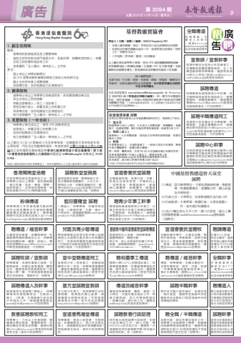 第 3094 期 主曆 2023年 12月 10日(禮拜日) http://ChristianWeekly.net 廣告 9全職幹事中學畢業熟文書軟件及PPT。繕歷[email protected]海怡浸信教會招聘用藍田靈糧堂 誠聘1.傳道人:神學畢業、牧養家長及兒童。2.教會幹事:文書、會計、行政安排。請繕履歷電郵[email protected]只供招聘用誠聘幹事處理日常事務會計電腦中學畢業勤奮盡責繕歷諮詢寄大埔全安路9號大埔醫院院牧部招聘用誠聘牧師/宣教師神學畢業,承擔牧養事工發展,主動敢創新,回應社會善溝通,團隊合作。履歷寄新界葵涌華荔徑11號基真小學一樓,中華基督教會基真堂主任牧師收,電郵亦可,招聘用聘傳道/福音幹事大圍區堂校教會,具團隊精神、牧養教導恩賜和傳福音心志,神學畢業或相關訓練。履歷、諮詢人、蒙召見證電郵[email protected]中華宣道會豐盛堂。只招聘用全職傳道神學畢業,牧養成人及青年。繕歷[email protected]海怡浸信教會招聘用宣教師/宣教幹事拓展中學及社區青少年宣教事工,牧養職青群體具團隊精神,全/半職宣教師需神學畢業。履歷寄葵涌大窩口上角街1號或[email protected]亞斯理堂招聘用誠聘半職傳道同工負責青少年牧養及主日學教導。神學畢業、主動及重團隊合作。繕履歷及蒙召見證至[email protected]或寄新蒲崗寶光商業中心101室宣道會真道堂。只作招聘用誠聘傳道神學畢業負責開展青少年牧養,須主動熱誠具創意有領組能力。重團隊精神,相關經驗優先。請繕履歷電郵[email protected]九龍塘浸信會執事會收(只供招聘用) 誠聘半職幹事熟中英文輸入軟件操作,負責任感,週日當值,履歷寄宣道會坪洲堂離島坪洲永興街23號宣道會坪洲堂梁傳道招聘用 誠聘中心幹事向家庭傳福音策劃推展活動帶小組中學畢業主動成熟並熟電腦操作繕履歷附得救見証教牧推薦信薪酬要求電郵[email protected]白田浸信會愛鄰中心梅生收只招聘用聘傳道人獨立教會牧養兒青少具牧會經驗優先主動願配搭履歷長洲大石口西灣路1號永光會堂招聘用誠聘教堂堂務員處理堂務及借場,簡單維修工作,具水電維修經驗優先,六天工作,需週日上班,全職或兼職均可。履歷[email protected]或致電26999655聖公會靈風堂鄧小姐。招聘用聘請傳道牧養50人堂會,附設功輔班,履歷寄馬鞍山耀安邨耀頌樓地下G003耀頌堂人事招聘用香港閩南堂急聘本堂急聘牧師及宣教師各乙名,具神學學士或以上學歷,富牧會經驗,專注牧養、培育、傳道、關懷、發展等事工,並帶領各類聚會,有意者請電28932242聯絡蕭牧師。宣道會愛民堂誠聘全職教會幹事,負責行政、文書、財務及自修室管理。中學或以上,成熟委身,熟電腦操作,處事細心重團隊,經驗優先。繕履歷[email protected]高牧師收招聘用宣道會愛民堂聘牧全職牧養中學生、大專至初職、開拓外展佈道。神學畢業,成熟主動有活力,委身佈道重團隊,具牧養、佈道、教導恩賜及經驗優先。履歷至[email protected]招聘用聘青少年事工幹事專責協助教會發展青少年事工,大專及曾受青少年事工神學訓練優先,主動熱誠,有領導能力。請繕履歷電郵至[email protected]元朗基信會基立堂收(只招聘用)聘傳道/福音幹事傳道:神學畢業,全職半職皆可,主責牧養家庭、婦女、兒童。幹事:中學畢業協助教會福音事工,會計文書事務。繕歷[email protected]協基會錫安堂招聘用兒區及青少區傳道聘神學畢業且有意在駐中學小組教會建立及發展兒童及青少年群體的同工。有意請寄履歷至觀塘翠屏道102號新生命教育協會新生命福音堂招聘小組收(只供招聘用)宣中堂聘傳道同工負責青少年/長者事工,經驗喜接觸青少年/長者。神學畢業重團隊,講道牧養傳福音恩賜。履歷蒙召得救見證九龍城富寧街二號宣中堂周生[email protected]招聘用聘校園事工傳道國際小學CAPCL校園福音事工;神學畢業重團隊,牧養教導傳福音恩賜,通中英文,英語流利。履歷蒙召見證九龍城富寧街二號宣中堂周生[email protected]招聘用1. 副主任院牧 職責 : - 督導院牧服務發展及員工關懷策略- 協助主任院牧制定部門發展方向、長遠目標、統籌病室的病人、家屬及員工的牧關和福音等工作- 宣揚醫院「全人醫治、榮神益人」之宗旨要求 : - 碩士或以上神學訓練學位- 具 CPE 督導或教牧輔導訓練或已被按立為牧師尤佳- 最少五年院牧事工相關經驗- 具領導才能、良好組織能力及溝通技巧2. 資深院牧 - 道學碩士或以上神學學位或檢證院牧,具牧關督導訓練尤佳- 具五年或以上院牧經驗- 策劃及督導病人 / 員工 / 培訓事工- 管理及執行病人、家屬及員工的牧關工作- 具領導才能、良好組織能力及溝通技巧- 致力宣揚醫院「全人醫治、榮神益人」之宗旨3. 見習院牧(一年合約) - 神學學士學位或以上,曾受 CPE 訓練者更佳- 負責病人、家屬及員工的牧關工作- 具良好組織能力及溝通技巧- 致力宣揚醫院「全人醫治、榮神益人」之宗旨以上職位 (2) 至 (3) 需輪班工作及穿著制服。全職僱員可享有有薪年假、公眾假期、門診及住院醫療等福利。有意者請於二零二三年十二月二十四日或之前附履歷及聯絡電話寄香港九龍灣常悅道 9 號企業廣場 1 期 2 座18 樓香港浸信會醫院人力資源部或電郵至 [email protected] 或傳真至 2339 5769。申請人提供的資料只用於招聘事宜上,所有未獲聘用人士之個人資料將於六個月內被銷毀。基督教靈實協會傳道人 ( 全職 / 兼職 ) ( 編號:RSD/Chaplain/W)• 有個人靈命關顧、探