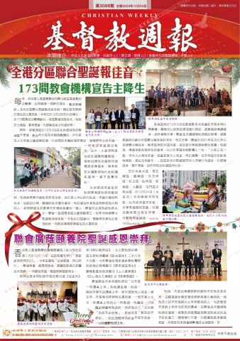 曰罕醞糧173間教會機櫃宣告主讎户年 , 香港華人基督教聯會均聯合各區基督教會 母及機構 , 共同舉辦 「耶穌已 降生 , 萬民樂繽紛」全港分區聯合聖誕報佳音活動 , 藉此宣告耶穌已降生的大喜訊息。今年已於12月2日至24日舉行 ,共173間教會及機構參與 , 各區教會活動多元 , 包括巴士巡遊、嘉年華會、街頭報佳音及佈道會等。將軍澳區嘉年華會揭謠。其中 , 將軍澳區於12月3日在生命頌浸信 會舉 聯會主席鍾健楷牧師(右三)與荃葵區參與堂辦嘉年華會 , 教會內外設有多個遊戲攤位 , 戶外更 會代表合照 。荃葵區則於12月9日在 基督教香港信義會天恩堂舉行開幕禮 , 隨後分批到附近屋邨進行探訪 , 派發福袋傳講福音 , 並作事後分享。聯會主席鍾健楷牧師親赴現場 , 頒發感謝狀與參與分區聯合報佳音的堂會。他又分享 , 聯會於2001年在文化中心首辦聯合報佳音 , 後來延伸成分區佈道 ,目的是分享資源助教會推廣。他認為 , 傳福音使命是終生的事奉 ,與人分享福音能影響人—生 , 「大家走在—起 , 不 分大小規模堂會 , 最重要是令人信主 ,得到激勵 , 在不同區分有創意地推動 , 彼此互相參考。」該區堂會於 聖誕期間分七天舉行佈道會、街頭報佳音、嘉年華會 , 以不同形式祝福區內街坊。有大型充氣兒童遊樂設施 , 街坊間扶老攜幼前來聚會 ,現場擠得水泄不通 ,—同 享受聖 誕節日氣氛。此外 , 大會亦特意加設祝福閣和攝影區 ,前者以禱告祝福和向現場居民傳福音 , 後者則安排攝影師為街坊拍攝家庭照 , 留下溫馨時刻。生命頌浸信 會主任弟兄姊妹旅街頭報佳音 , 向市民宣告主降生的喜訊 。牧師陳潮源牧師致歡迎詞 , 他指世界無可避免愈來愈冷淡 , 但只要人內心 的火旺盛 ,不論外面如何冰冷 , 也能以火熱、積極的目光看待事物。他祝福出席者為主耶穌成為火熱的人 , 將耶穌誕生的喜樂平安傳給身邊每— 個人。聯會代表馮為彰牧師表示,聯會—直凝聚各區力量推動聖工,每年均舉辦聯合聖誕報佳音活動 , 今年共22 區參與 , 聚集所有單位及弟兄姊妹 , 向居民傳揚耶穌誕生的大喜訊息。至 於港島東區、筲箕灣區、觀塘區、秀茂坪區、紅土區、旺角區、荃葵區、 大圍區、屯門區及西貢區 , 於12月24日(本主日)分別舉辦不同活動 ,與市民同度平安夜 ,分享聖誕節的真義。有關活 動地點及節目詳情 ,可瀏覽聯會網頁: WWW.hkcccu.org.hk。耒港華人基督教聯會廣蔭頤養院(綜合安老服曰務)已於12月11日 , 在 該院禮堂舉行 「聖誕咸恩崇拜2023 」 , 今年主題為 「結連基督.同心同行」 , 聯會執董、慈惠部委員、頤養院長者及家屬出席崇拜 ,—同歡度聖誕 ,歌頌耶穌基督降生。和《神與我同在》、石志堅牧師祈禱丶區玉君牧師讀經《路加福音》二章八至十四節。今年聯會 會員堂退休教牧團契詩班親赴現場獻唱《齊來頌主降生》 ,廣蔭長輩詩班亦獻唱《古人喜樂歌》丶崇拜由黃承香 牧師帶領會眾唱頌 《在主內》 《到山嶺上去傳揚》及《快樂聖誕》。將軍澳區設置充氣兒童遊樂設施,吸引不少區內孩童到場玩樂。咢主" ` 聯會副主席余英嶽牧師以 「與天使—成恩崇拜主禮嘉賓。 > 同讚美上帝 」為短講主題。他指 ,唱詩不 單可以讚美上帝 , 更可咸動他人信主。經文中 , 天使報告耶穌降生 喜訊後 ,—班天軍大合唱 , 存讚美上帝的 心 —同歌頌。他續言 , 唱詩應以榮耀神 為目的 , 而非為自己 , 又引用 'fn3P』尸\[二二二二二/ :磁俠', —切榮耀都應歸上帝。他指 , 天使 以傳遞耶穌的愛和平安為首要任務 , 提醒基督徒應要學效耶穌用愛化解怨仇 , 因為真正的平安是歸與上帝所喜悅的人 , 也要學習天使對上帝作出真實的讚美。在 聯會主席鍾健楷牧師祝福後 , 慈惠部部長關鋭煊教授致送紀念品予多位義工。隨後舉行午宴 ,與頤養院長者歡度聖誕 , 席間更有老頑童樂隊擔任表演嘉賓。「圈吉湛華人基督教聯會 編輯及發行人香港華人基督教聯會督印人陸幸泉地址九龍聯合道140號香港華人基督教聯會大樓二樓電話 2337 4171 圖文傳真 2338 2314THE HO關KONGCHriESE CHRISTIAN CHURCHES UNION網 址http://ChristianWeekly.net 電子郵箱in fo@ChristianWeek丨y.net 承 印匭強印刷制作公司 作者文責自負Christian Weekly 户年 母及機構基督教週報173間教會機櫃宣告主讎 Christian Weekly 曰罕醞糧173間教會機櫃宣告主讎基督教週報 Christian Weekly 基督教週報 Christian WeeklyChristian Weekly 弟兄姊妹旅街頭報佳音 基督教週報 Christian Weekly 基督教週報同 享受聖氛。此外Christian Weekly 席鍾健楷牧師(右三)與荃葵區參與堂現場擠得水泄不通受聖基督教週報 Christian Weekly 基督教週報 Christian Weekly基督教週報咢Christian Weekly 結連基督.同心同聯會執董、慈惠部委員、頤養院長者及家屬同歡度聖誕由黃承香基督教週報廣蔭頤養院(綜合安老服院禮堂舉行 「結連基督.同心同Christian Weekly 基督教週報地點及節目詳情可瀏覽聯會網頁:hkcccu.org.hkChristian Weekly 誕節的真義。有關地點及節目詳情基督教週報 Christian Weekly 基督教週報基督教週報督印人tianWeeChristian Weekly 』尸\[二二二二二/切榮耀都應歸上帝印人陸幸泉anWee基督教週報班天軍大合唱詩而非為自己 , 又引用 』尸\[二二二二二/ 而非為自己 ,基督教週報 Christian Weekly 他指 , 天使務 , 提醒基督徒應要學效耶穌用愛化解怨仇基督教週報 Christian Weekly