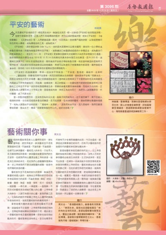 第 3096 期 主曆 2023年 12月 24日(禮拜日) http://ChristianWeekly.net5今天是慶祝平安夜的日子,相信男女老少,無論信主與否,都一定聽過《平安夜》這首聖誕詩歌。這歌引發筆者思考,正當人們不再唱傳統的聖詩,然而經典的聖誕詩歌,就如《平安夜》、《普世歡騰》、《天使佳音》等,人們總會認識一兩首。如何寫出一首家傳戶曉的詩歌,以致經歷幾百年仍然有人傳頌,成為傳福音的工具,成為經典?《平安夜》,源於德語詩歌 Stille Nacht,由約瑟夫莫爾神父以德文編寫,奧地利一位小學校長格魯貝爾作曲(附圖為格魯貝爾校長手稿)。這歌據說已被翻譯成超過四十多種語言,成為最流行的聖誕歌曲之一,甚至在 2011 年,《平安夜》更被聯合國教科文組織列入為世界非物質文化遺產。這首頌歌的首次獻呈是在 1818 年 12 月 24 日的奧地利奧本多夫聖尼古拉教堂,距今 205 年。莫爾神父其實早於 1816 年就寫起歌詞,兩年後的平安夜才帶給格魯貝爾。有說當時教堂的管風琴正等待維修,因此請求校長為這歌詞以結他編曲,希望可以為當年子夜彌撒創作新頌歌。雖然後經多番修改,現存的 1820 年版本就保存於薩爾茲堡的博物館內。《平安夜》的曲調韻律,帶來一份安詳平和氣氛:「平安夜,聖善夜,萬暗中,光華射⋯⋯。」讓唱頌者、聆聽者同得平安康泰。然而回想耶穌出生的情景,當刻真有平安嗎?耶穌出生,因客店沒有地方而生於馬槽,繼之因要避過追殺令(當時統治者希律王下令要將伯利恆及其周圍境內兩歲以下所有男嬰殺死)而逃難。這樣說來,真正的聖誕—在慶祝歷代期望的耶穌基督終於降臨地上之時並不平安!試回想祂整個傳道生命,耶穌的身邊其實常滿佈殺機,而祂出生的目的,正是要為眾人罪孽而背上十字架之路。基督道成肉身,來世正為走向死亡,為拯救人類脫離罪惡,代付贖價,成了代罪羔羊。當一首聖詩經歷百年,並沒有因為年日久遠,曲風不同而被淘汰。在千錘百鍊下,剩下仍被人唱頌的詩歌,往往就是經過多重信仰驗證,是可信真實、值得傳頌的藝術。猶如耶穌在動盪的境遇下,祂為人類發出平安的訊號:「萬暗中,光華射」。當我們失去平安,落入黑暗時,我們仍願意學效耶穌,發出光芒,傳頌「耶穌要降臨在你心內」這好消息嗎?第 3096 期 主曆 2023年 12月 24日(禮拜日) http://ChristianWeekly.net5天是慶祝平安夜的日子,相信男女老少,無論信主與否,都一定聽過《平安夜》這首聖誕詩歌。這歌引發筆者思考,正當人們不再唱傳統的聖詩,然而經典的聖誕詩歌,就如《平安夜》、《普世歡騰》、《天使佳音》等,人們總會認識一兩首。如何寫出一首家傳戶曉的詩歌,以致經歷幾百acht,由約瑟夫莫爾神父以德文編寫,奧地利一位小學校長格魯貝爾作曲(附圖為格魯貝爾校長手稿)。這歌據說已被翻譯成超過四十多種語言,成為最流行的聖誕歌曲之一,甚至在 2011 年,《平安夜》更被聯合國教科文組織列入為世界非物質文化遺產。這首頌歌的首次獻呈是在 1818 年 12 月 24 日的奧地利奧本多夫聖尼古拉教堂,距今 205 年。莫爾神父其實早於 1816 年就寫起歌詞,兩年後的平安夜才帶給格魯貝爾。有說當時教堂的管風琴正等待維修,因此請求校長為這歌詞以結他編曲,希望可以為當年子夜彌撒創作新頌歌。雖然後經多《平安夜》的曲調韻律,帶來一份安詳平和氣氛:「平安夜,聖善夜,萬暗中,光華射藝術的終極效果是使人心靈得到提升,使社會和諧,使世界進步。參與藝術並不是有閒階級的玩意,不論貧富,不論年齡,不論資歷,也都可以參與藝術。藝術是人的本性,只在乎人是否願意開拓和發展!參與藝術能豐富我們的生活姿彩,也使我們的心靈漾溢着上帝的美善。這是與生俱來的本性,是從我們心底醞釀和發揮出來。求上帝使我們不要消滅聖靈的感動,能善待祂所賜的美善的靈。藝術創作並不是無的放矢的發揮,無論是商業藝術或個人創作,能夠站立得穩的都是藝術創作者認真努力的成果。不論是歌曲、舞蹈、詩詞、繪畫、雕塑、陶瓷、裝置、電影、照片,抑或是一道廚藝、一串花裁、一棟建築、一套服飾,不同形式的藝術表現總能打動人的心靈。上帝有偉大的創作,人類可有偉大的心靈。當我們推己及人,在無私的創作中彰顯上帝在人心靈中的無偽和善良的本性,這就是藝術創作的最高境界!筆者這樣大膽的表達只是相信藝術不分貴賤,談論福音不分資歷。上帝使用願意親近祂的人,並興起和連結聽命及順服的子民,藉此建立一群藝術創作者及藝術觀眾羣!即使在這世局紛亂的年代,藝術發展從沒有停止。昔日在戰爭年代曾有不少音樂和繪畫的出現;今天在瘟疫、經濟低迷及戰事頻仍的年代,仍有不少藝術創作把這個年代的藝術家任務勾劃出來。基督徒藝術家就是最好的代言人,以上帝恩賜的技能來回饋上帝創造的奇妙。沒有人可肯定參與藝術必能使生命昇華,生活多姿多彩,甚至可以致富;但總有一些參與能令你對世情有更多的發現和體現上帝的同在。藝術的奧祕在於主觀與客觀之間,也在於感性和理性的融合。能夠有主觀的創作及有客觀的欣賞,使這兩組的羣眾走在一起,確實是一種美善。有感性的創作者吸引了理性的買家和策展人是一種和諧!能夠激活藝術家的不斷創作,挑動觀賞者的心靈世界泛起漣漪,可以營造全民參與的藝術氛圍,令社會更融洽,到處建立了美好的人倫關係,這必定是上帝喜悅的。所以藝術一