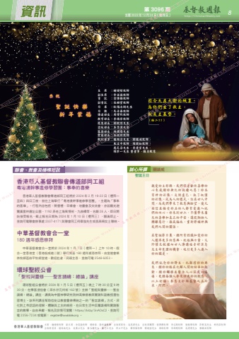 第 3096 期主曆 2023年 12月 24日(禮拜日) http://ChristianWeekly.net 資訊 8香港華人基督教聯會 主席:鍾健楷牧師 副主席:余英嶽牧師 總幹事:陸幸泉牧師 出版部部長:吳思源先生 出版部顧問:翁傳鏗牧師 李志剛牧師 張振華牧師 許朝英先生 胡明添牧師 出版部委員:植栢燊先生 吳業立先生 蘇永權先生 黃文江先生 許立中先生 鄺偉衡牧師 關銳煊先生 梁銘牧師 李鴻標牧師 吳渭濱先生 關鎮威牧師香港華人基督教聯會傳道部同工組粵港澳幹事進修學習團:事奉的喜樂香港華人基督教聯會傳道部同工組將於 2024 年 2 月 19-22 日(禮拜一至四)四日三夜,前往上海舉行「粵港澳幹事進修學習團」,主題為「事奉的喜樂」。行程內容包括:開營禮、早禱會、培靈會及交流會,亦設觀光遊覽廣富林遺址公園、1192 弄老上海風情街、九曲橋等。名額 28 人,即日開始接受報名,截止報名日期為 2024 年 1 月 10 日(禮拜三),額滿即止。查詢可電聯會辦事處 2337-4171 與聯會同工何偉強先生或張燕珊女士聯絡。中華基督教會合一堂180 週年感恩崇拜中華基督教會合一堂將於 2024 年 1 月 1 日(禮拜一)上午 10 時,假合一堂香港堂(香港般咸道二號)舉行開基 180 週年感恩崇拜,由宣道會榮休牧師區伯平牧師宣道。歡迎赴會,同頌主恩,查詢可電 2548-6053。環球聖經公會「聖經與靈修──聖言誦禱:總論」講座環球聖經公會將於 2024 年 1 月 5 日(禮拜五)晚上 7 時 30 分至 9 時30 分,在學基浸信會(深水埗元州街 162 號)主辦「聖經與靈修──聖言誦禱:總論」講座,講員為中國神學研究院林高傑德教席實踐科副教授潘怡蓉博士。該系列講座幫助信徒以教會靈修傳統之一的「聖言誦禱」方式,深化對上帝話語的理解,體驗與上主的親密,在日常生活中反覆誦禱和實踐聖言的教導。自由奉獻,報名及詳情可瀏覽:https://bit.ly/3nAOsC2,查詢可電 2356-7234 或電郵: [email protected] 。誠心所願 關鎮威親愛的主耶穌,我們懷着歡欣喜樂的心來感謝祢無比的救贖之恩!祢本有神的形像,反倒虛己,取了奴僕的形像,成為人的樣式,住在世人中間,為我們帶來了救恩與盼望,使凡相信並接受祢名的人都有愛進入他們的內心。祢來到世上,不僅帶來屬天的喜樂和真正的平安,還能夠助人轉離惡行,徹底悔改,重新修補神與我們之間的關係。在聖誕節日裏,願所有認識和愛祢的人獲得更多的恩典、祝福與力量,又珍惜及把握向世人傳講福音好消息及生命見證的機會,吸引更多人進入祢的國度。我們記念祢的降生,也期待祢的再來,願祢的臨在化解人間的紛爭和敵對,願祢觸摸並醫治人心深處的傷痛,更願每個人都來回應祢的救恩。以上祈禱,奉恩主耶穌基督之名而求,阿們。聯會、教會及機構短訊 誠心所願聖誕主日主 席 :鍾健楷牧師副主席 :余英嶽牧師書 記 :翁傳鏗牧師副書記 :張樹萱牧師司 庫 :歐陽志剛先生司 數 :馬景泰牧師傳道部長:周寶熙牧師 教育部長:李德榮牧師慈惠部長:關銳煊先生 出版部長:吳思源先生墓園部長:陳國煌先生會籍部長:張啟明牧師執行董事:植栢燊先生、關鎮威牧師、 朱活平牧師、陳鏡如牧師、 龐元燊先生、李慶堂先生、 陳崇一先生 暨董事、職員致意恭 祝聖誕快樂新年蒙福因今天在大衞的城裏、為你們生了救主、就是主基督。(路二11)Christian Weekly 基督教週報 Christian Weekly 基督教週報 Christian Weekly 基督教週報主曆 2023年 12月 24日 Christian Weekly第 3096 期(禮拜日)Christian Weekly 粵港澳幹事進修學習團:事奉的喜樂 基督教週報香港華人基督教聯會傳道部同工組粵港澳幹事進修學習團:事奉的喜樂Christian Weekly 聯會、教會及機構短訊基督教週報 朱活平牧師、陳鏡如牧師、 Christian Weekly 慈惠部長:關銳煊先生 出版部長:吳思源先生墓園部長:陳國煌先生會籍部長:張啟明牧師執行董事:植栢燊先生、關鎮威牧師、 朱活平牧師、陳鏡如牧師、基督教週報為你們生了救主、就是主基督。Christian Weekly 因今天在大衞的城裏、為你們生了救主、基督教週報 Christian Weekly 基督教週報 Christian Weekly 休牧師區伯平牧師宣道。歡迎赴會,同頌主恩,查詢可電 2548-6053。環球聖經公會「聖經與靈修──聖言誦禱:總論」講座基督教週報中華基督教會合一堂將於 2024 年 1 月 1 日(禮拜一)上午 10 時,假合一堂香港堂(香港般咸道二號)舉行開基 180 週年感恩崇拜,由宣道會榮休牧師區伯平牧師宣道。歡迎赴會,同頌主恩,查詢可電 2548-6053。Christian Weekly 中華基督教會合一堂將於 2024 年 1 月 1 日(禮拜一)上午 10 時,假基督教週報 Christian Weekly 心來感謝祢無比的救贖之恩!祢本有神的形像,反倒虛己,取了奴僕的形像,成為人的樣式,住在世人中間,為我們帶來了救恩與盼望,使凡相信並接受祢名的人都有愛進入他基督教週報親愛的主耶穌,我們懷着歡欣喜樂的心來感謝祢無比的救贖之恩!祢本Christian Weekly 基督教週報基督教週報出版部委員:植栢燊先生 吳業立先生 蘇永權先生 黃文江先生 許立中先生 鄺偉衡牧師 關銳煊先生 梁銘牧師 李鴻標牧師 吳渭濱先 Christian Weekly 主席:鍾健楷牧師 副主席:余英嶽牧師 總幹事:陸幸泉牧師 出版部部長:吳思源先生 出版部顧問:翁傳鏗牧師 李志剛牧師 張振華牧基督教週報 Christian Weekly 痛,更願每個人都來回應祢的救恩。以上祈禱,奉恩主耶穌基督之名而基督教週報來,願祢的臨在化解人間的紛爭和敵對,願祢觸摸並醫治人心深處的傷痛,更