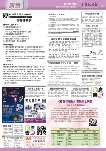 第 3097 期 主曆 2023年 12月 31日(禮拜日) http://ChristianWeekly.net 廣告 10歡欣僱傭嚴格挑選菲印傭工適合不同家庭需要提供專業顧問服務經驗豐富服務真誠查詢21558177新新工程承接水電油漆泥水各項裝修工程取價公道歡迎教會及主內肢體電90819077免費報價陳弟兄誠聘總幹事總幹事入職條件:1. 牧師或信徒領袖均可;2. 神學學位及大學學位;3. 十年以上之牧會或教會聯合事工經驗;4. 熟識本聯會之組織與事工;5. 具行政、財務及人事管理之經驗;6. 能獨立處理一切中英文書信及文件;7. 能操流利粵語、普通話及英語。總幹事職責:1. 遵照本聯會會章所定之宗旨,推動及執行本聯會會議決定,處理本聯會一切事工,審定聯會發出之一切書信文件。2. 領導及督導本聯會屬下受薪員工,有效履行其職責及推動會務。3. 須出席本聯會會議及活動,或須代表聯會出席機構及堂會重要慶典,即使不在例常辦公時間之內,仍應屬其工作職責及工作時間。應徵辦法:應徵者請親繕申請函,附履歷及期望待遇,並撰寫一篇不多於2000字文章,表達對香港華人基督教聯會未來發展及抱負;連同諮詢人等資料,於二零二四年一月十五日前,寄九龍聯合道一百四十號香港華人基督教聯會大樓,香港華人基督教聯會主席親啟,信封請註明〔應徵總幹事〕,合則約見。所有應徵函,均予保密處理。倘於二零二四年二月二十九日前仍未予約見者,則其申請視作不被接納論。(資料只作招聘用)《基督教週報》增設網上廣告(2024 年 1 月開始實施)香港華人基督教聯會出版之《基督教週報》,自創刊迄今,一貫以宣揚基督真理;報道教會消息;交流聖工經驗為宗旨,服侍教會及信徒,擴展文字事工,向來深得各方支持,殊深感謝。邁向明年六十鑽禧報慶,週報將繼續努力成為各宗派教會、信徒之間的橋梁,傳揚福音,分享靈糧,在主裏同得造就。現徇眾要求於 2024 年 1 月開始,在週報網頁新增廣告篇幅,凡在週報印刷版刊登廣告,可於同期上載週報網頁平台,以廣宣傳之效。刊登廣告詳情及優惠,可瀏覽:www.christianweekly.net廣告類別(印刷版及網頁版同期刊登)類別 呎吋(高 X 闊) 黑白 彩色① 分類小廣告 甲類 100.00 (不適用)② 分類小廣告 乙類 200.00 (不適用)③ 普通廣告 每格吋 130.00 182.00④ 頭版 兩格 x9 吋 3,211.00 4,495.40基督教中國佈道會感恩堂誠聘傳道葵涌區約50人堂會。須神學畢業,重團隊精神,積極主動。對少年、成人及長者的牧養工作有負擔。請繕履歷電郵︰[email protected]。 「招聘用」誠聘主任牧師認同浸信會信仰和體制,有8年以上牧會經驗,負責領導本會同工、具行政管理、牧養、聖工策劃和執行力。有意應徵者,請繕履歷,蒙召見證及兩位諮詢人資料,郵寄九龍慈雲山毓華里22號嘉喜大廈二樓,博愛潮語浸信會「主任牧師招聘小組」收,或電郵至 [email protected],註明「主任牧師招聘」。資料只供招聘用途。招聘用招聘用尖沙嘴浸信會誠聘1. 會計幹事具大專或以上程度、會計學證書,熟識中英文文書、辦公室電腦軟件操作及MYOB 等。需處理全盤會計賬目、其他辦公室事務及督導事務員,具兩年或以上相關工作經驗優先。2. 行政幹事具中學畢業或以上程度,熟識辦公室電腦軟件操作等,協助教會日常辦公室事務、中/英文文書處理、投影片設計、活動統籌及聯絡等。申請者需勤奮、有責任心、具團隊精神、善與人溝通及主動積極.。以上職位,每週工作5.5天,每天8小時工作,須週六及主日工作、享有年假、房屋津貼及醫療福利。請繕寫履歷郵寄至尖沙嘴金馬倫道31號或電郵[email protected]總幹事收,個人資料只供招聘用。陳昭廷按牧典禮2024年1月7日下午3時舉行,由羅文麒牧師、馮耀榮牧師、李景棠牧師、周力榮牧師、戴金蓮牧師及林漢星牧師擔任按牧團。有意參加者可電24077067澤安福音堂查詢。誠聘自修室半職幹事助理 協助管理本會轄下油塘自修室日常運作,揉合基督教信仰於自修室服務中,為區內青少年人 提供服務,須輪班,每週工作 22 小時,合約制, 享年假、醫療及進修津貼等福利。 認同本會宗旨及使命,中學畢業或以上教育程度,中英文良好。擅長與青少年建立關係、主動、具組織力及良好溝通技巧。 有意者請於 2024年1月15日或前致函附履歷、期望薪酬及諮詢人資料,寄九龍亞皆老街123號神召會禮拜堂人力資源部收或電郵到 [email protected]。(申請人的個人資料只作 招聘用途)店務員(突破書廊)⚫ 負責書店日常運作,保持店面整潔⚫ 由貨品上下架、貨品介紹,到收銀入單,全面銷售及顧客服務⚫ 協助網店包裝出貨⚫ 對閱讀和文化活動有興趣的人士⚫ 有書店經驗優先⚫ 友善、守時、有責任心、具團隊精神其他空缺及詳情可參見突破機構網頁(www.breakthrough.org.hk)請將履歷電郵至 [email protected] 人才資源部誠聘堂主任及傳道堂主任須具五年牧養經驗,有行政經驗為佳;傳道人須神學畢業。以團隊服事、牧養青少年、成人、家庭及輔導。履歷寄[email protected]中華宣道會天耀堂招聘用基督教癌聯聘幹事中學畢業,有事奉心志,有教會文職經驗,懂電腦文書簡報等,重視團隊合作,協助總幹事。每周五天半工作,請繕履歷電郵至[email protected](只供招聘用)聘請事工發展幹事神學、臨床牧關教育訓練,大專程度,有獨立思考。成熟、委身、熱誠、創意、接受挑戰。請繕履歷電郵至[email protected]基督教癌症關懷事工聯會(只作招聘用)Christian Weekly 總幹事